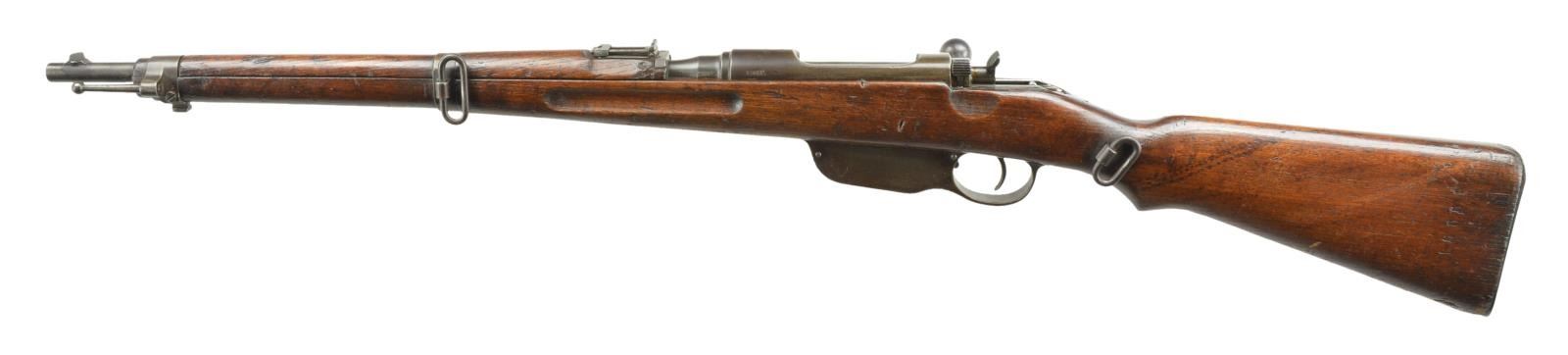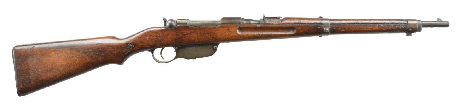 CARBINE. Cal. 8x50R. S# 1565F. Bbl. 19.5" w/ partially visible Vienna 1917 proofs. Integral ramp blade front sight & 24400 shritt ladder rear sight. Matching numbered bbl. & 2 piece wood stock appearing laminate. Stock has stacking bar, bayonet lug, side sling bar, side sling at wrist & buttplate stamped "8" at peak. CONDITION: good overall as arsenal refinished over prior pitting w/ moderate handling marks & fading finish. Good metal turning brown w/ prior pitting mostly evident on mag body. Good wood finish w/ deep gouges & chips of wood around buttplate. Lg. crack from top tang through wrist to sling swivel. Good bore w/ strong rifling. (22-618/MD). CURIO. $300-500.