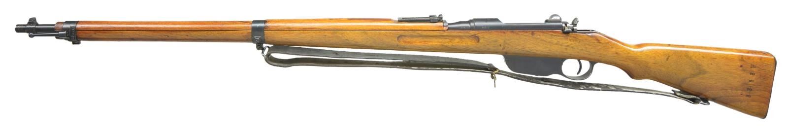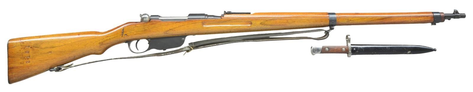 Cal. 8x56R. S #7572W. Bbl. 30". All visible matching numbers as arsenal refurbished. Bbl. marked w/ "Wn eagle 1917" Austrian acceptance stamp & "S" stamp for update to 8x56. This rifle appears to be a Bulgarian rework. Rear sight graduated to 2600 meters. Inverted V front sight. Stacking hook & bayonet lug are present. Bottom mounted sling swivels w/ black leather sling that shows scattered white staining. Hardwood stock set. UNATTACHED ACCESSORIES: M95 bayonet and scabbard. Blade is marked "OEWG" for Steyr & crossguard is stamped numbered "346". Metal parts of bayonet show a few spots of light pitting & oxidation staining. The hardwood grip panels show light handling wear. The scabbard shows scattered light flaking. CONDITION: hardwood stock has arsenal rework finish w/ 2" grain crack on left side of butt, scattered dings, scratches and handling marks. Metal retains 95% arsenal rework blue w/ some blued over pitting on buttplate. Very good bright bore. Safety is not functioning properly & may require mechanical attention. (22-2559/MJC). CURIO. $100-200.