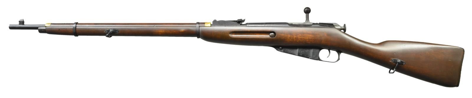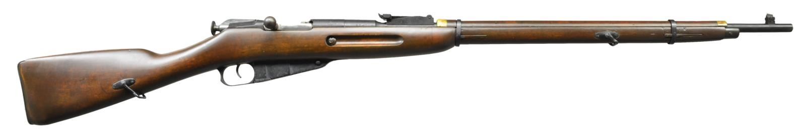 RIFLE. Cal. 7.62x54R. S# 4941. Bbl. 29". Mismatched numbers throughout. Top of bbl. marked w/ Izhevsk logo, 1936 date, S# & Finnish "D" marking. Left side of bbl. marked w/ boxed "SA" Finnish army marking. Bbl. has hole behind rear sight for deactivation. Right side of Bbl. marked w/ "41" Finnish capture marking. Right side of receiver has a rhombus symbol w/ what appears to read "RMA 10" in the center. Tangent rear sight graduated to 2000 meters. Finnish inverted V blade front sight w/out protective hood. Finnish replacement stock w/ finger joint under rear sight. Right side of stock has Finnish arrow cartouche. No cleaning rod present. Bottom mounted Finnish sling slots. CONDITION: stock has added finish w/ a few scattered dings & handling marks. Bolt shows scattered oxidation most notably on cocking piece & handle. Balance of metal retains 80% Finnish arsenal reworked blue w/ some dings on buttplate, scattered light oxidation & thinning. Bore intentionally plugged to prevent cartridge entering chamber. (22-3767/MJC). CURIO. $100-200.