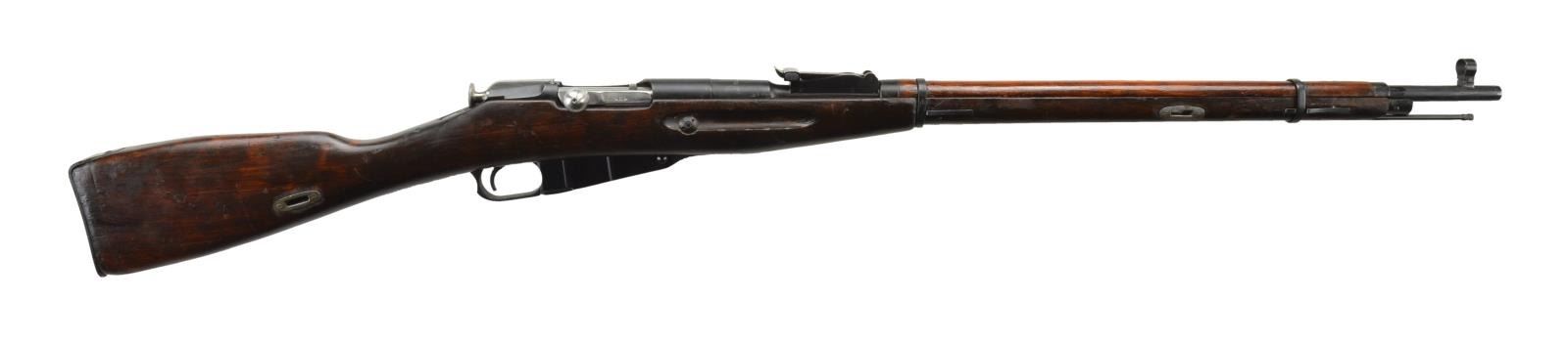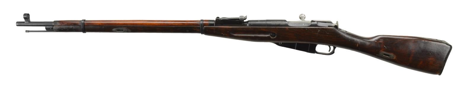 7.62x54R. S #025244. All matching numbers as arsenal renumbered. 29" barrel. Round receiver has import marking and importer serial on left side. Bbl. top has 1937 date, boxed arsenal overhaul marking and Izhesvk logo. Tangent rear sight graduated to 2000 meters. Post front sight with hood. Cleaning rod present. Stock has screw-in sling slots. Hardwood stock also has 1939 Tula cartouche. CONDITION: stock has arsenal rework finish with scattered flaking, dings and handling marks. Metal retains 95% arsenal reworked blue with some silvering on the exposed edges and minor handling marks. Very good bore with some minor frosting. (22-2340/MJC) CURIO $200-300