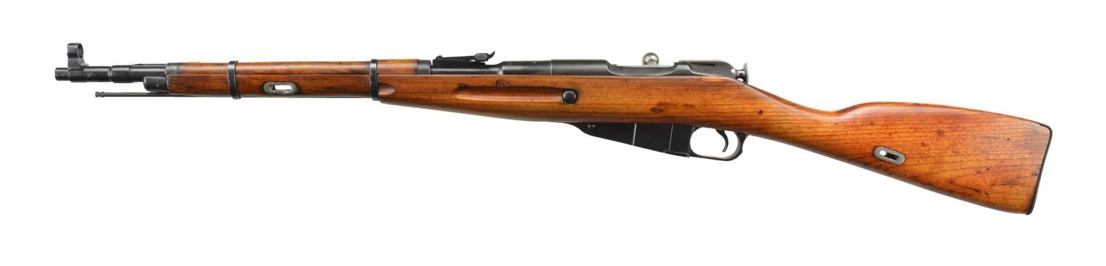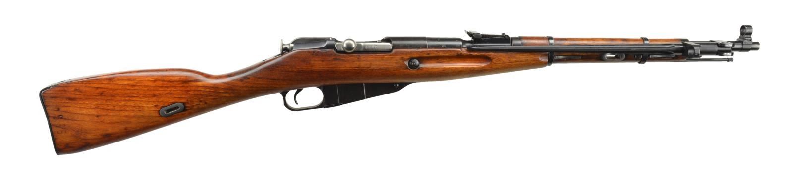 Cal 7.62x54R. Serial #AC1446. Bbl. 20 1/4". All serial numbers match as arsenal renumbered. Bbl. marked with Izhevsk symbol and 1947 date. Straight bolt. Tangent rear sight graduated to 1000 meters. Post front sight w/ protective hood. 15" folding spike bayonet. Hardwood stock w/ sling slots. Cleaning rod present. CONDITION: refinished hardwood stock has a faint number on right side of butt. Stock has an armorer patch repair at right rear of receiver and a 1" crack forming beneath the repair. Stock also shows handling marks and light dings from the years. Metal retains 95% arsenal rework type blue with a few minor pitting spots on receiver and some handling wear. Bayonet is a bit loose and front sling slots show some denting. Good bore showing minor pitting and frosting but strong rifling. (22-2351/MJC) CURIO ($200-300)