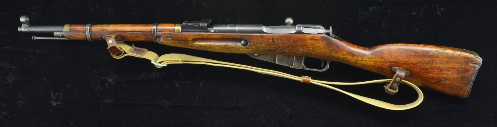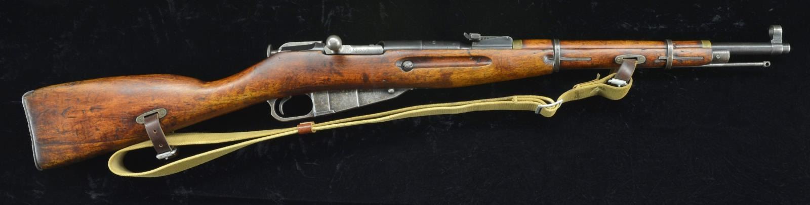 RIFLE. Cal. 7.62x54R. Russian translated S# IP4617. Bbl. 20" w/ hooded post front sight & 1,000m tangent rear sight. Matched numbered bolt, mag. floorplate, & buttplate Correct style hardwood stock set w/ cleaning rod, web sling w/ leather "dog collars". CONDITION: good overall original appearing finish w/ moderate handling marks. Blue is faded to gray/silver patina w/ pinprick oxidation. Good bore. (22-743/MD) CURIO. $300-500.