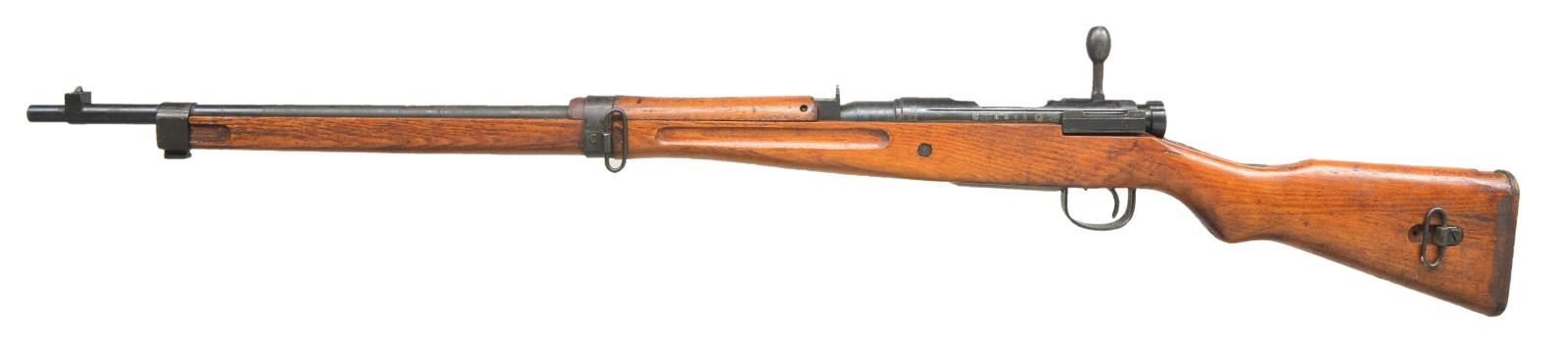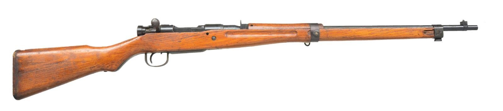 Cal. 7.7 Jap. S #1462. Bbl. 25 1/2". All matching numbers. Receiver top has intact mum. Left side of receiver has 27th series marking, Tokyo Juki Koygo symbol & serial number. Fixed aperture rear sight. Front sight w/out protective ears. Left side sling swivels. Wooden buttplate w/ 3 screws. Underside of wrist & butt have Kanji markings. Stock is fully inletted but has late war metal parts as is correct. CONDITION: stock retains much original Urushi finish w/ a small chip at heel, some staining, scattered dings and handling marks. Metal retains 60% original blue w/ scattered areas of light oxidation & fading. Very good bore. (22-687/MJC). CURIO. $200-300.