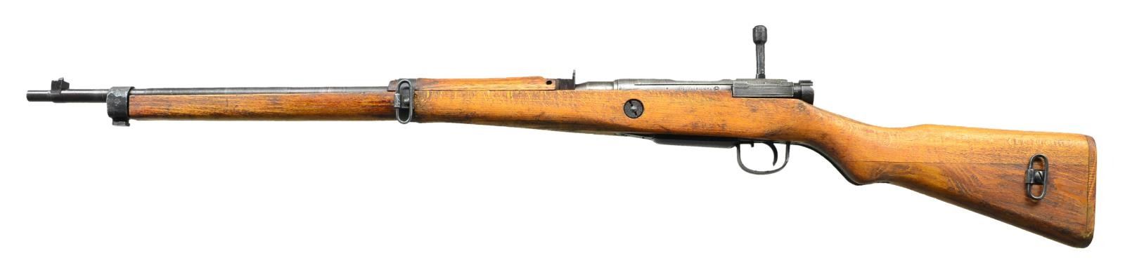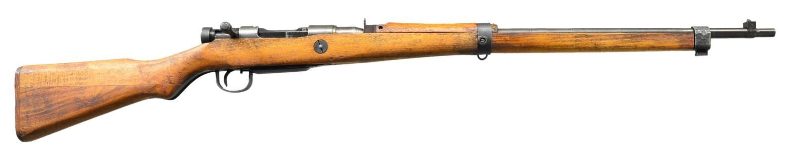 Cal. 7.7 Jap. S # 73929. Bbl. 25 1/2". All matching numbers. Top of receiver has intact mum. Left side of receiver is marked w/ 8th series symbol, Nagoya arsenal symbol & serial number. Fixed aperture rear sight. Inverted V front sight w/out guards. Left side swivels. Bayonet lug has welded construction. Magazine assembly is proud of wood. Three nail wooden buttplate. Hardwood stock set w/ two piece construction & short handguard. Forend made in 2 pieces: separate & loose between bands. CONDITION: hardwood stock set shows some handling marks & dings w/ some scarring from improper band removal at front of handguard. Receiver is a silvery gray color w/ some oxidation staining. Balance of metal retains 80% original blue w/ scattered fading & some silvering. Very good bright bore. (22-691/MJC). CURIO. $200-300.