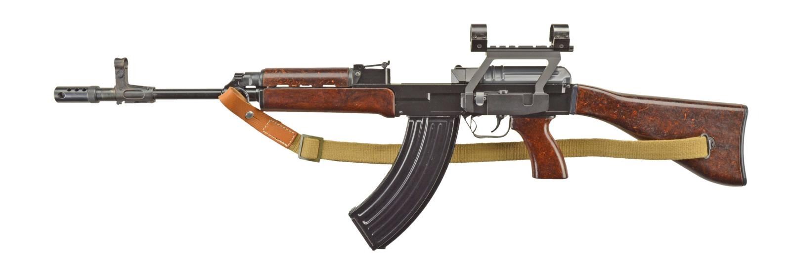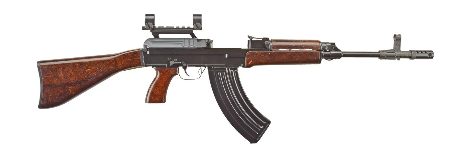 Cal. 7.62x39. S# 5802178. Bbl. 18" over muzzle device. Designed in 1958, the VZ58 rifle is a gas operated select fire weapon that replaced the Czech Model 52 & model 24 machine guns in the Czech Army. Though often misidentified as a variant of the AK-47, there are several distinct differences visible even at distance. They would include a signature red tinted bakelite furniture. Several Czech offerings sport a light black to dark gray high luster finish on all exposed metal surfaces. This semiautomatic variant rifle has the correct grey top cover and the remaining of the exposed metal parts are finished in a dark black. The locking system of the VZ58 shares characteristics w/ the P.38 in regard to the bolt locking system. Protected post front sight. Tangent leaf rear sight graduated to 800 meters. Lest side receiver mounted scope base w/ QD scope mount & Weaver rings. Left side tan canvas sling. MAGS: 3 factory 30rd. UNATTACHED ACCESSORIES: Factory box, cleaning kit, spare parts, bayonet & sheath. CONDITION: finish on exposed surfaces is dark and complete, with very few signs of use, aside from the front sight assembly which retains a thin blued finish. Bright bore w/ strong rifling. Fire control mechanism appears to function correctly when cycled by hand. (22-2393/JZ). MODERN. $600-1,000.