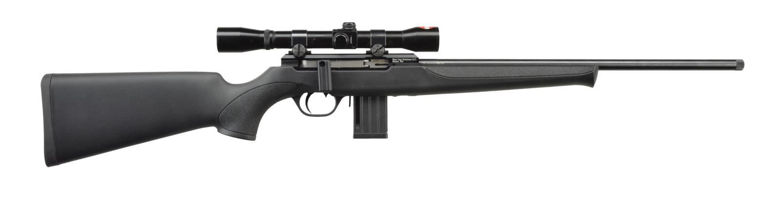 Cal. 22 LR. S# BL000240. Bbl. 20" w/ threaded muzzle & w/out sights. United 4x scope w/ crosshair reticle on Weaver 1" rings & Weaver style bases. Blue Line Solutions LLC import marked grooved receiver Synthetic stock w/ recoil pad. MAGS: 1 - 10 rd. CONDITION: near excellent overall rifle condition including bore. Good scope finish w/ serviceable optics. (22-2571/MD). MODERN. $200-400.