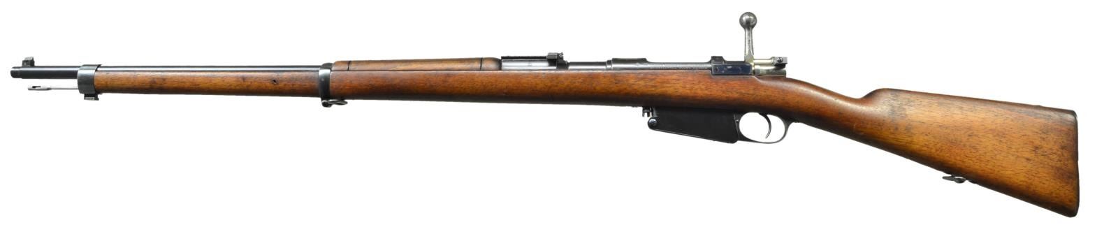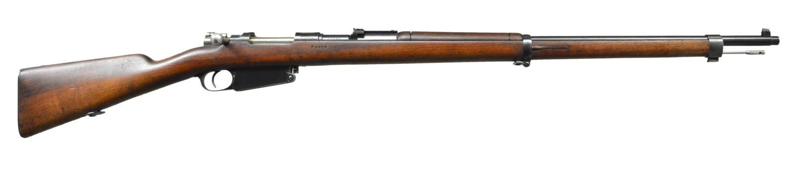 Cal. 7.65x53 Argentine. S# P1084. Bbl. 29". Rear sight is numbered "14" but all other visible parts are matching. Receiver top has ground crest. Left side of receiver has Argentine proofs & Loewe markings. Rear sight graduated to 2000m. Inverted V front sight. Straight bolt. Bottom mounted sling swivels. Walnut stock set. Right side of butt has faint Argentine cartouche. CONDITION: arsenal reworked stock set shows minor dings, scratches and handling marks. Metal retains 90% arsenal reworked blue w/ some light oxidation on front band keeper, thinning on front band & a few spots of light freckling. Bolt release & front band keeper show strong fire blue. Rear sight base shows strong straw color. Very good bright bore. (01-21580/MJC). ANTIQUE. $350-550.