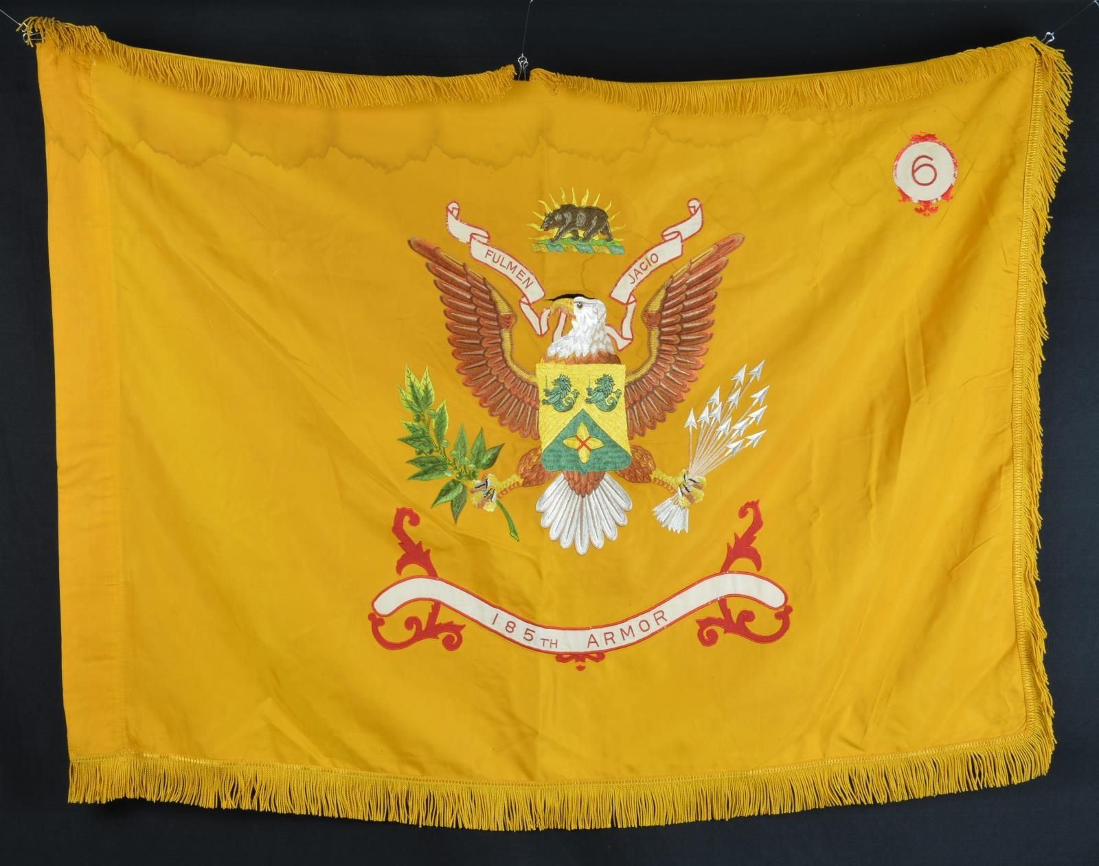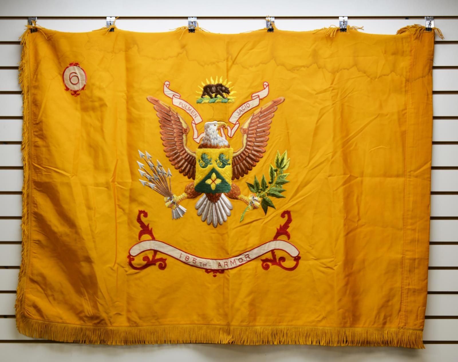3’ x 4’ embroidered on gold/yellow field, 185th was created July 1, 1959 and part of CA National Guard garrisoned in Modesto. Their motto “FULMEN JACIO” on ribbon held by eagle’s beak translates: “Hurl the Thunderbolt”. The flag of this regiment retains the old yellow color of the cavalry reflecting the heritage of armor units. CONDITION: good overall, staining, tear along eagle’s head to field. (02-17547-11/JS). $600-800.