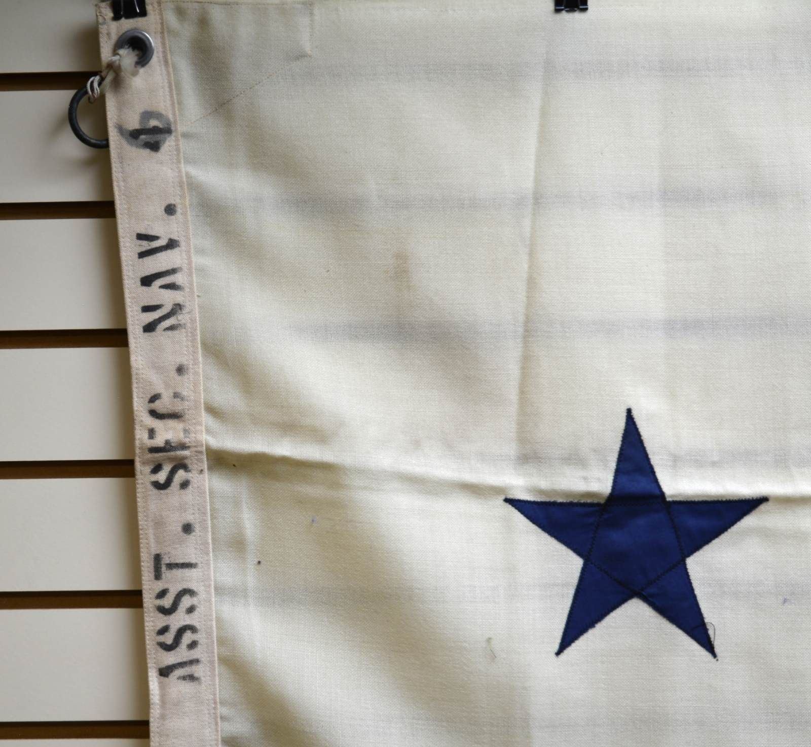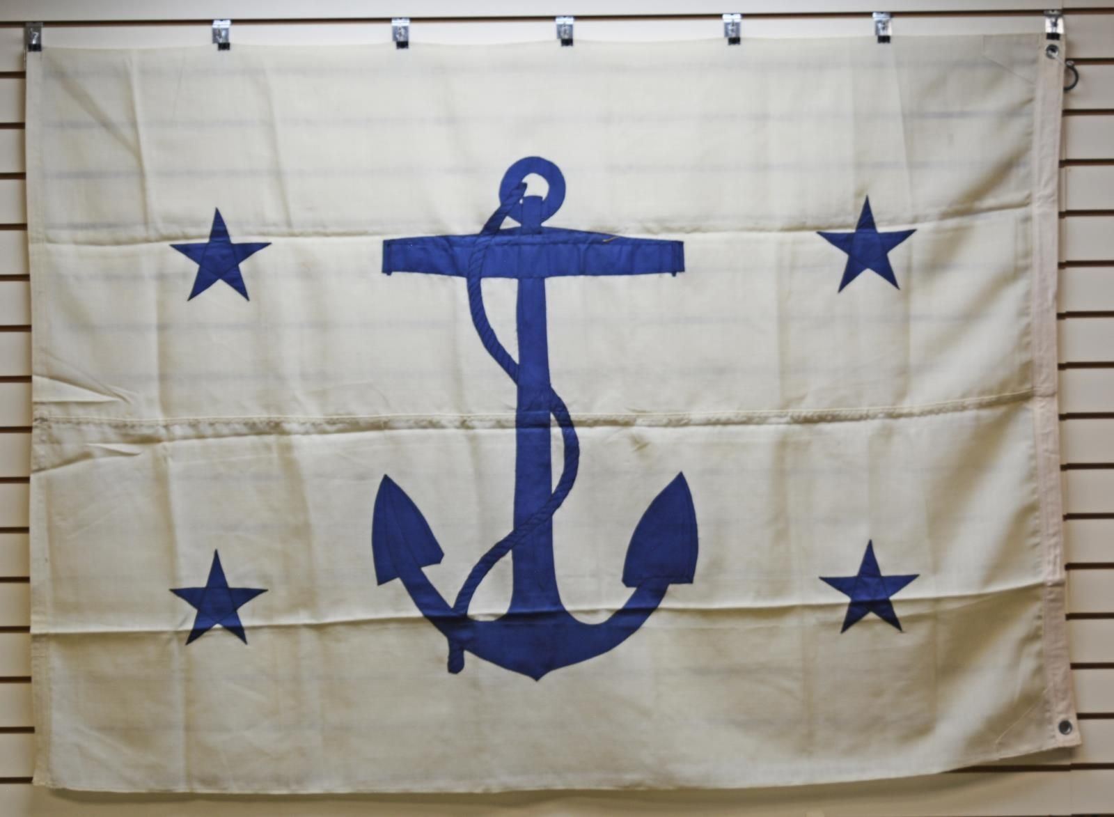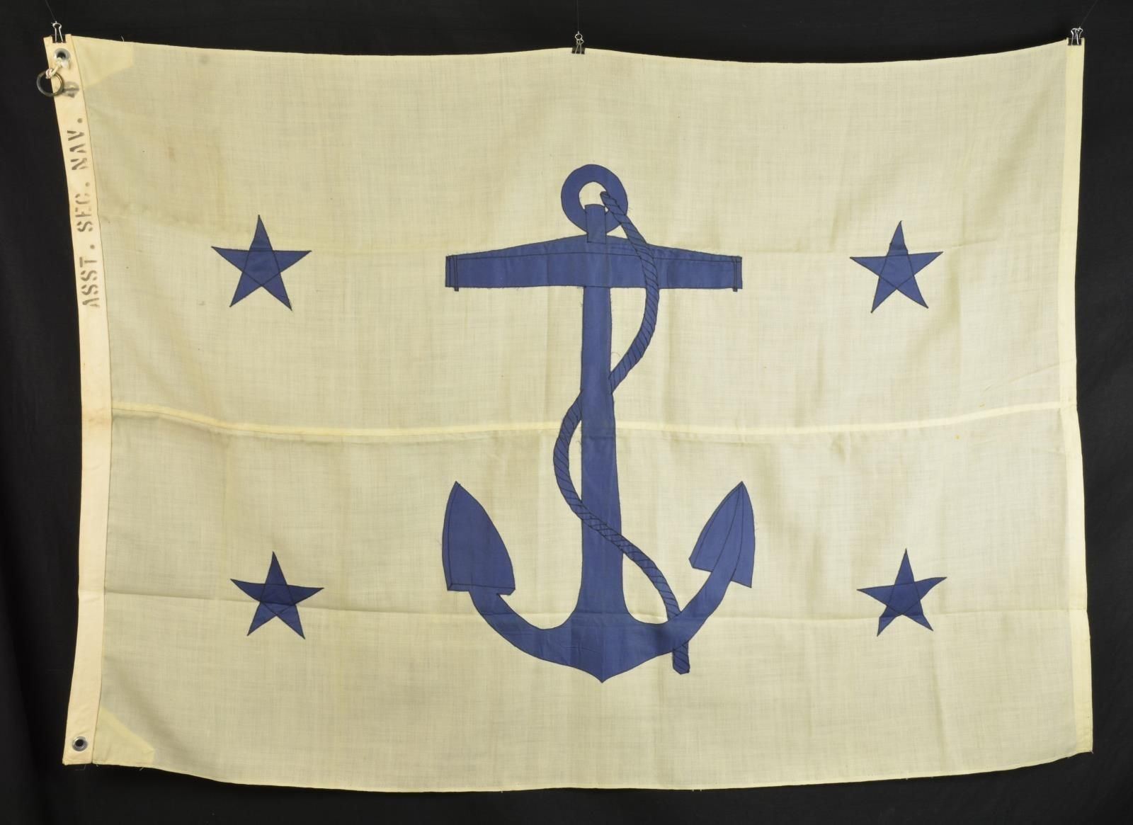 60” x 42” bunting with cotton stars and canvas hoist. Stenciled on hoist “ASST. SEC. NAVY”. White bunting field displays large blue fouled anchor & 4 stars in each quadrant. The flag for the Secretary of the Navy was adopted in 1867 and it is still used today. There are also flags for the Under Secretary, Assistant Secretary and Assistant Secretary for Air, which are the same design but with differing colors of the field and devices.
