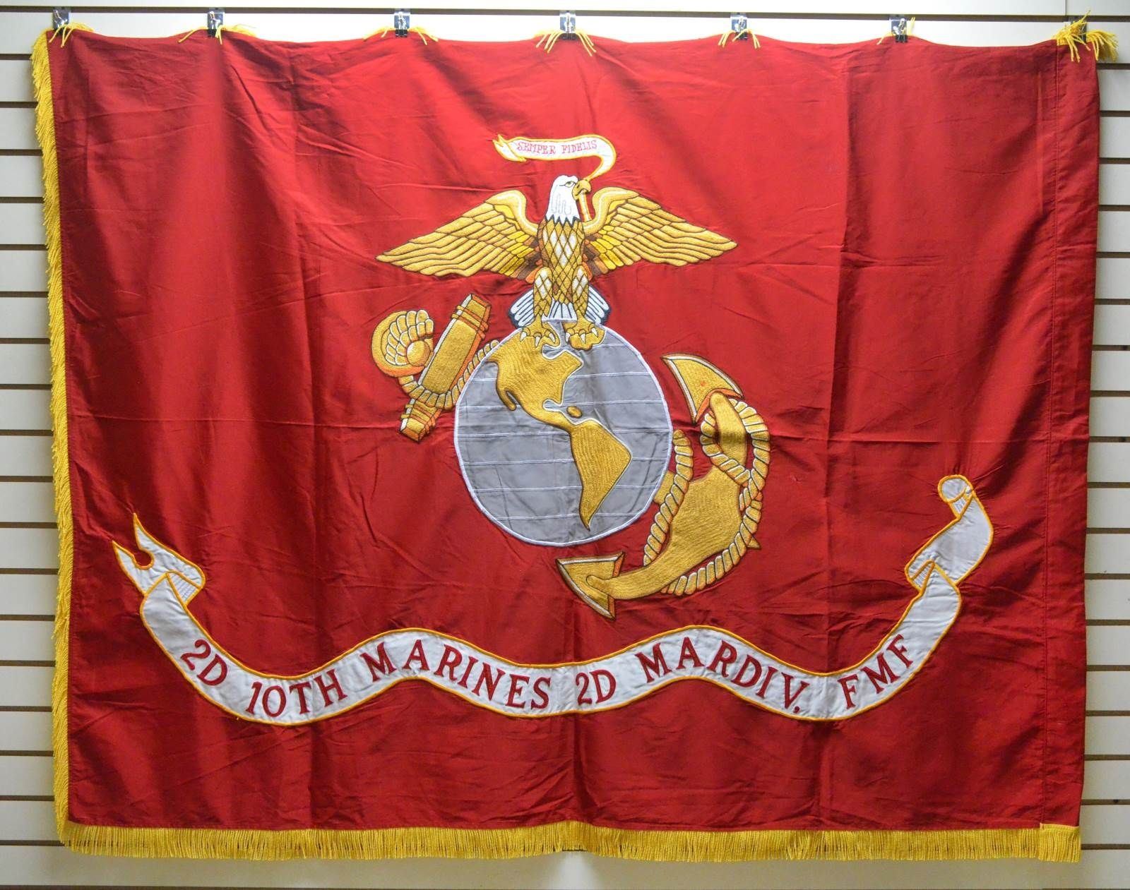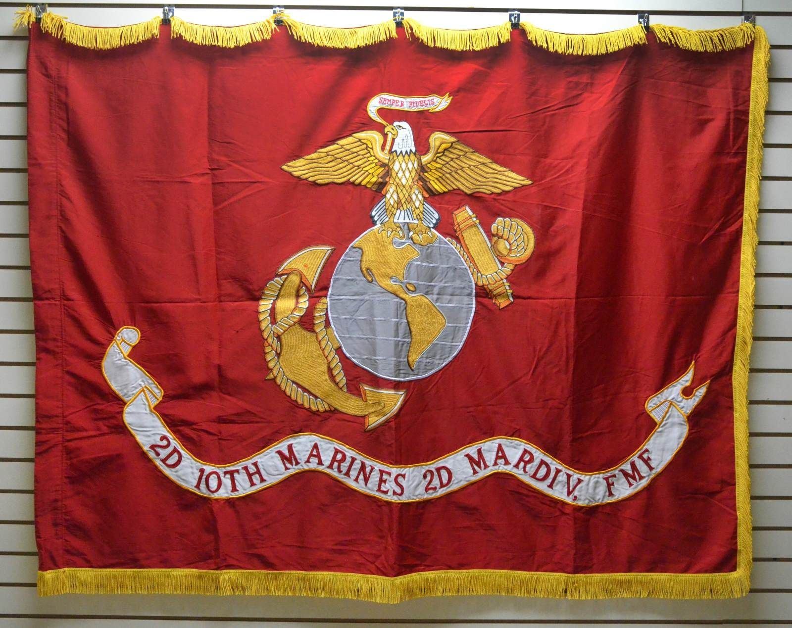 This flag, with its golden fringe, is the ceremonial standard for this command. 2nd battalion was active WW1 disbanded 1920, WW2 disbanded 1945, reactivated 1948-2009. CONDITION: fine overall. (02-17547-14/JS). $300-500.