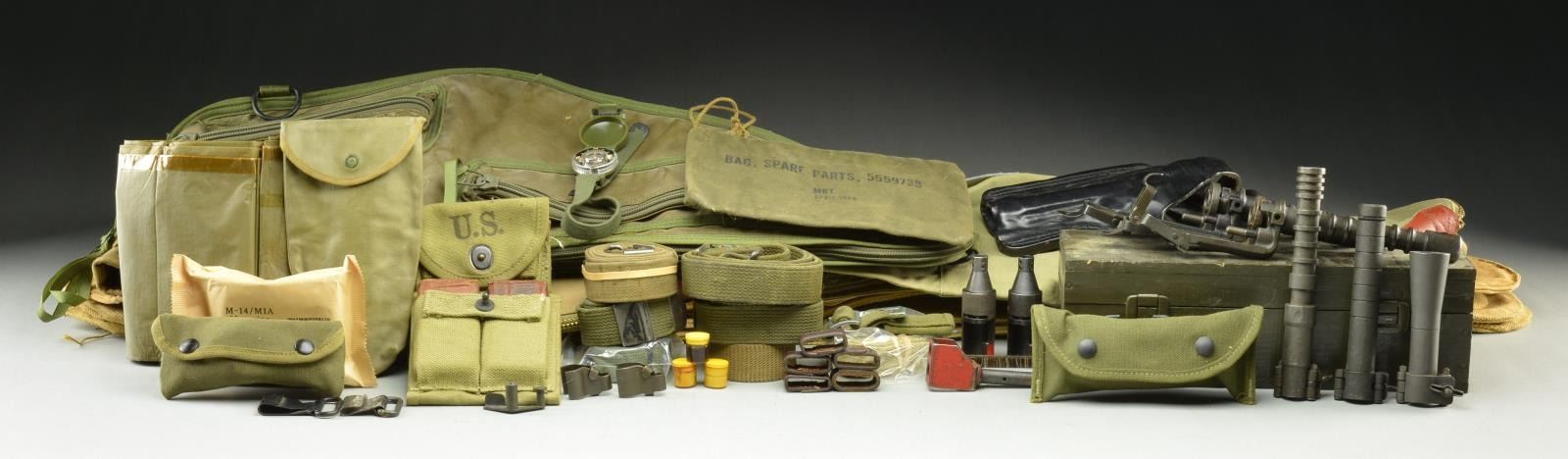 Notable examples include: 9 Military style rifle carrying cases. / 3 Rubber style waterproof sleeves. / 50 cal. broken shell extractor & cleaning kit in pouch. / 6 Grenade Launcher attachments for Model 1903 style rifles. / 2 M15 grenade launching sights in pouches. / 1 M1 Carbine flash hider attachment. 4 M1 Garand style slings. / CONDITION: good to very good overall w/ wear & stains. PROVENANCE: from the estate collections of Charles P. Obremski. (02-16641-10/MD). $200-400.