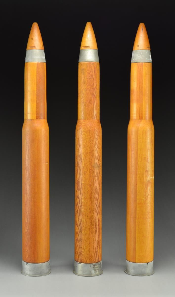 35" Overall of wood & metal construction.. Marked on base "3" DUMMY CARTRIDGE MK 6 50 CAL". CONDITION: very good overall intact w/ patina on metal & handling marks. (02-16812/MD). $200-300.