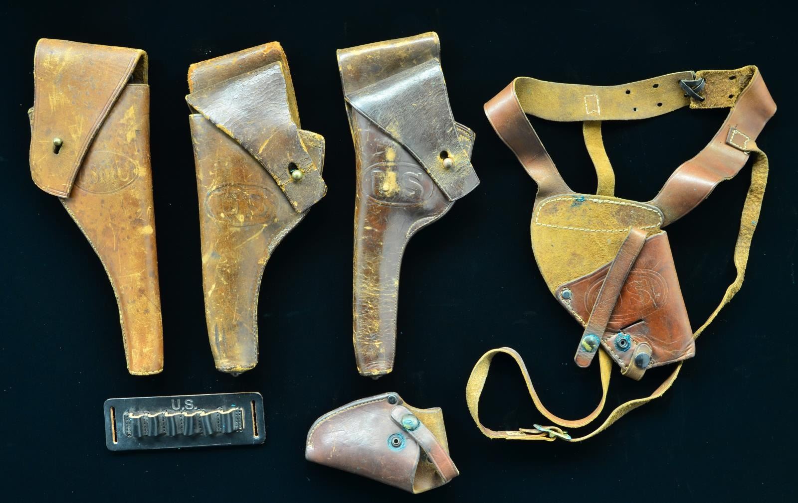 This lot consists of one leather cartridge slide & 5 leather holsters. The cartridge slide is marked "U.S" & "DLA-10089MED45". This slide holds 6 rounds of 38 Special & shows light wear. 1. the first holster appears to be for a snubnosed revolver & is marked "MRT 8-60". This holster shows scattered scuffing & flaking. 2. the second holster is a US marked shoulder holster for a small handgun likely a Colt M1908 General Officer's pistol. This holster includes a shoulder strap & shows crazing, staining & some flaking. 3. The third holster is a 1909/17 holster made by Rock Island Arsenal & dated 1909. This holster shows some flaking, scattered crazing & scuffing. 4. the fourth holster is a M1917 U.S. holster. This holster is dated 1918 & maker marked by G&K. This holster is in fair condition & shows some crackling, flaking & scuffing. 5. the fifth holster is a USMC marked M1892 style holster. The front of the holster is marked "USMC" & rear marked "706" & "6 1/2".This holster shows some scuffing, dirt staining & flaking. (02-17437-3/MJC). $150-300.