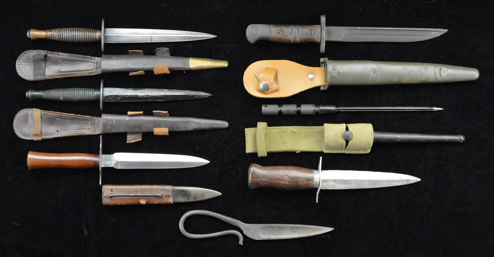 1) SYKES-FAIRBARN STYLE KNIFE. Dbl. edge stiletto 11.5” overall, blade approx. 7”. Bronze colored grip w/ British style proofs, hex nut pommel. Leather sheath w/ brass tip. CONDITION: good knife w/ dark patina & wear. Good sheath w/ some verdigris & light flexing of leather.