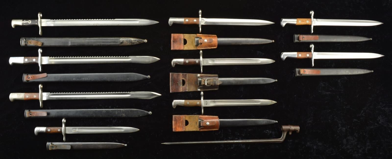 This lot consists of 10 various Swiss bayonets. 1. The first is an M1918 bayonet marked "ELSENER SCHWYZ VICTORIA". The bayonet rates very good showing minor oxidation staining. 2. The second is an M1918 bayonet w/ scabbard & leather frog. This bayonet is numbered "53393&"S and marked "WAFFENABRIK NEUHAUSEN". This bayonet is in very good condition. The frog is marked "GSCH 82" & shows some crazing & flaking. 3. The third bayonet is an 1889 Schmidt Rubin bayonet w/ scabbard. The bayonet is numbered "265606" & marked "WAFFENFABRIK NEUHAUSEN". This bayonet shows moderate oxidation staining & some light scratches. 4. the fourth bayonet is an 1889 Schmidt Rubin bayonet w/ leather frog & scabbard. The bayonet is numbered "410134" & marked "WAFFENFABRIK NEUHAUSEN". The bayonet shows some light oxidation staining & dried grease. The leather frog is marked "Jos. Christen Sattler Wolfenschiessen 87". The frog shows scattered crazing & flaking. 5. the fifth bayonet is an M1918 w/ scabbard. The blade is marked "ELSENER SCHWYZ". The bayonet is in very good plus condition overall. 6. the sixth bayonet is an M1914 sawback. The bayonet is marked "HS" & numbered "3913". The crossguard & pommel are turning to a gray patina, while the blade remains mostly bright. 7. the seventh bayonet is an M1889 bayonet w/ leather frog & scabbard. The bayonet is numbered "374350" & marked "WAFFENFABRIK NEUHAUSEN". This bayonet shows areas turning gray w/ some oxidation staining. The frog has an illegible maker's marking, it shows scattered crazing & flaking. 8. the eighth bayonet is an M1871 Vetterli socket bayonet. No scabbard is present for this bayonet. This bayonet is numbered "122511". The metal is turning to a dull gray w/ scattered oxidation. 9. the ninth bayonet is an M1914 sawback w/ scabbard. The bayonet is numbered "758533" & marked "ELSENER SCHWYZ". The bayonet shows some light scratches & fine oxidation staining. 10. the last bayonet is an M1887 Pioneer sawback w/ scabbard. The blade is marked "SJG NEUHAUSEN". the crossguard & pommel appear chrome plated w/ some flaking & oxidation staining. The blade shows some light oxidation staining. (02-16391/MJC). $400-700.