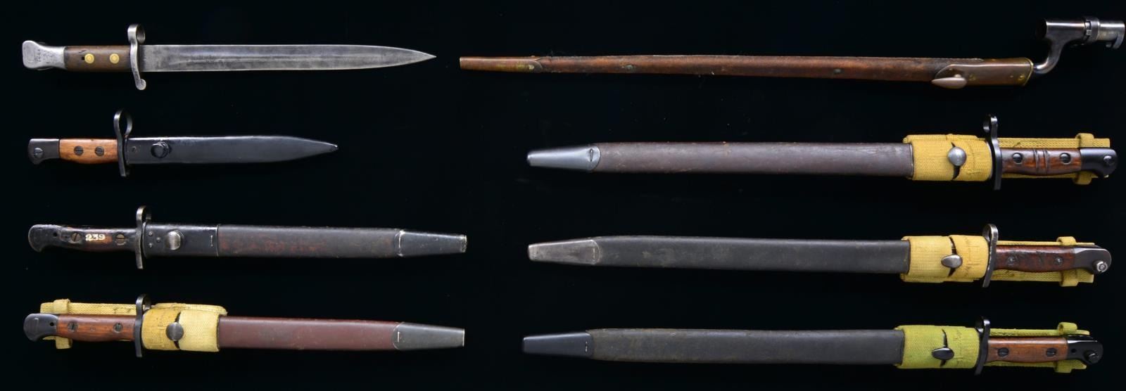 4) SMLE Pattern 1907 w/ 17" fullered blade. Mfg. in Australia by Lithgow. Left ricasso is marked w/ "star over shield", dated "1907" & additionally stamped "1918" & "Lithgow". Right ricasso has 2 "star" proofs & "opposed arrows" indicating sold out of service. Straight cross guard marked on right side "2ND M.D" & S#. Smooth walnut grips; birdshead pommel w/ non matching S#. Leather scabbard w/ metal tips, khaki & web frog. CONDITION: bayonet has 75% worn original finish; grips have moderate wear, staining & handling marks w/ 2 "bored soldier" angled grooves in left hand grip. Scabbard has wear, scuffing & staining.