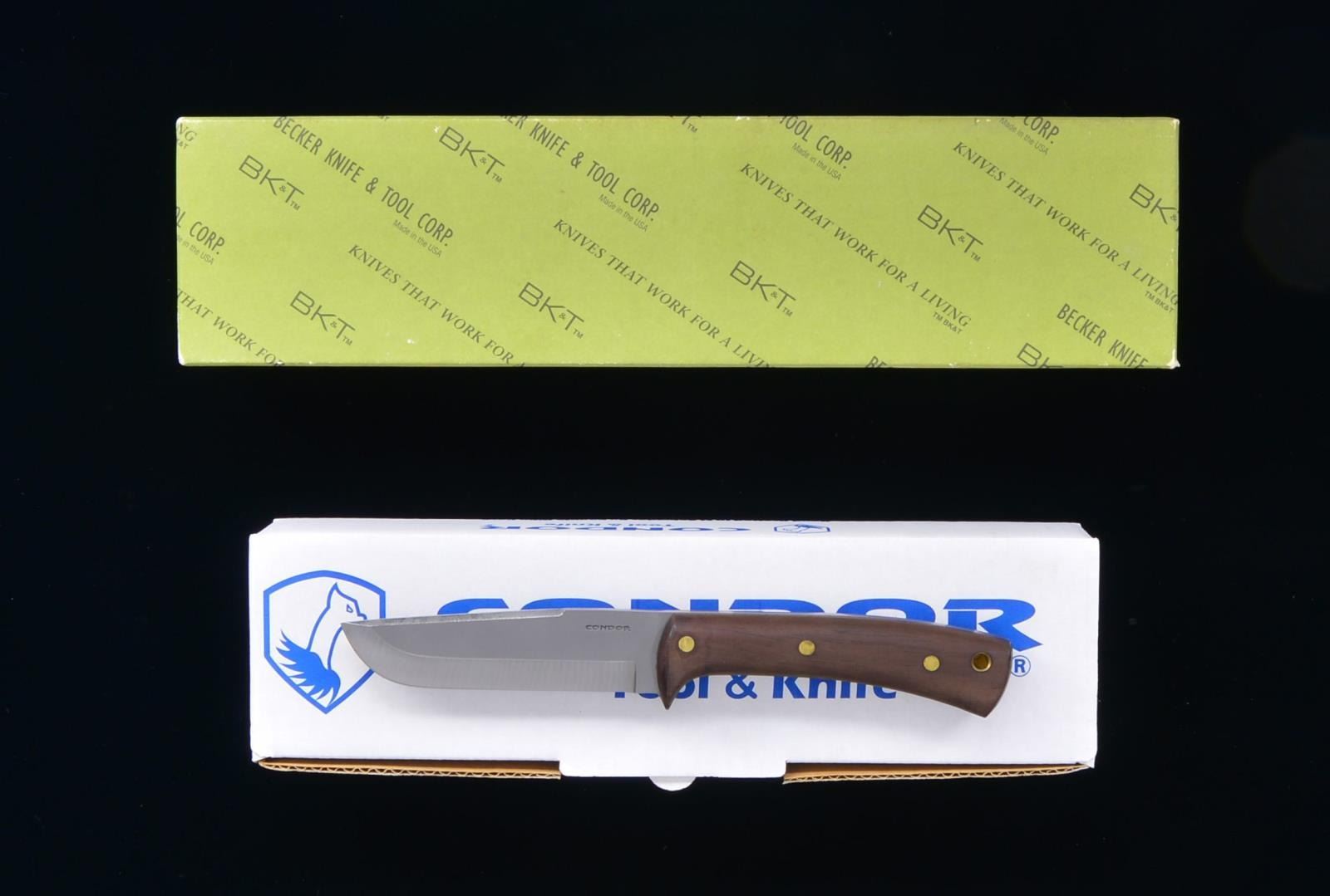 9) Condor Tool & Knife Primitive Brush Knife w/ box, sheath & packaging.