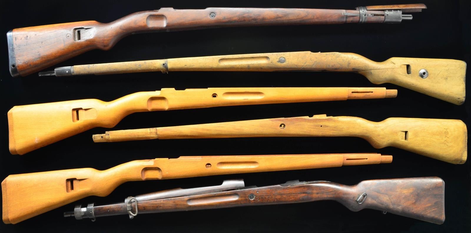 This lot consists of six various Mauser stocks two handguards, & two forends. 1. the first stock is a German Kar98a stock w/ bayonet lug, recoil lug & buttplate. The right side of the butt has faint Imperial proofs. The stock is numbered "2692" in the bbl. channel & on he left side above recoil lug likely indicating Spanish use. Left side of stock has a faint Weimar 1920 ownership marking. CONDITION: this sanded stock shows both sides of wrist show a flexing crack running into sling cut, a couple smaller cracks, some staining, dings & handling marks. The reblued buttplate & bayonet lug show some oxidation & dings. The stock disc shows light pitting. 2. The second stock is an Israeli beech K98k stock. The stock appears to be unmarked & no metal hardware is present. CONDITION: this stock shows some scattered handling marks. 3. the third stock is another beech Israeli K98k stock. This stock appears unmarked & no metal hardware is present. CONDITION: This stock shows some dings & handling marks. 4. the fourth stock is a Yugo M48 stock. No metal hardware is present & the left side of the butt is numbered "77784". CONDITION: stock appears cleaned w/ a couple chips at rear of butt, some handling marks & scattered finish lost. 5. the fifth stock is a postwar Czech K98k stock w/ handguard, bandkepper, bayonet lug, both barrel bands, recoil lug & buttplate. The right side of the stock is marked w/ a circled "Z" & "MK-2". The left side of stock & both sides of buttplate are crudely numbered "2640" in a small font. CONDITION: There is a triangular chip at toe of the stock, the stock & handguard otherwise show scattered dings, finish loss & handling marks. 6. the sixth stock is a Brazilian 08/34 stock w/ handguard, sling hardware, recoil lug, buttplate, bayonet lug & both bands. This stock is numbered "1616N" & has a Brazilian marking on the right side of the butt. CONDITION: the stock set shows scattered finish loss, dings & handling marks. The metal parts are a brown patina w/ oxidation throughout. The two forends are loose & appear to be broken or duffel cut. They both have nosecaps. CONDITION: one forend shows chipping at rear, both have finish loss, staining & handling wear. Both nosecaps show scattered oxidation. (02-16809-4/MJC). $150-300.