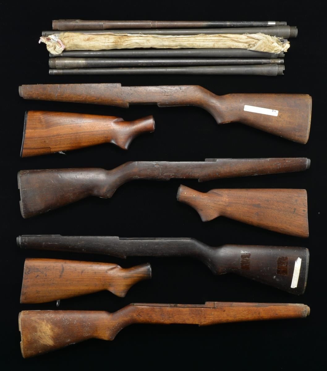 This lot consists of 4 stripped M1 Garand stocks One stock has a faint DoD eagle cartouche, the other stocks lack cartouches. One stock has a brass disc on bottom of pistol grip. Some stocks show rack numbers & added stickers. They all show varying degrees of finish loss, dings, dents, gouges & handling wear. The next two items in this lot are military marked Winchester 97 buttstocks. One lacks a sling swivel or provision for it. The first stock has boxed "GHD" inspector's cartouche on the left side & the other "WB" & an ordnance wheel. Both stocks appear sanded w/ a few repaired cracks notably at wrist & dings. The next item is a military marked Winchester Model 12 stock w/ sling swivel & Winchester buttplate. The left side of the stock has an "RIA" rebuild cartouche. The stock appears to have been sanded & is a large patch repair at toe w/ scattered handling marks. The next item is a 6-66 dated Springfield Armory Garand barrel. This barrel shows a worn parkerized finish w/ scattered staining & oxidation on the surfaces. Bore is good w/ some frosting. The last five items are varied 1903 & 1903A3 USGI barrels w/ three Remington barrels, one RIA barrel & one Springfield Armory barrel. The Springfield barrel has the remnants of a broken front sight. One Remington barrel is wrapped in wax paper. The barrels otherwise show scattered silvering, thinning & silvering of their finish. The RIA barrel is plugged w/ grease. The bores otherwise rate good to very good w/ one showing a spot of pitting. (02-17437/8/MJC). $300-500.