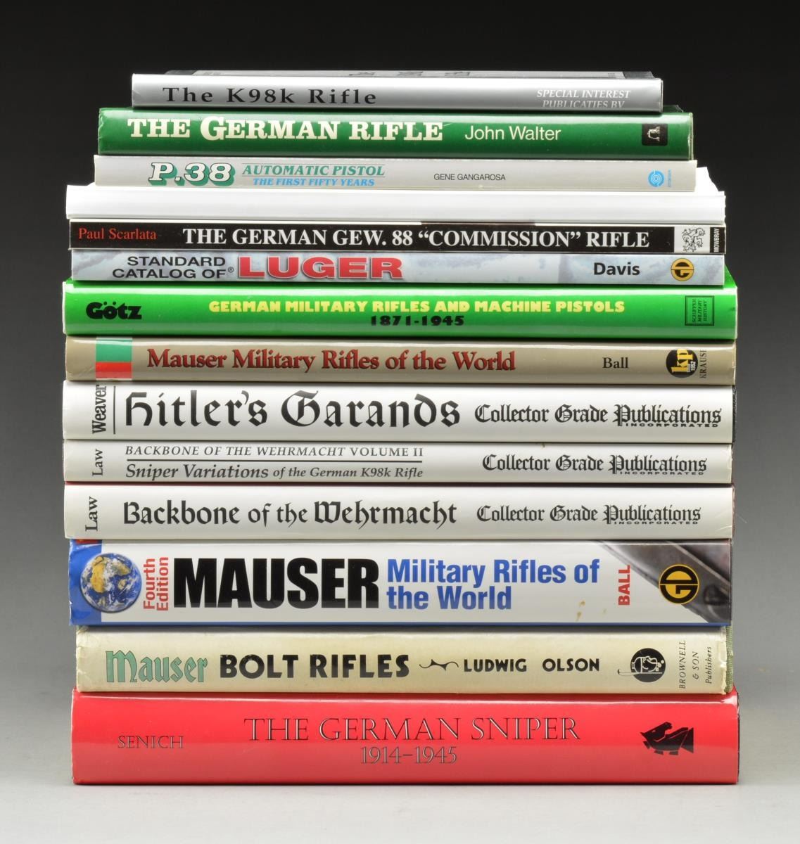 Notable titles include: Hitler's Garands by Weaver. / Sniper Variations of the German 98K Rifle by Law. / The German Sniper by Senich. / Backbone of the Wehrmacht by Law. / Mauser Bolt Rifles by Olsen. / German Military Rifles and Machine Pistols by Gotz. CONDITION: books in generally good, clean condition w/ dust jackets. May have light edge wear & very light spots of staining. (02-16814-4/RW). $300-500.