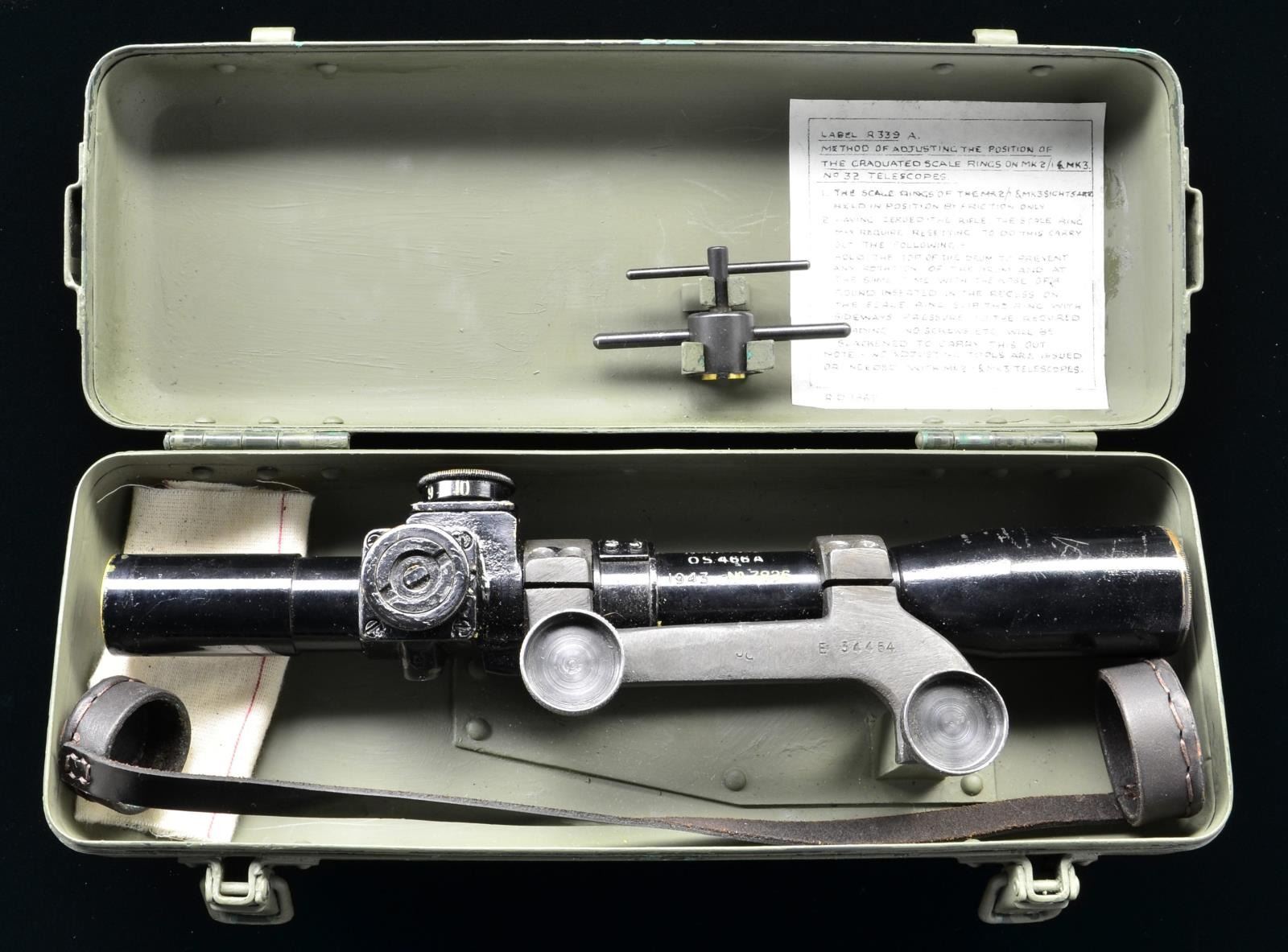 Scope for the British No. 4 MKI T Enfield sniper rifle. Lot includes scope, leather scope cover set, upper half of scope mount, adjustment tool & carrying case. Scope is marked "OS466A", "1943" & "No. 7826". Rings are numbered "158" & "159". Mount is marked "E 34454". Scope has a post reticle & optics that are a bit dirty. Scope retains most of its Suncorite finish w/ scattered light flaking & light scratches. Scope case has instructions on inside & shows scattered flaking green paint. PROVENANCE: from the estate collections of Charles P. Obremski. (02-16641-7/MJC). $1000-1500.