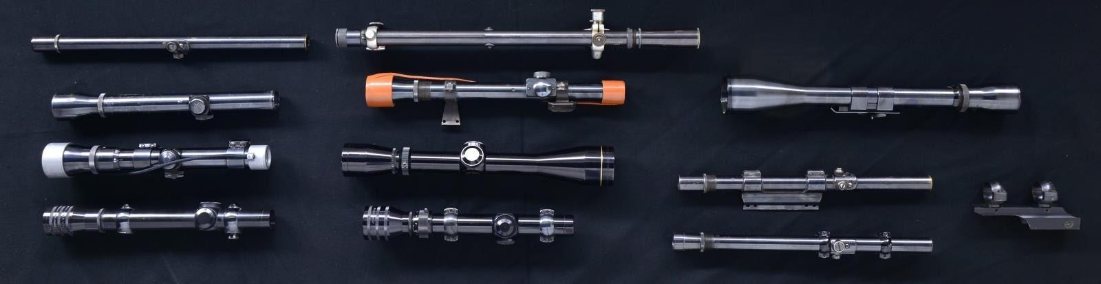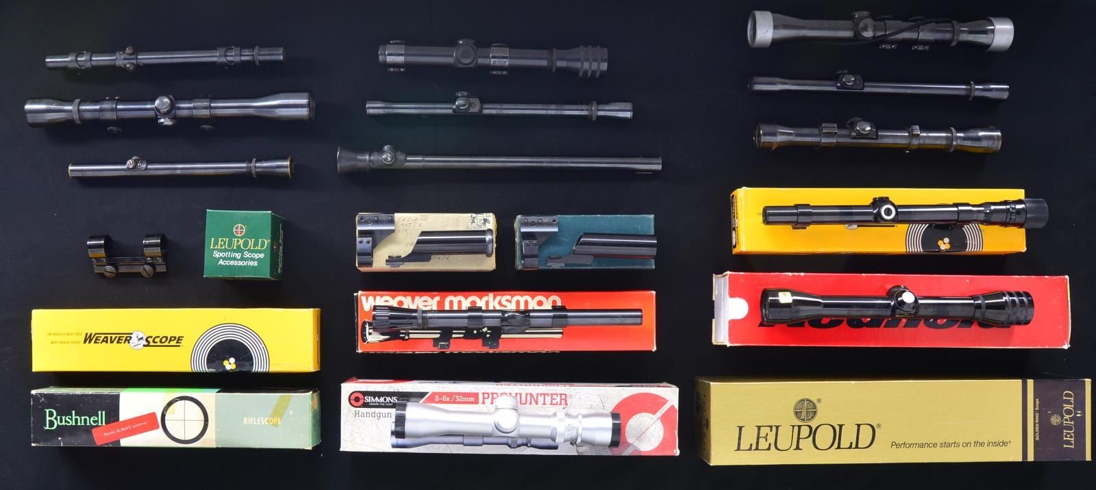 All w/ very good or better exterior finishes & near excellent optics unless mentioned. 1) Bear Cub 2-3/4X power w/ CH reticle & Weaver rings. 2) Stith 2-3/4 power w/ post CH reticle & Conetrol rings. 3) Redfield Traditional 1-4 power w/ Multiplex reticle. Redfield mount set w/ 4 top screw rings & M336 marked base. 4) Redfield Traditional 4 power w/ 4 Plex reticle & original box. 5) Leupold gloss finished 3-9 power Vari X-IIc w/ duplex reticle. 6) Mossberg vintage 4X w/ 14” long 3/4” tube & rubber eye cup; all in exceptional condition. 7) Simmons Prohunter 2-6X 32mm silver colored w/ duplex reticle appearing new in box. 8) Lyman Alaskan 2.5 power w/ 7/8” tube held in steel mounts utilizing front bridge & left rear of receiver sight mounts of unknown application. Texan leather lens caps plus fine CH & dot reticle. 9) Weaver V8 w/ CH reticle mounted in Bausch & Lomb clamp ring set. 10) Weaver steel tube K3. Peppery oxidation on exterior & poor image that views backwards; parts only. 11) Weaver steel tube K6 60-B w/ CH reticle & Weaver rings. 12) Weaver steel tube K4 60-B w/ CH reticle, see-through lens caps & Weaver rings. 13) Weaver 1.5-4.5 power w/ duplex reticle, see-through lens caps & Weaver pivot mount set for Savage Model 99. 14) Weaver early K4 w/ CH reticle in Redfield early ring set of style used on 1903 sniper rifles; wide front & narrow rear. Peppery oxidation throughout. 15) Weaver J4 w/ CH reticle having slightly cloudy image. 16) Weaver J4 w/ CH reticle. 17) Weaver J2.5 w/ CH reticle. 18) Weaver B4 w/ CH reticle in Redfield rings for grooved receiver. 19) Weaver G4 w/ CH reticle & vintage Weaver grooved receiver rings. 20) Weaver G6 w/ CH reticle. 21) Weaver Marksman 4X 22 scope w/ CH reticle for grooved receiver rings in original box; missing plastic turret caps. 22) Weaver V22 w/ duplex reticle; original box. 23) J.C. Higgins 4X same as Weaver B4; crosshair reticle & N side mt. 24) Fecker 16 1/4" target style scope w/ 3/4" tube & post CH reticle; appears 5 power w/ silver target mounts & screw in lens caps. 25) Complete (appears new in box) Stith scope mount. listed for Weaver K2.5 scope to be installed on Winchester Model 70 or 54 and Remington Model 721 or 722. 26) Stith scope mount same as preceding #23 but instructions indicate Model 70 utilizing Weaver & Lyman Alaskan scopes. Original box w/ unreadable label & postage address on top. 27) S&K mount & rings for M1 carbine; missing dovetail anchor. 28) Weaver side mount w/ attachment screws; no base. 29) Four empty scope boxes plus empty sunshade box. (02-16948-1/NW). $800-1,200.