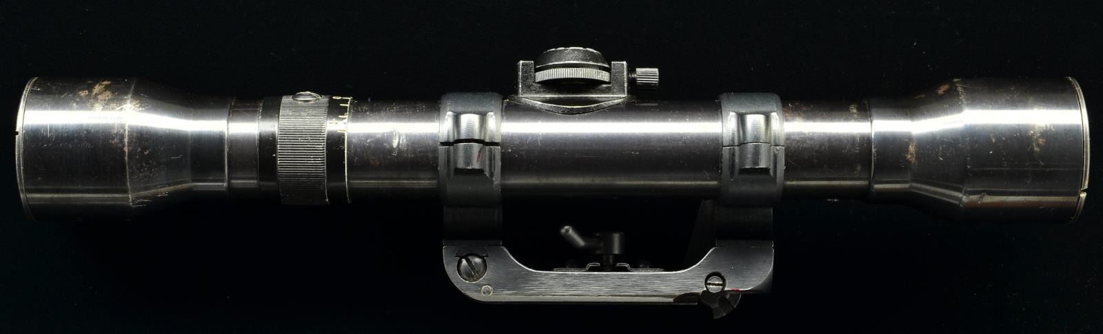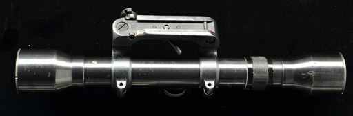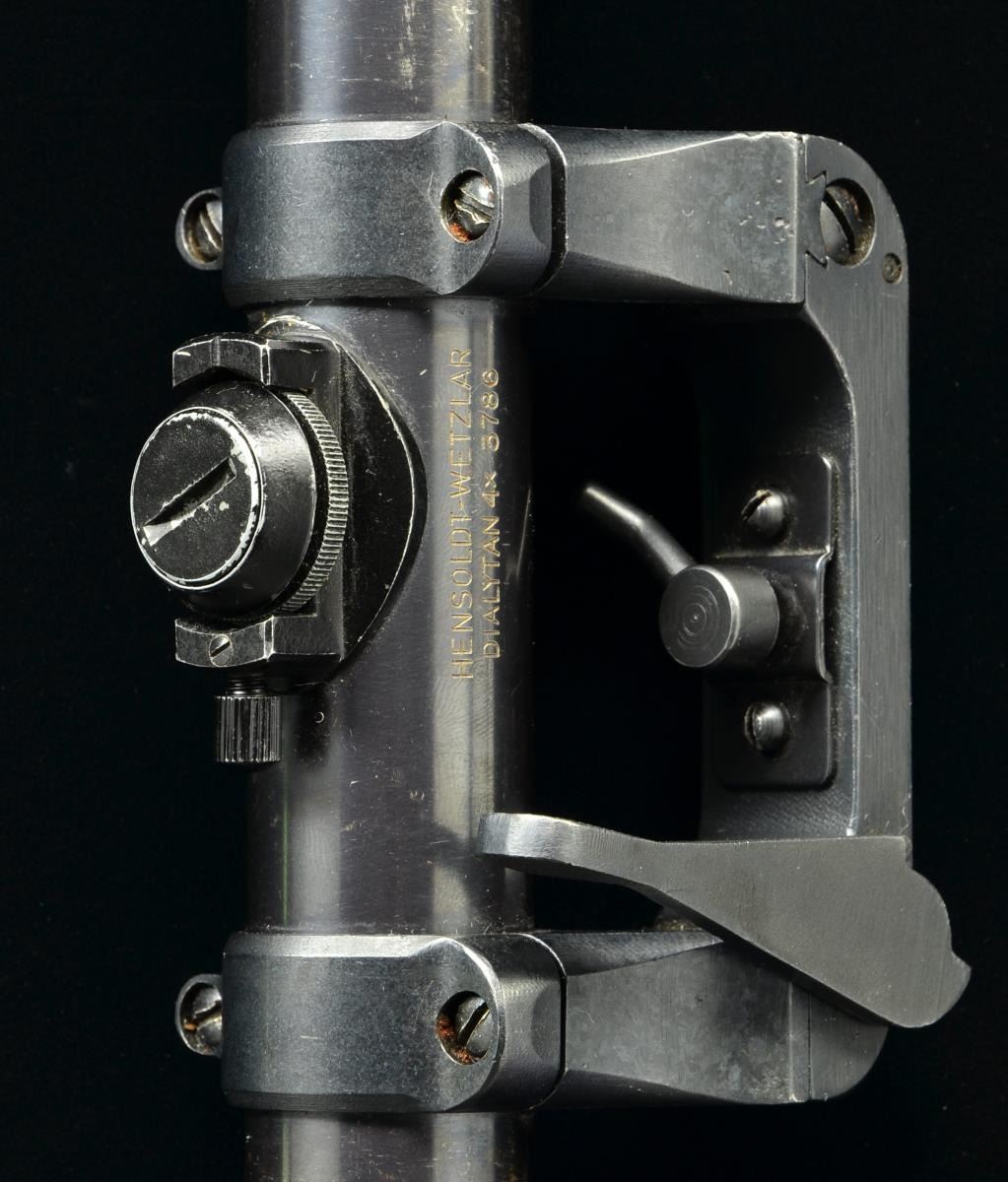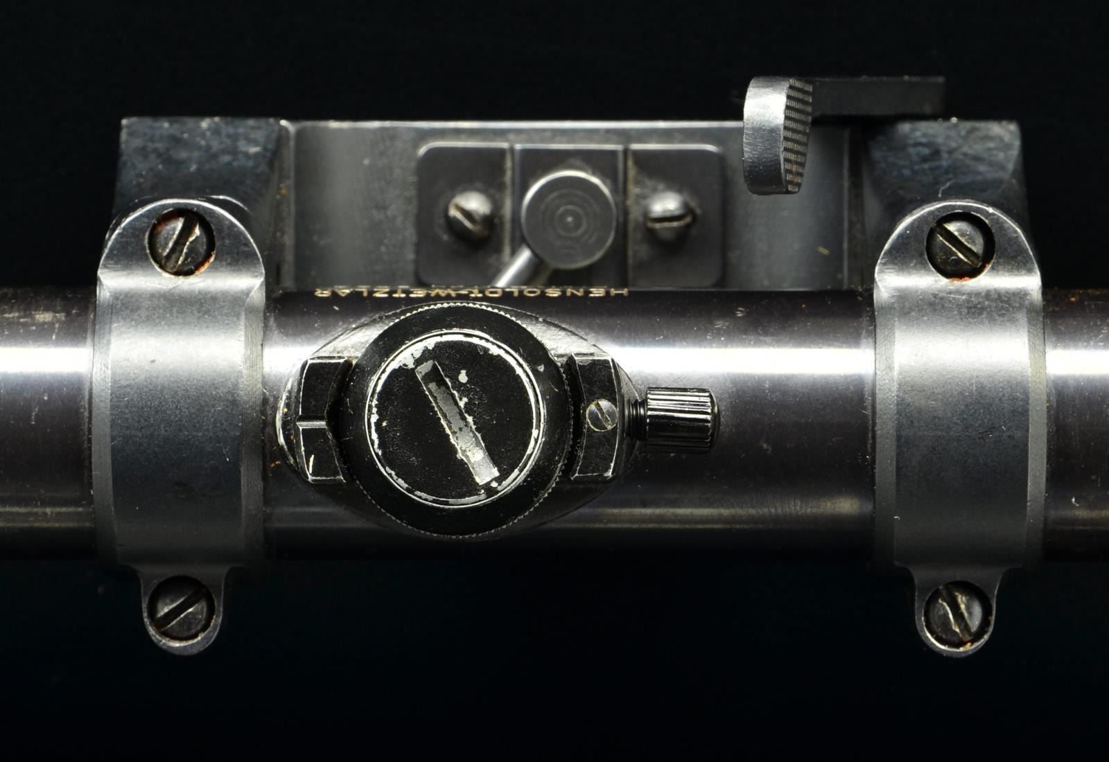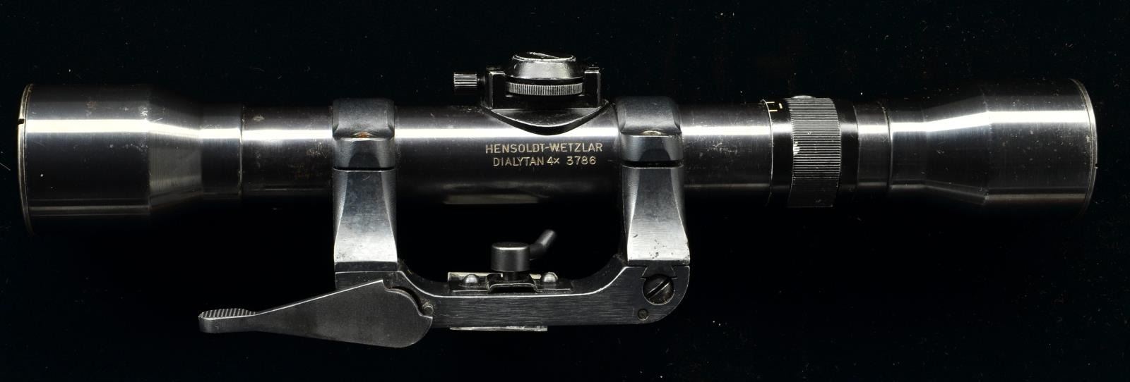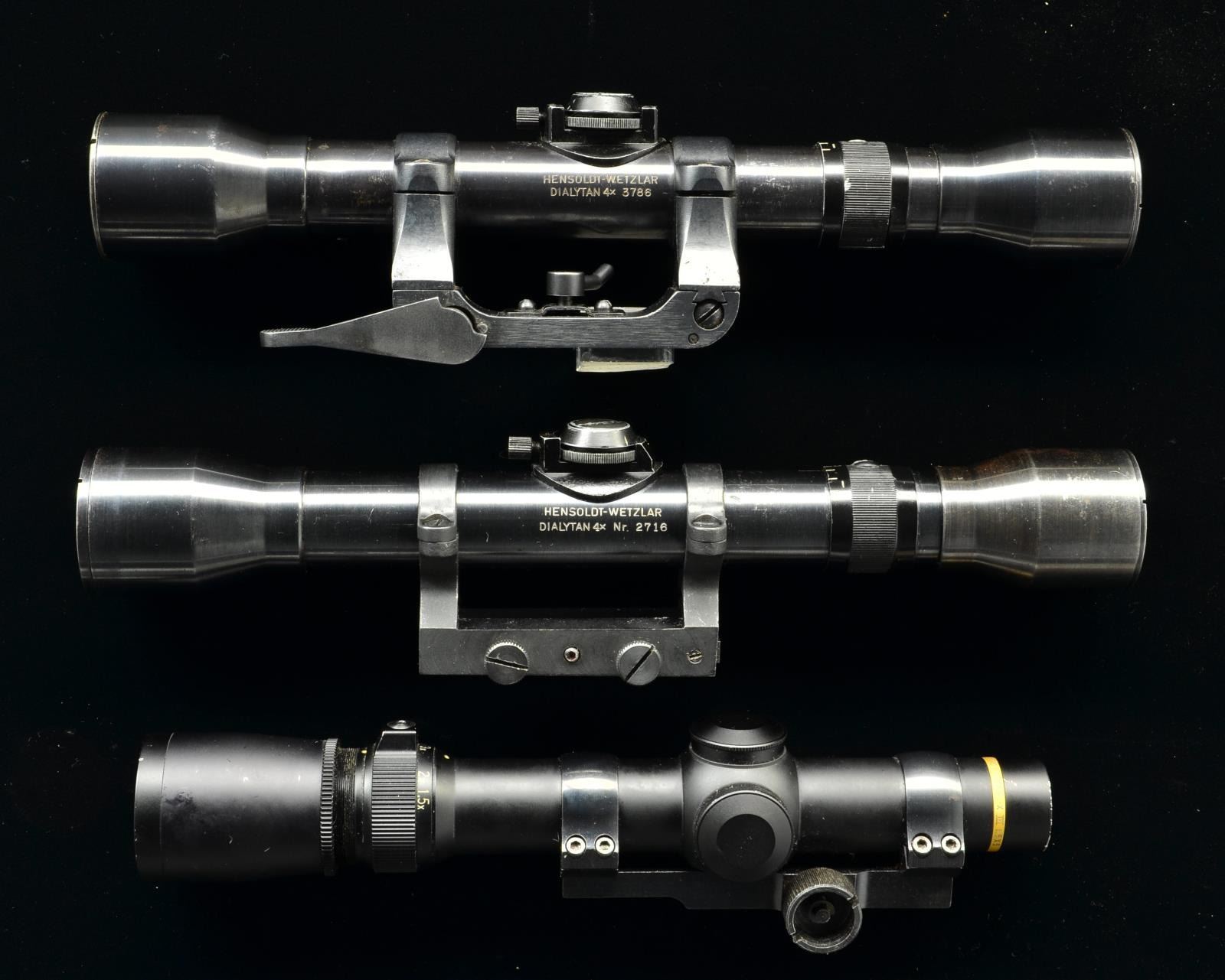 1) Hensoldt-Wetzlar dialytan 4X telescopic sight w/ reproduction German short rail sniper scope mount & 2 mount bases. Scope has 1" steel tube adjustable for focus & elevation. Vertical post reticle w/ truncated cone tip. Blued steel short rail mount is unmarked. 1 mount base shows signs of machinist fitting; 1 appears unmodified. Also included are drill & tap & mounting screws. CONDITION: scope contains 80% original blue finish w/ fitting wear & handling marks. Focus ring does not turn. Optics appear slightly cloudy but serviceable. Mount & bases have most of their blue finish except where modified. Mount has file marks at lower inside edge. 2) Hensoldt-Wetzlar dialytan 4X telescopic sight w/ adjustable elevation & focus. Vertical post & horizontal crossbar reticle. Fitted w/ steel scope mount for dovetail base. 2 clamping screws on left side. CONDITION: scope has light wear, thinning finish & scattered handling marks. Optics appear clear & serviceable. Mount has light high point wear. 3) LEUPOLD VARI-X III 1.5x5. 1" tube duplex reticle fitted w/ blued steel dovetail scope mount marked "VALMET" w/ single clamping screw. CONDITION: scope has very light wear & sm. scattered handling marks. Optics appear clear & serviceable. Base has light wear notably from attachment to rifle. (02-16811-6/RW) $300-500.