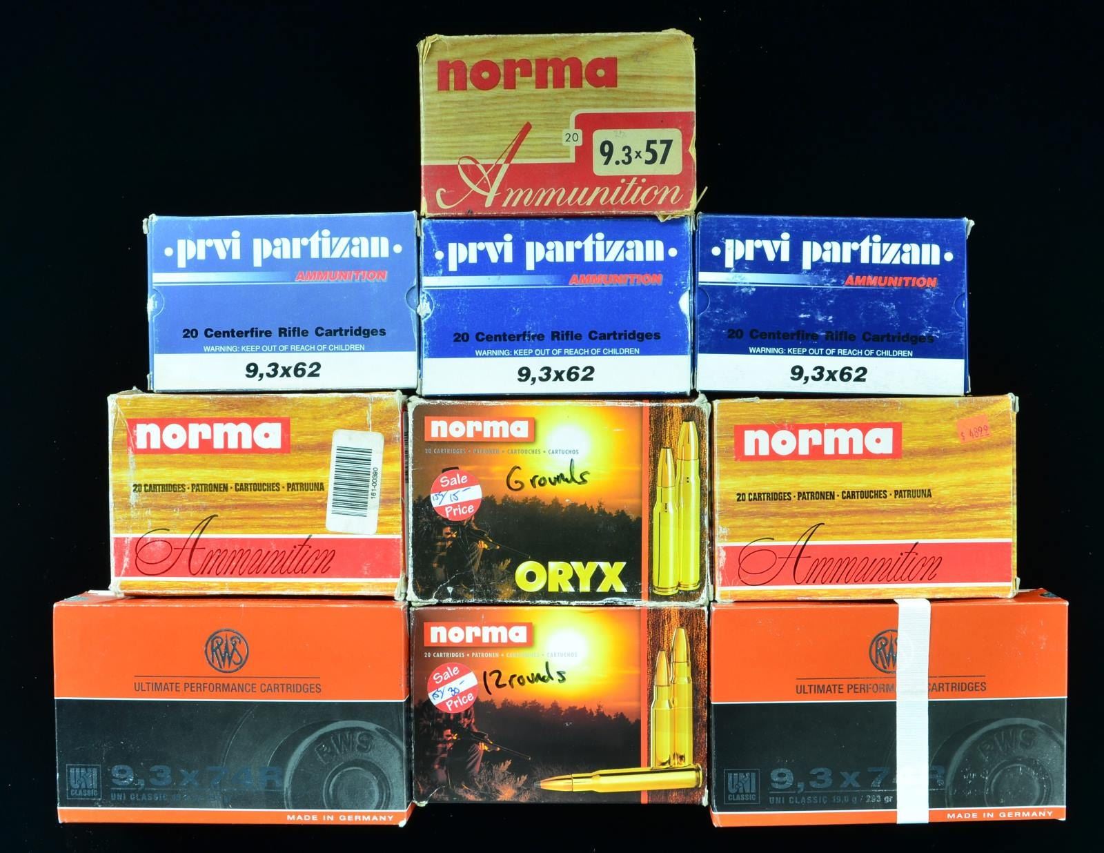 9.3x62 (6 BOXES): 65+ Rds. 285 gr. SP. / 30 Rds. 232 grs. soft point.