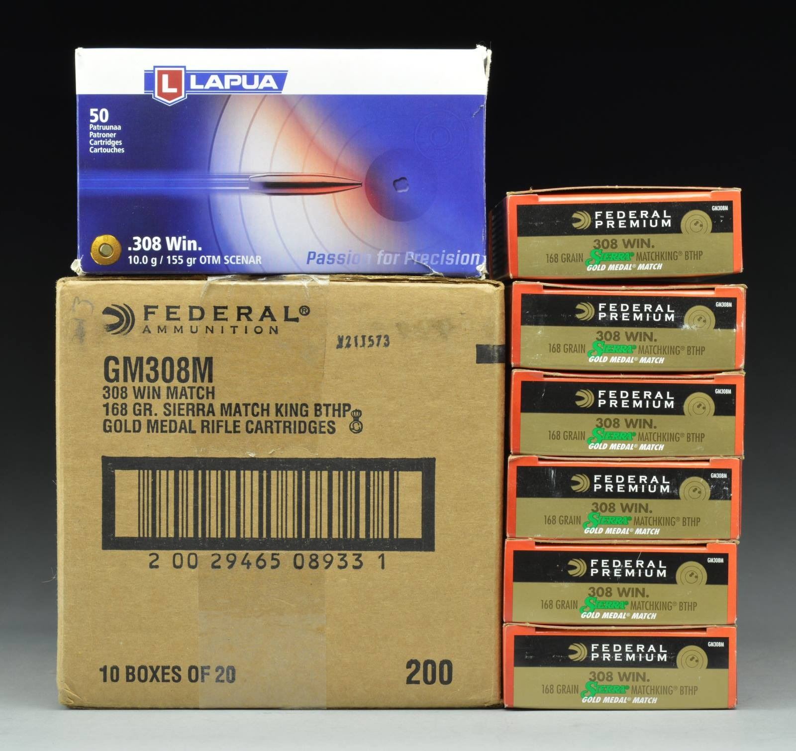 200 RDS. (1 Sealed factory box containing 10 boxes) of Federal 308 Win Match 168 gr. Sierra Match King BTHP. / 120 Rds. (6 boxes) Federal 308 Win Match 168 gr. Sierra Match King BTHP. / 40+ Rds. (1 box) of Lapua 155 gr. OTM Scenar. CONDITION: Lapua box in fair condition; balance very good to near excellent. Ammo appears serviceable. (02-16998/MD). $300-600.