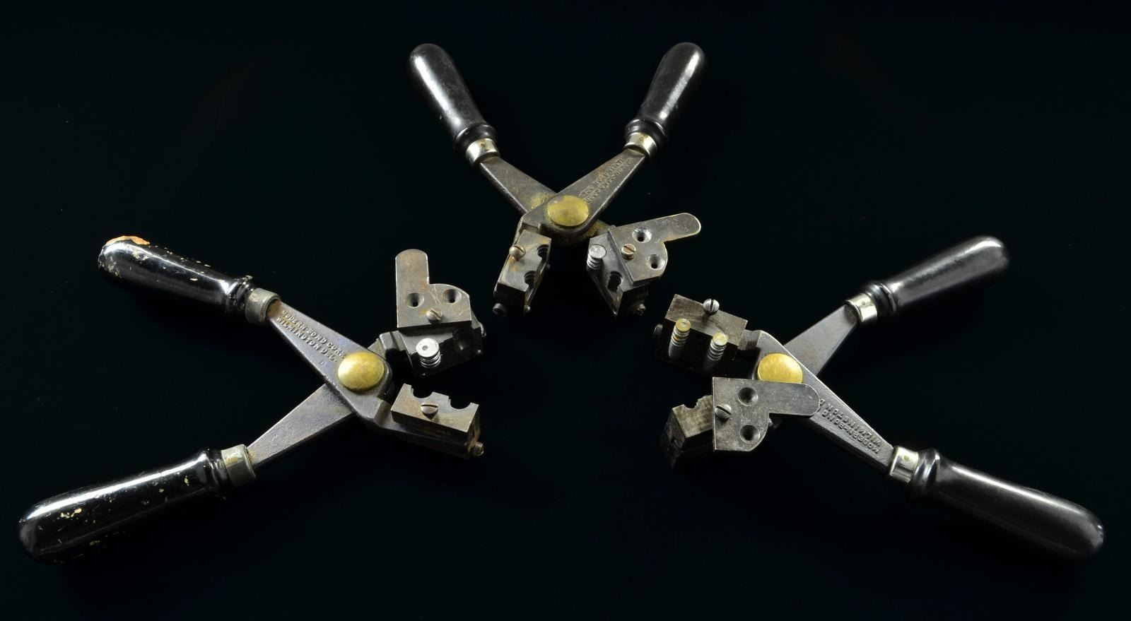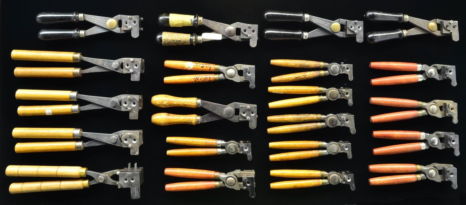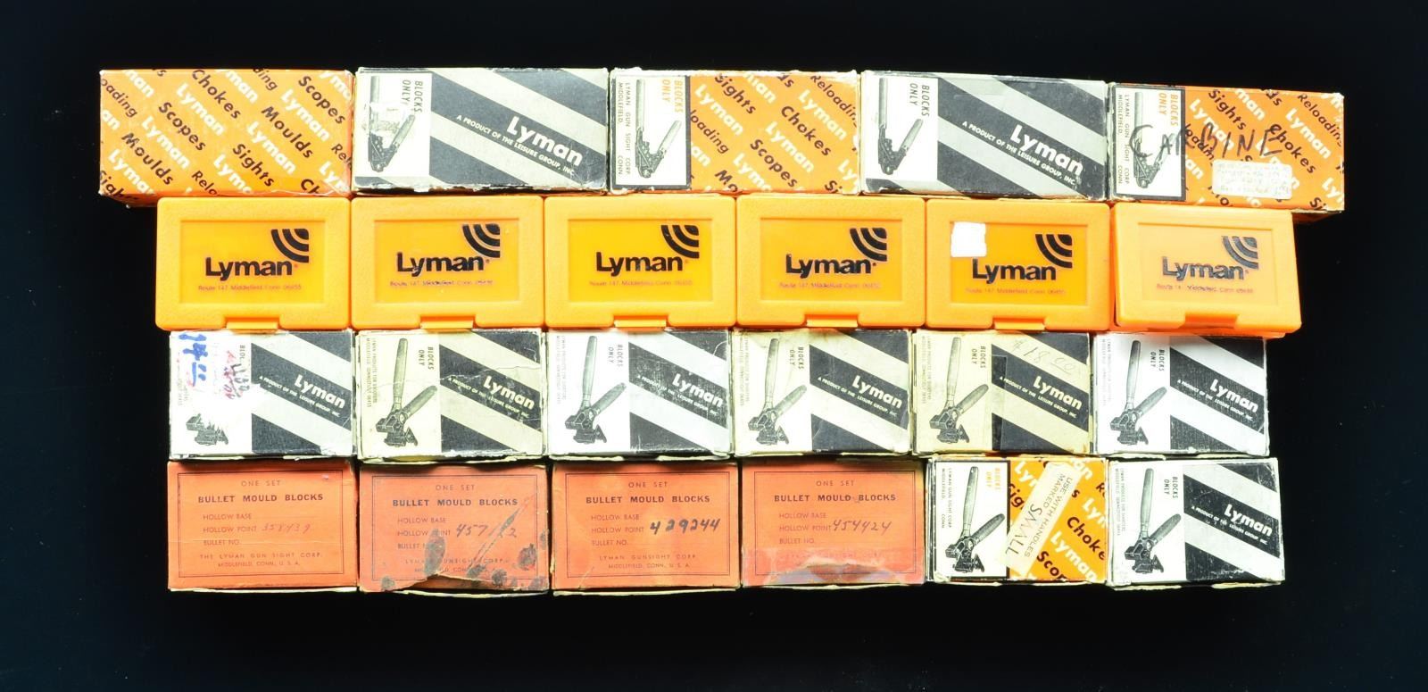 10 Ideal bullet molds w/ handles. / 1 Lyman bullet mold w/ handles. / 7 Modern-Bond Corp. bullet molds w/ handles. / 3 Hensley & Gibbs bullet molds & handles. / 1 Cramer bullet mold & handles. / 2 Unknown brand bullet molds w/ handles. / 1 Set of handles. / 18 Lyman 2 cavity mold blocks; 4 in vintage red boxes. / 5 Lyman 4 cavity bullet molds. CONDITION: items in good overall condition w/ wear, residue & patina. Boxes are in generally good worn condition; boxes for noted items in poor dilapidated condition. (02-16955/MD). $500-800.