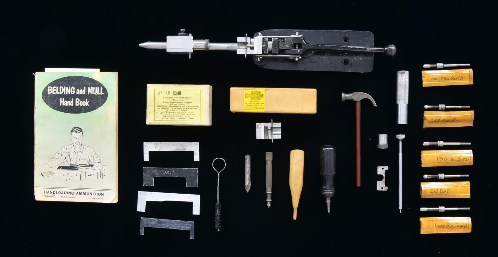 Tool is set up to reload for 6.5X54MS. Accessories for loading tool include 6.5 neck sizing & seating dies plus spare 30-06 size sliding cradle, .287 neck sizing die, .263 & .268 expanding plugs, rnd. nose, Spitzer & hollow point seating plugs. Decapping rod. Group includes original 1953 dated Belding & Mull handbook & price list. Ideal full length resizing tool in 6.5m/m in original 2 piece box. Partial box of IPCO #046 colloidal graphite wads. Items contained in vintage shop made wooden case which also contains several hobbyists made tools & case gauges. CONDITION: tool has light wear commensurate w/ careful use & retains a lg. percent of original black finish. Balance of parts are bright. Ideal sizing die box has neat vintage tape repair & penciled name. Belding & Mull handbook has sm. tears, slightly loose binding & staining but is complete & legible. Wooden box has worn, dark brown finish w/ sm. repaired corner on cover. (02-17422 /RW). $150-250.