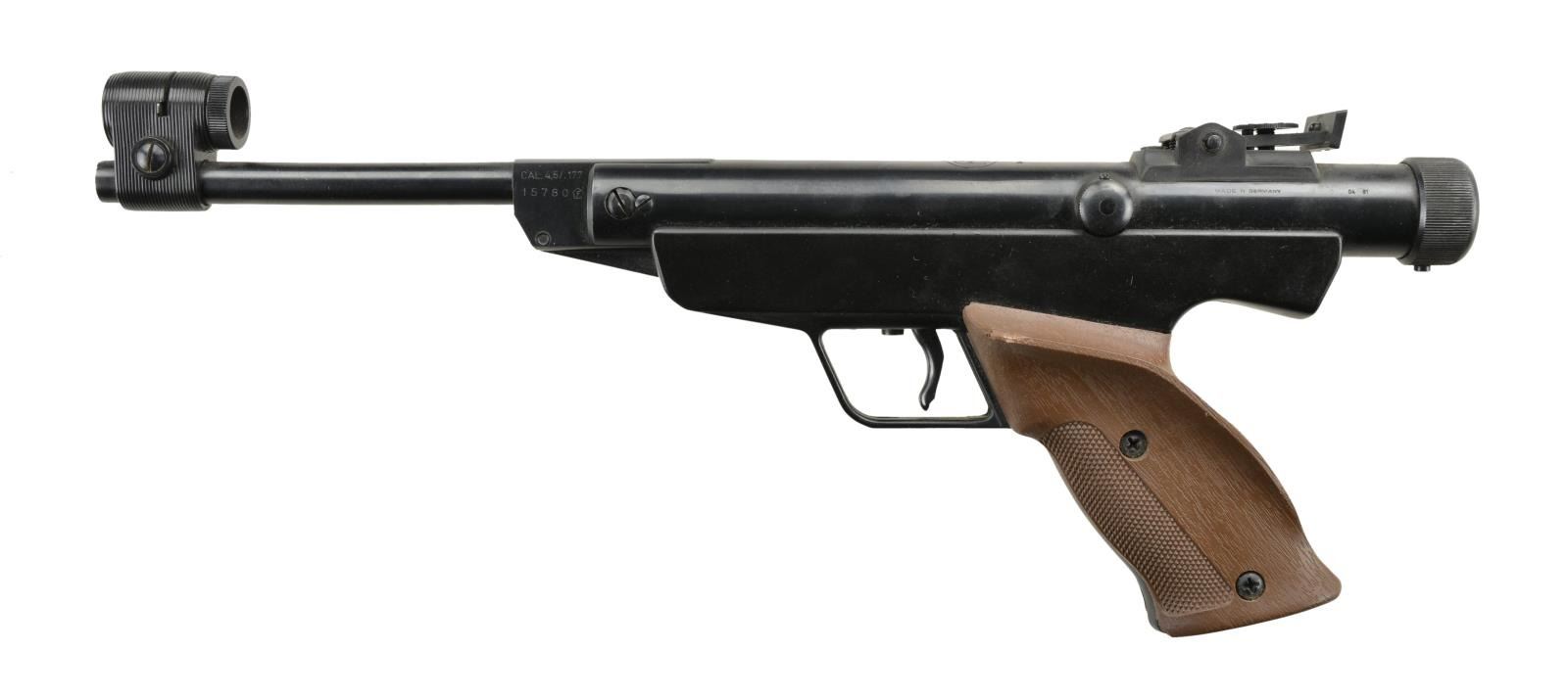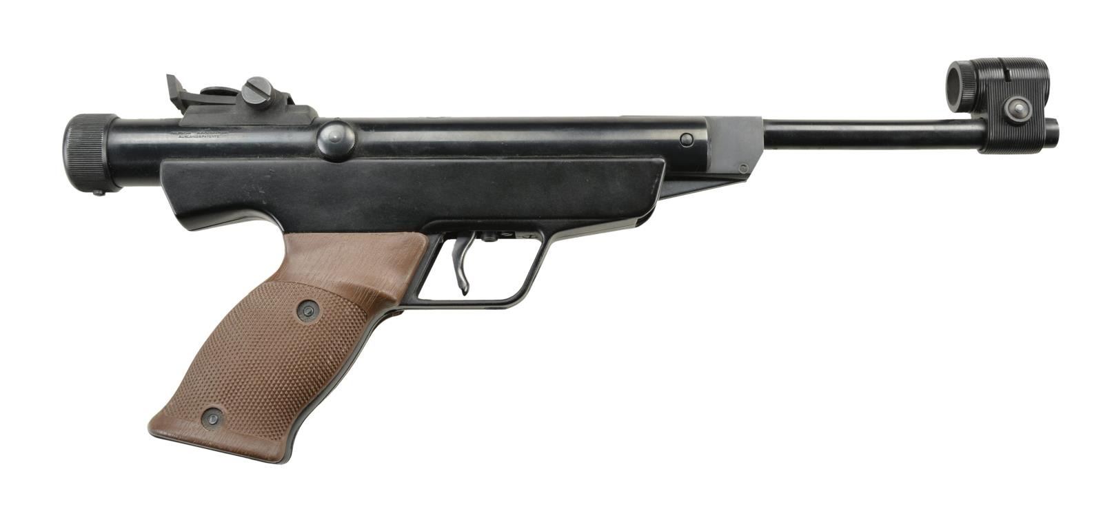 Cal. 4.5/.177 (450 FPS). S# 15780. Bbl. 7" w/ rifled bore. Single stroke cocking Giss recoilless action. Blued action tube & bbl. Globe post front sight & square notch adj. rear sight. Black finished polymer frame. 2 Piece target grips w/ palm rest. CONDITION: very good overall w/ handling marks & pinprick oxidation. Good compression. (02-17029/MD). $75-150.