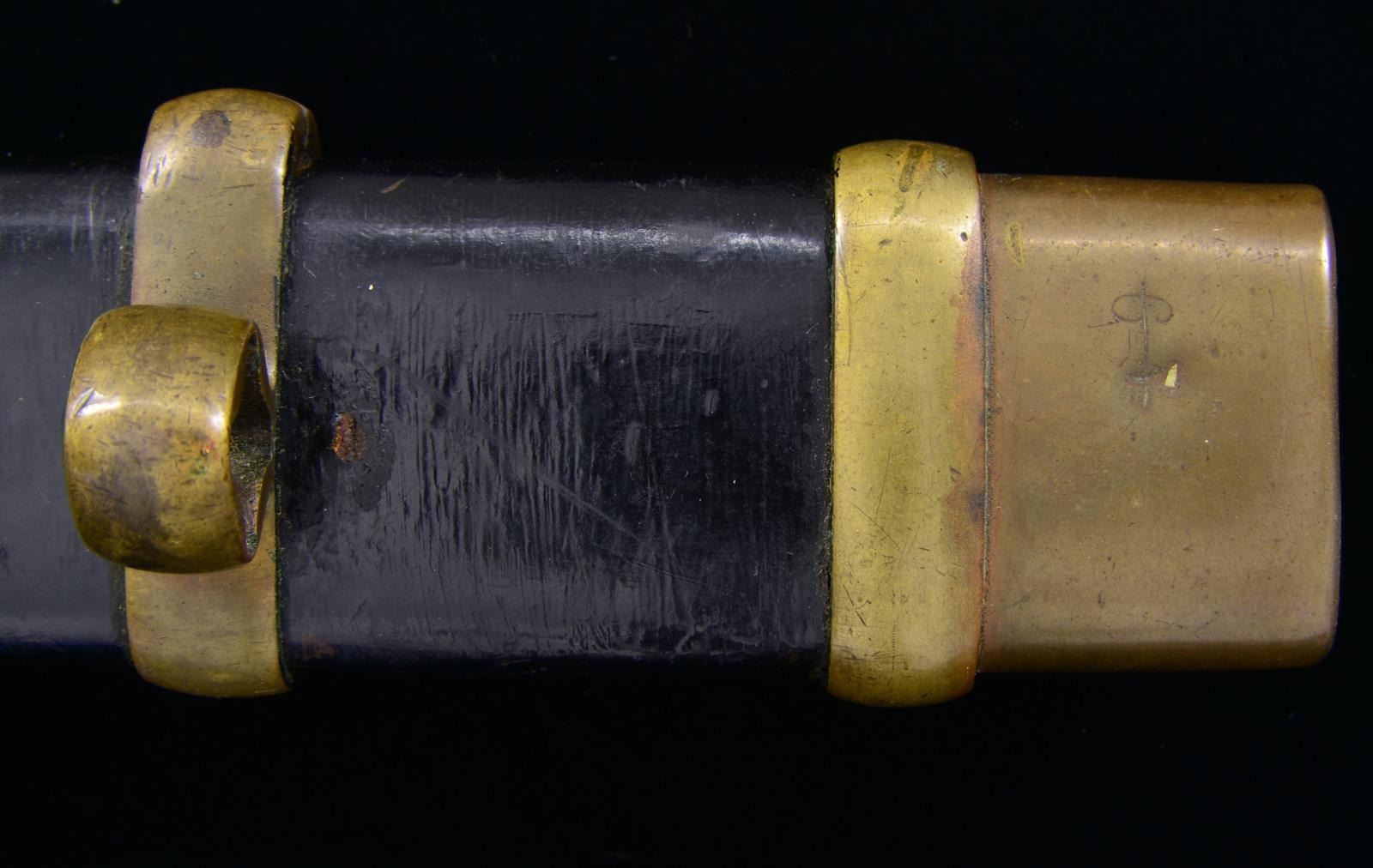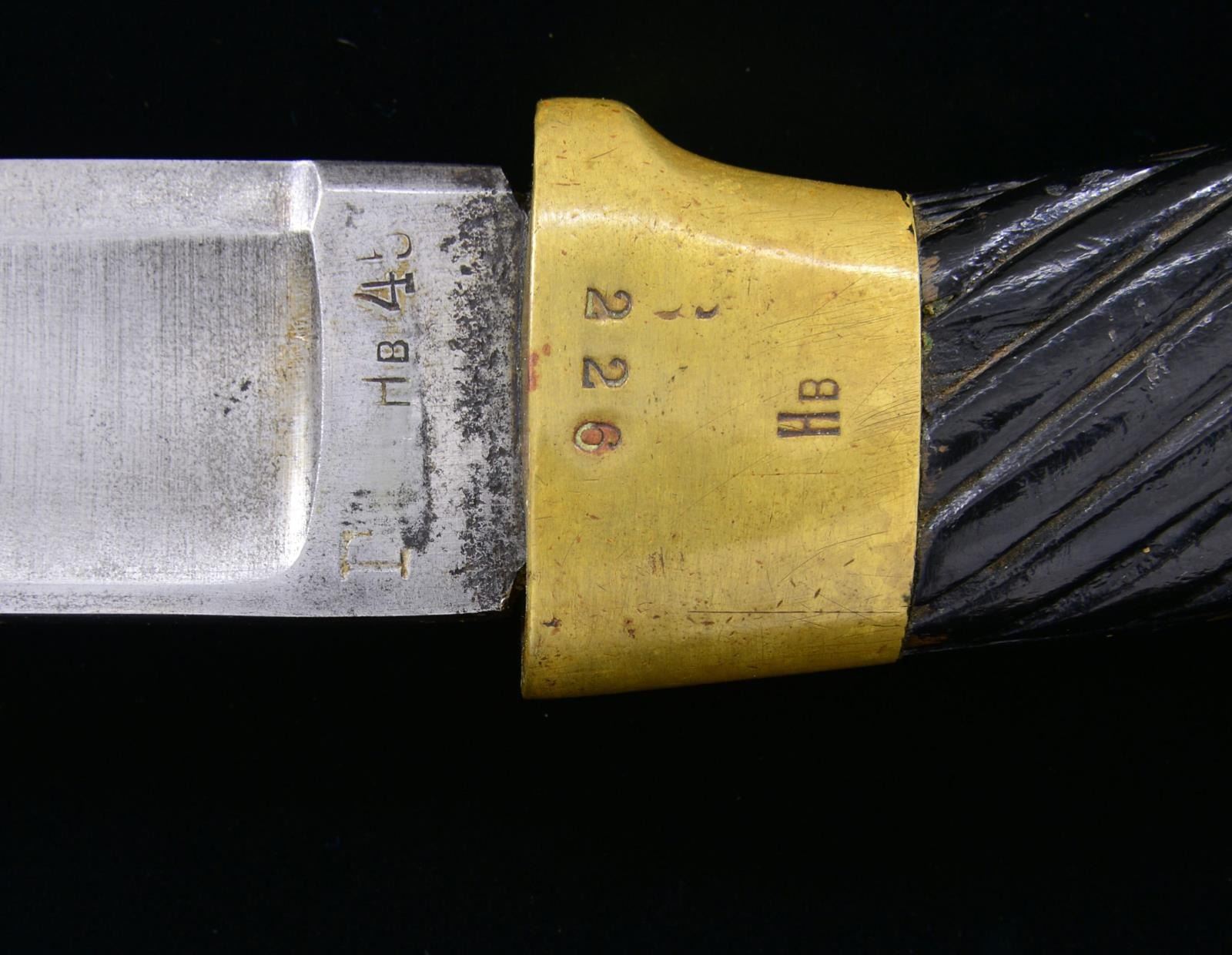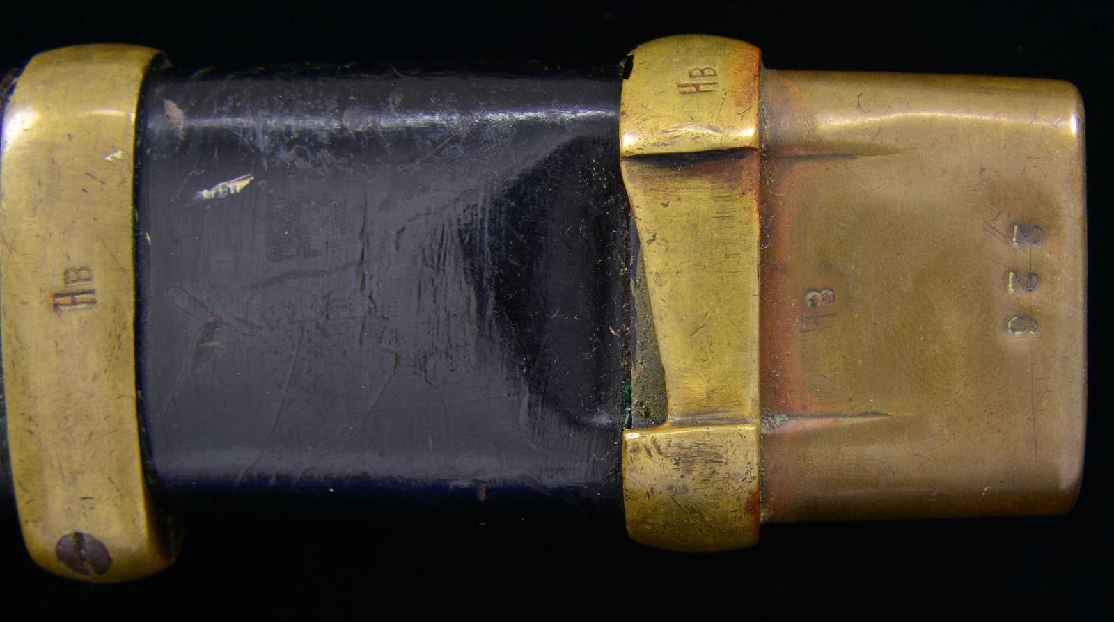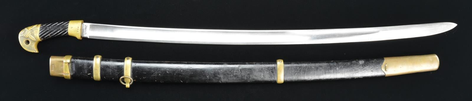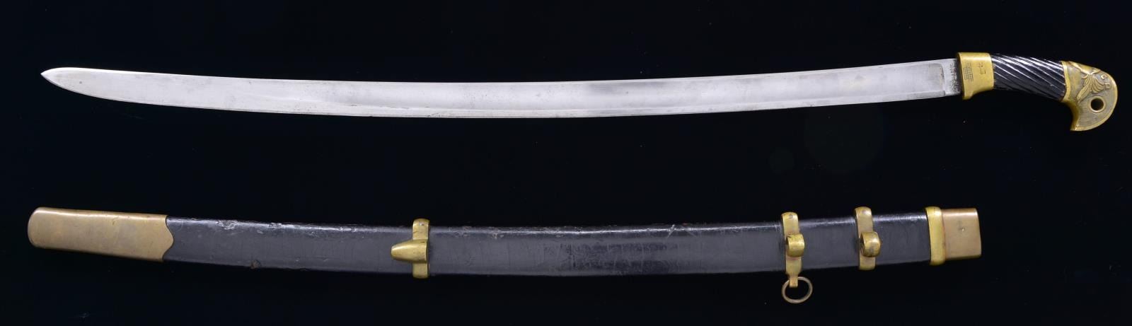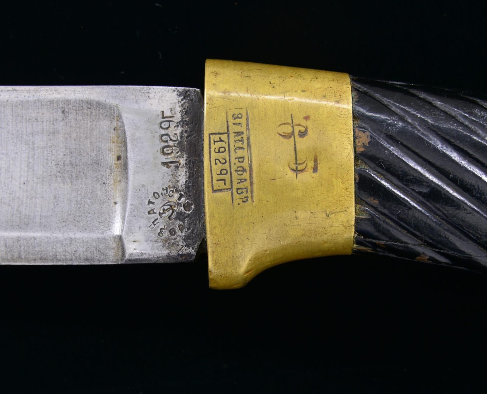 Overall length: 38 1/2". Blade length: 32 1/8". A classic Soviet era Cossack saber generally referred to as a Shashka. Blade is stamped w/ hammer & sickle along side "1929r" stamp on left ricasso then "R nB45" stamp on right ricasso. Brass hilt stamped "226" & "HB", then another stamp w/ 1929 date. Bird head shaped pommel w/ "C.C.C.P.", hammer & sickle. Reeded wood grip. Brass mounted leather covered scabbard w/ Mosin-Nagant bayonet mounts on the side. All brass mounts are stamped w/ the letter "HB". Throat is stamped "226" & crossed out " 65". CONDITION: Blade has dull appearance w/ cleaned patina, heavy dark patina near hilt. Brass has mellow patina. Grip shows sm. chips & scratches. Scabbard shows moderate wear, cracking & gouges. PROVENANCE: Estate Collection of Kenneth Horn (Grandson of JC Higgins). (02-16315-9/MD). $300-500.