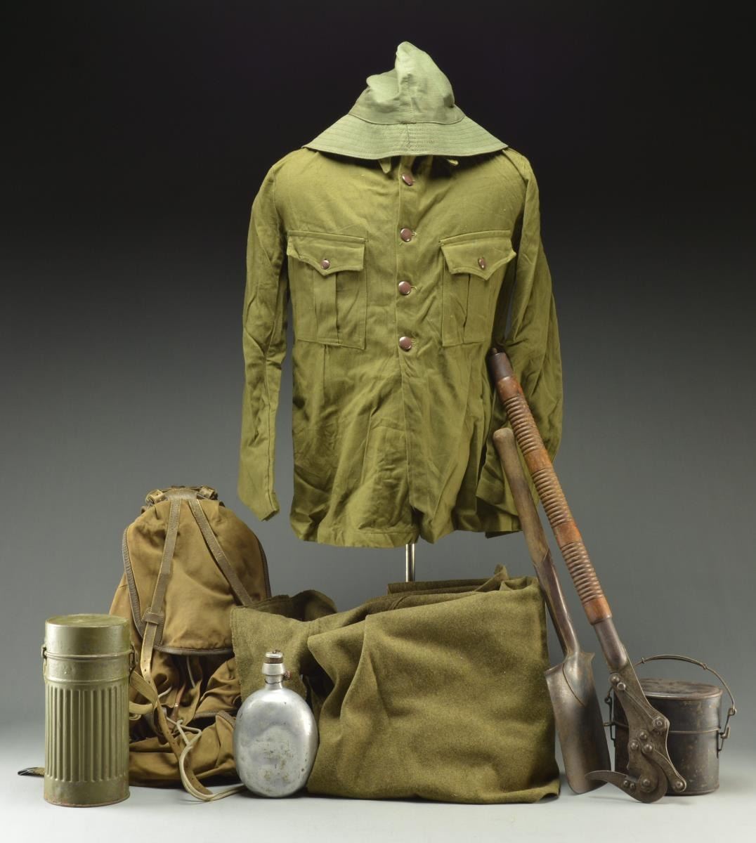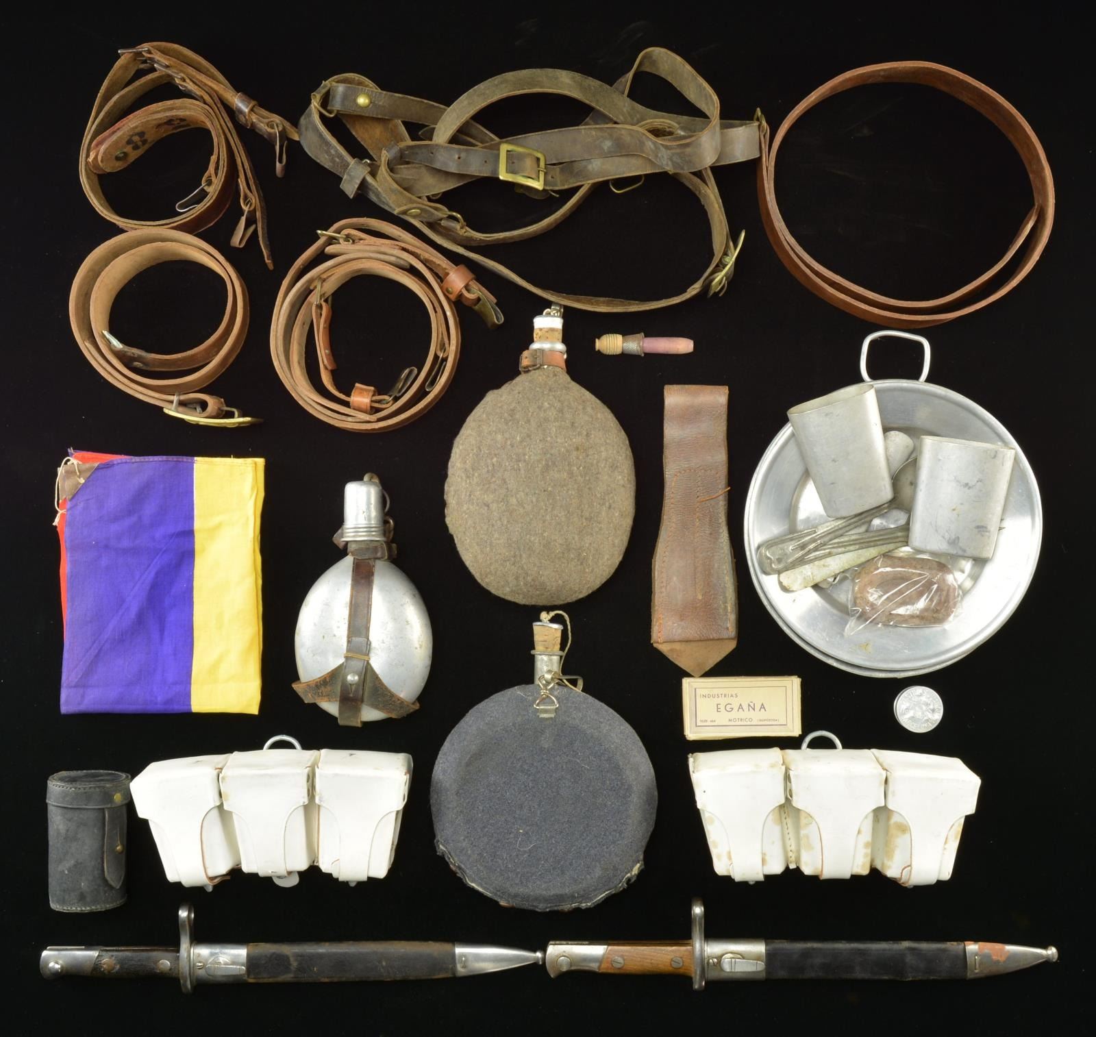 CIVIL WAR. This varied group includes a blue covered circular canteen. / A gray covered ovoid canteen. / An aluminum cork top canteen. / A sm. ovoid canteen w/ leather suspension brace. / A Leather belt w/ Spanish Infantry buckle. / A similar belt, no buckle. / An officers Sam Brown style belt w/ over the shoulder sling. / A brown leather bayonet frog. / 2 Leather over the shoulder equipment straps. / 2 White, 3 pocket ammo pouches for Spanish Mausers. / A sm. leather grenade pouch. / A gas mask w/ metal German style cannister. / A lg. entrenching shovel. / An unidentified implement believed to be a barbed wire cutter. / A black painted 1908 mess kit. / A sm. group of mess gear including plates, cups, spoons & more. / 2 Spanish M1893 Mauser bayonets. / A sm. red, yellow & purple flag for 1 of the Spanish Civil War factions. / An olive drab sewn utility cap. / An olive drab capote-manta. / An olive drab uniform tunic. / A dark tan & leather backpack. CONDITION: all items show light to moderate wear. (02-16398/BF). $400-700.