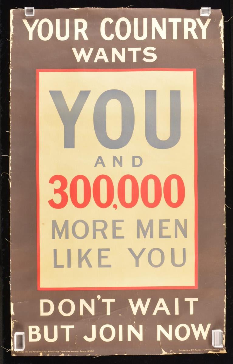 This cloth backed poster measures approx. 37 1/2 x 23 1/2". The poster reads "YOUR COUNTRY WANTS YOU AND 300,000 MORE MEN LIKE YOU DON'T WAIT BUT JOIN NOW". The bottom of the poster is marked at base "Published by the Parliamentary Recruiting Committee London. Poster No 102". & "Printed by C.W. Faulkner Co. London E.C.". Poster shows a few tears & some fraying around the edges. (02-17440/MJC). $100-200.