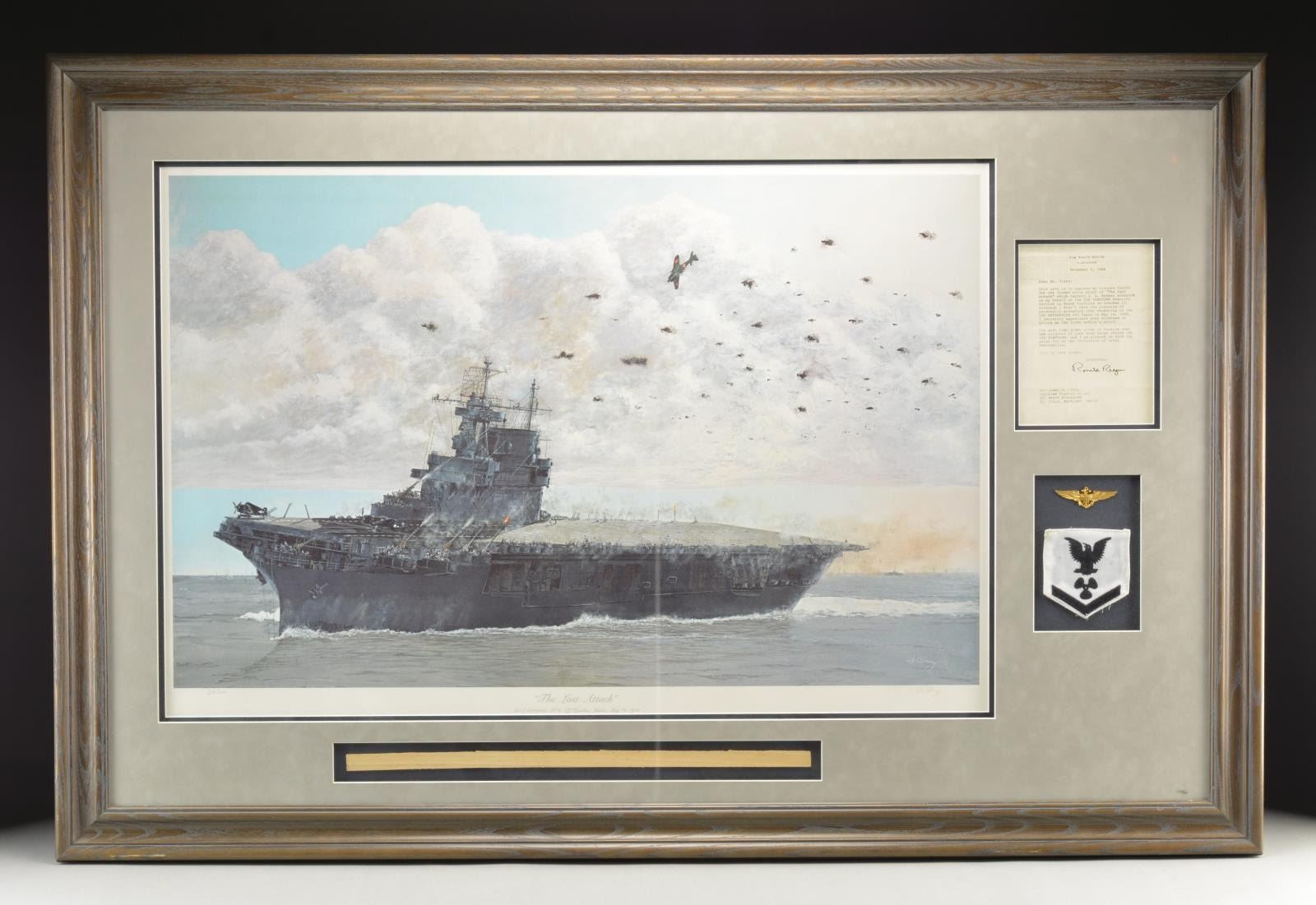 FROM RONALD REAGAN. Print by James G. Clary. This is a framed print depicting the Kamikaze attack on May 14th, 1945 that took CV-6 USS Enterprise out of the war. The print is numbered 218/1000. Included w/ this print are a Machinist Mate patch, navy aviation badge & a letter from President Ronald Reagan. The Reagan letter is dated November 5th, 1986 & thanks the artist for the original copy of this painting. The original copy of this painting now hangs on the USS Yorktown. The frame measures 54" x 36". The frame shows moderate shelf wear. (02-16953-4/MJC). $500-700.
