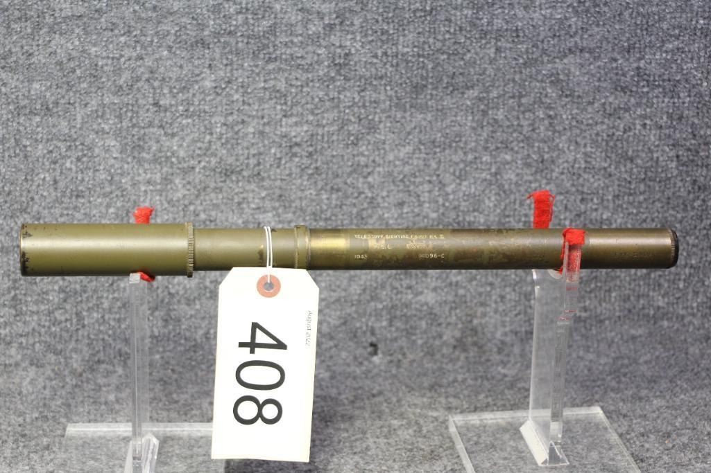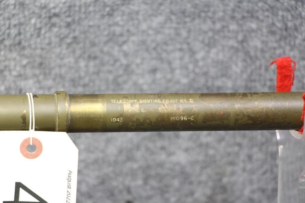 WW2 British artillery sight, Telescope Sighting No.22 Mk.1. The No.22 Mk1 scope was used on the 2 Pounder, the 6 Pounder, the 25 Pounder and the Bofors AA gun. The optics are of unity magnification and approximately 34.5cm in length. In good condition with excellent clear optics.. Made in 1943.