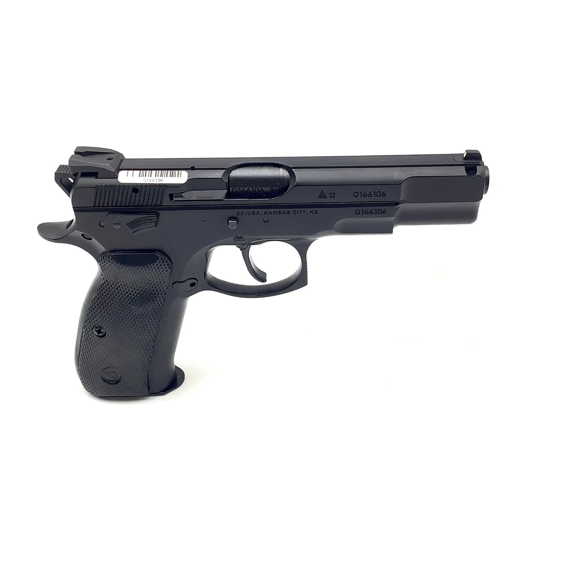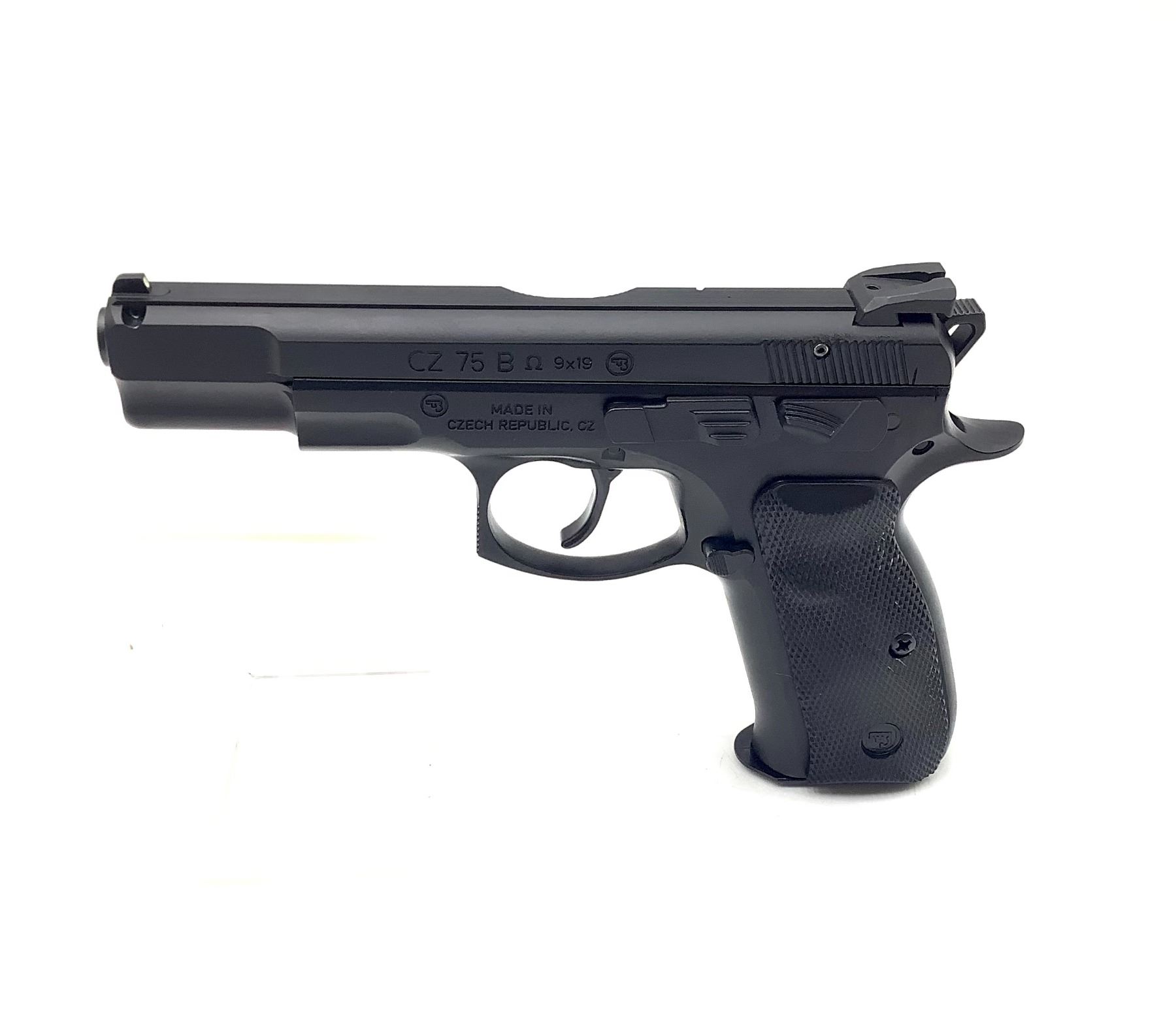 CZ 75B Omega Semi Auto Pistol Black Polycoat 4.6" Barrel 9mm, Restricted, New. Includes one magazine and plastic case. This is a restricted firearm.