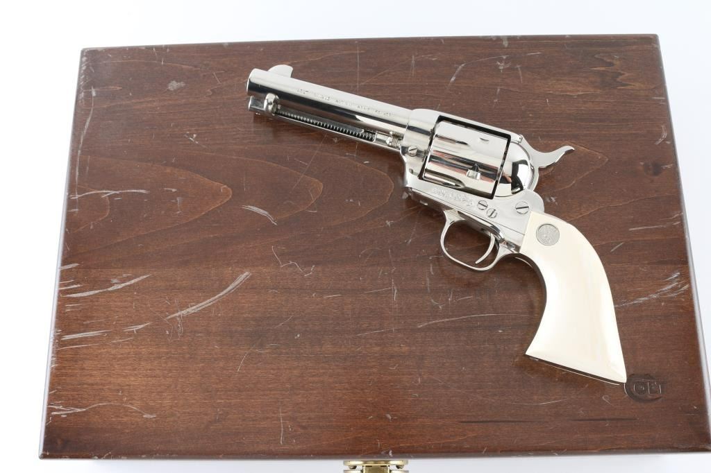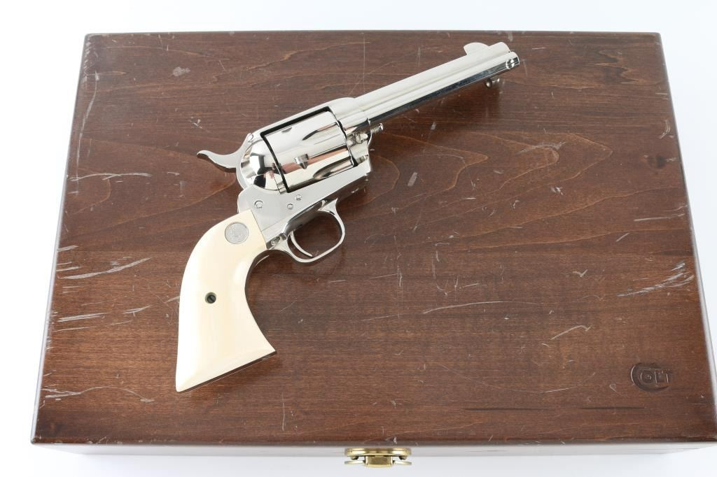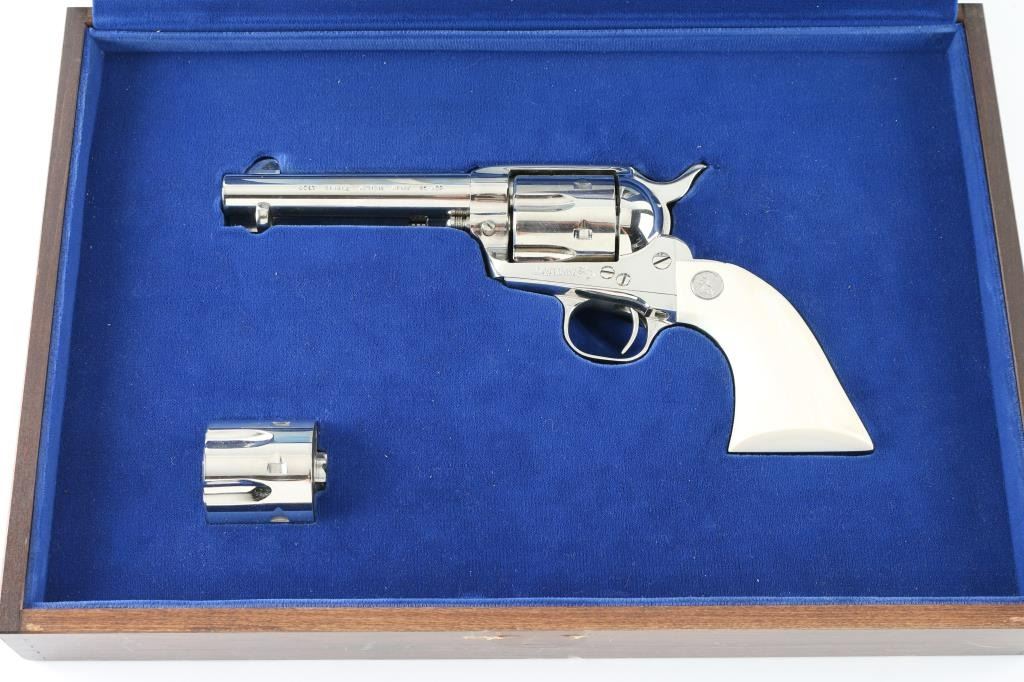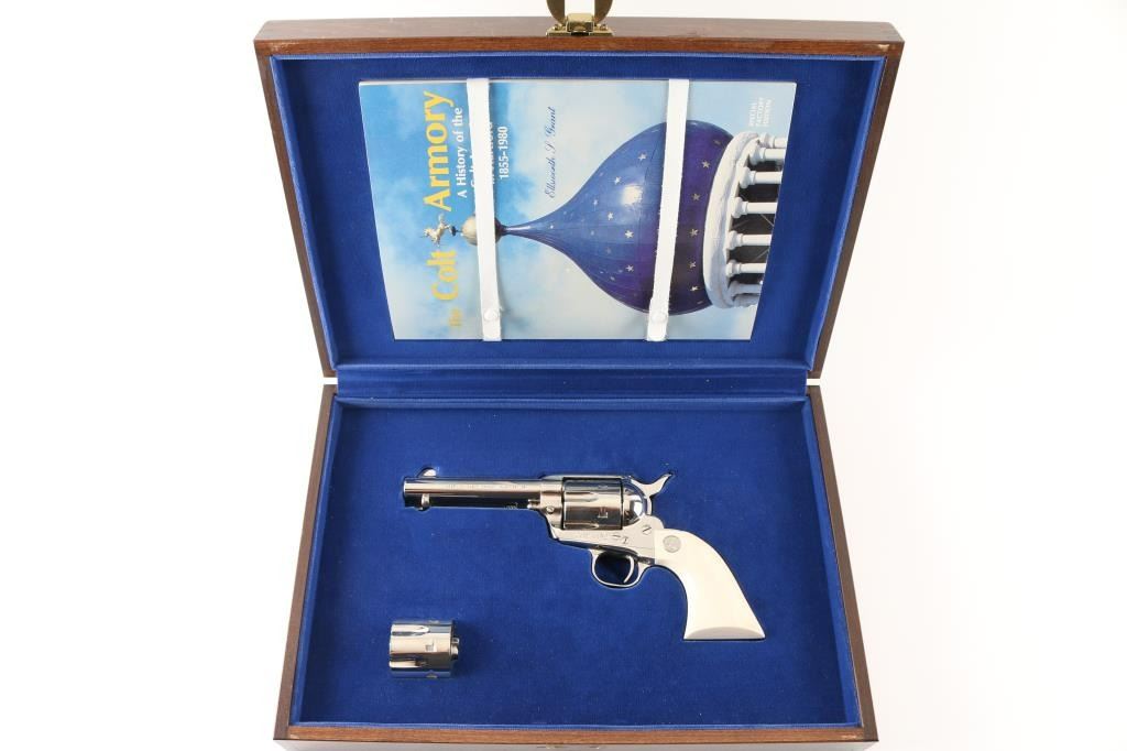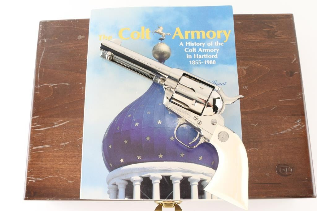 Special Armory Edition 3rd Gen mfg 1983 with extra .45acp matching cylinder, medallion ivory grips, nickel finish, presentation case with Colt Armory 1855-1980 book in lid. The revolver is fine to excellent condition with little to almost no use showing very slight index line on cylinder but no evidence of firing. Case shows storage sctraches but interior is fine. NRA Excellent Modern Firearm