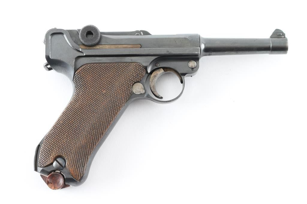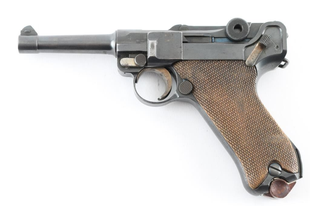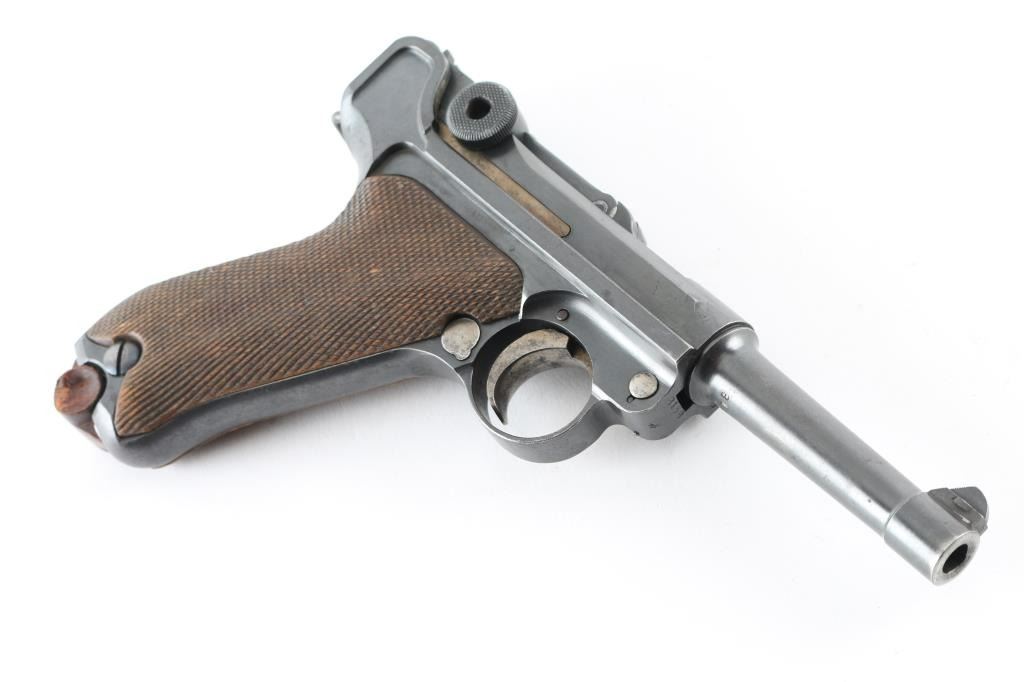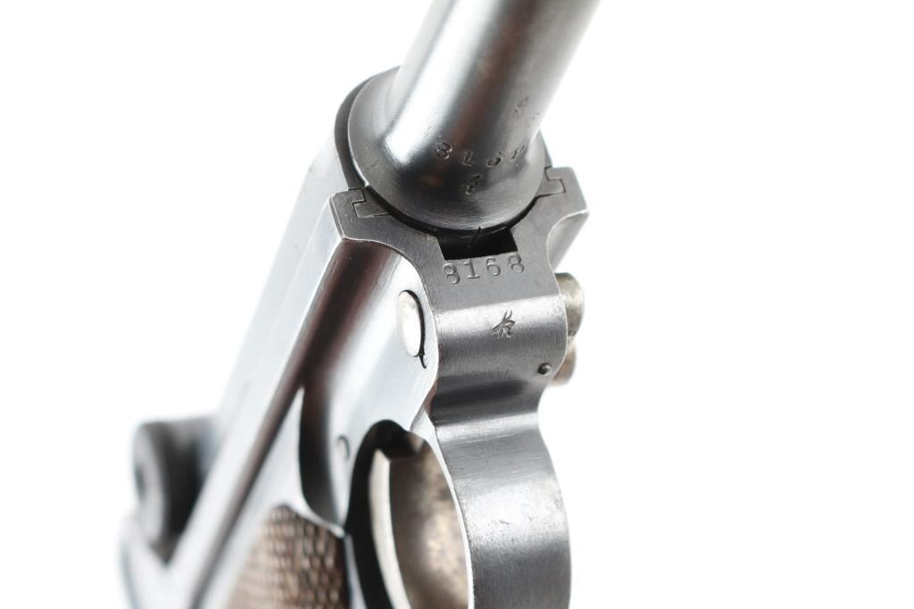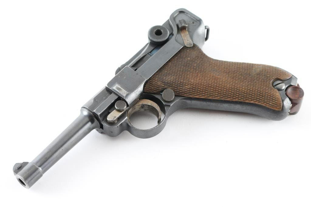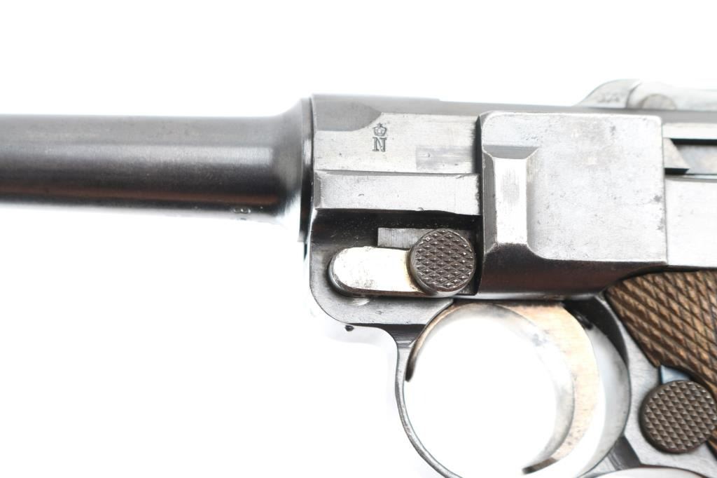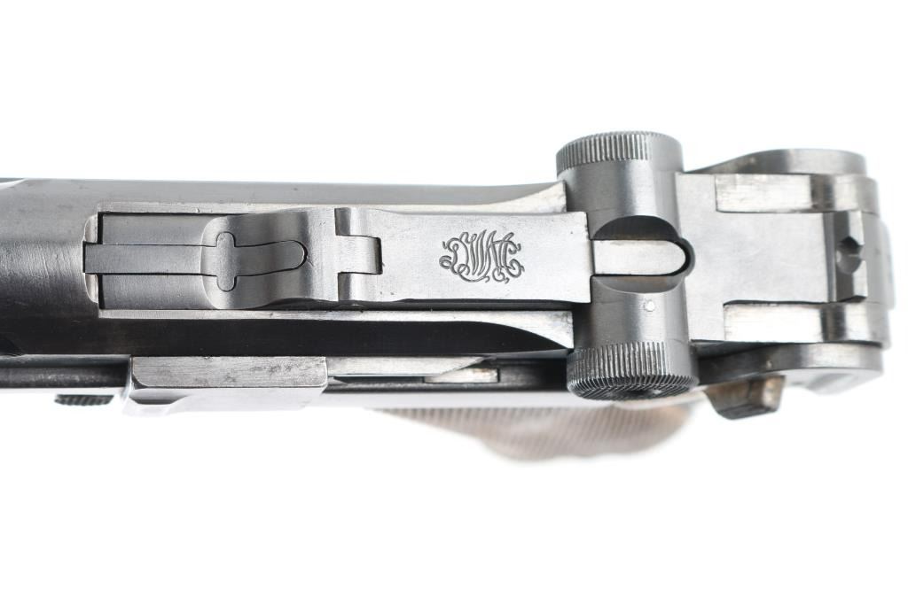 German pistol marked "DWM" on toggle, chambered for 30 caliber (7.65mm) Luger cartridge. Features a semi-automatic toggle action, 8 round magazine, approx. 3.9 inch barrel, fixed sights, manual safety. Retains stock lug, lanyard bar. Bore is very good condition. Retains 90% dark bluing, with scattered pinprick patina, edge losses, rubbing wear on high points. Slightly rough texture under finish in several areas. Trigger, safety, locking bolt and ejector retain much dark straw color, some color change along each part to an almost brown color. Grips are good condition with no looseness, even handling wear to points of checkering. Magazine is Mec-Gar marked aftermarket, nickel plated with wood plug (some damage to plug). Observed numbers match on frame, barrel, last two digits below rear sight, on trigger. No number observed on sideplate or extractor. Crown over "N" proofs show slight dishing. Small faint "Germany" stamp on right side. No importer marks observed. Appears refinished at some point. Condition is NRA Very Good (appears refinished) *** C&R Firearm ***