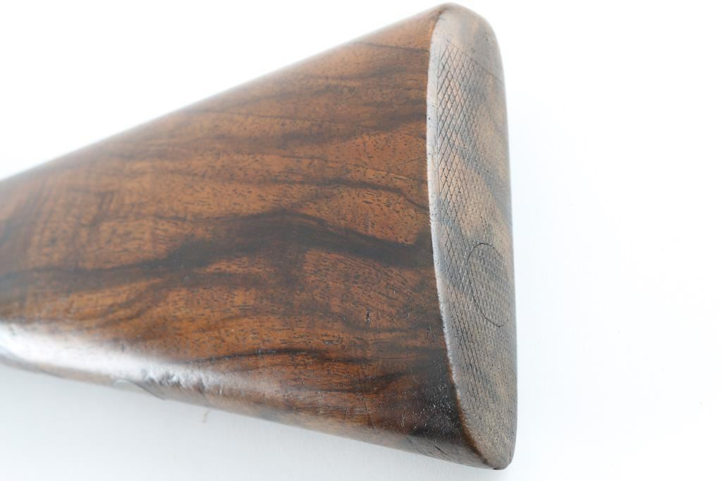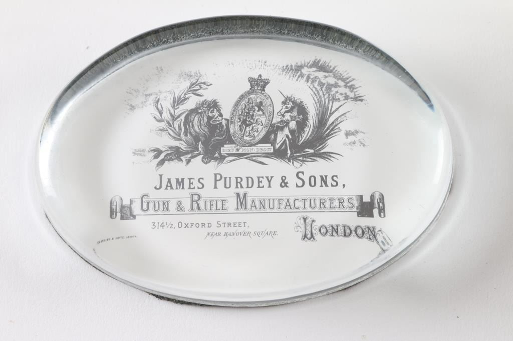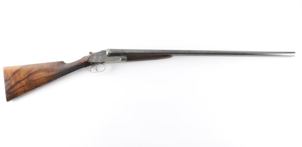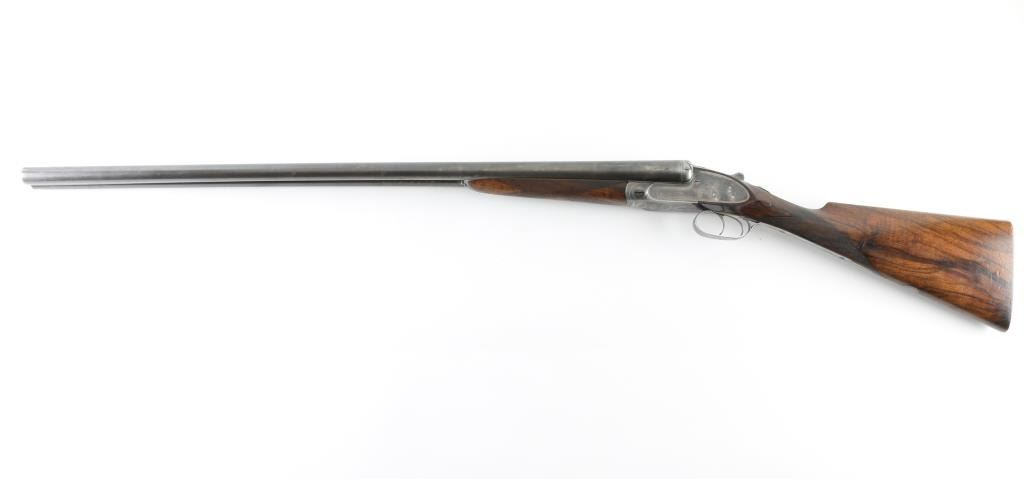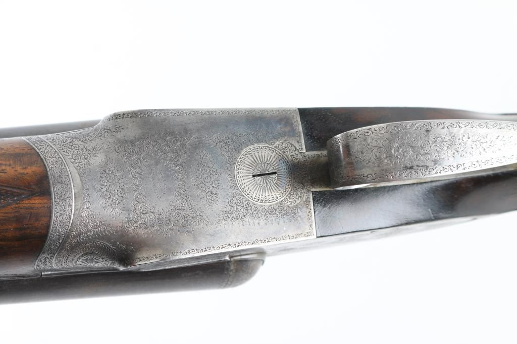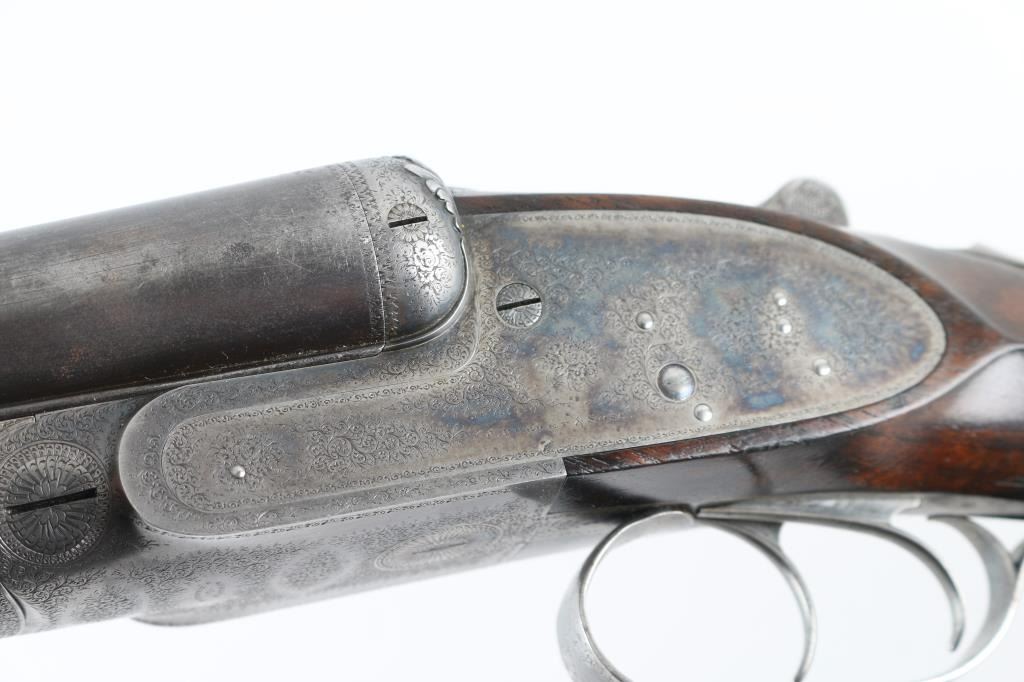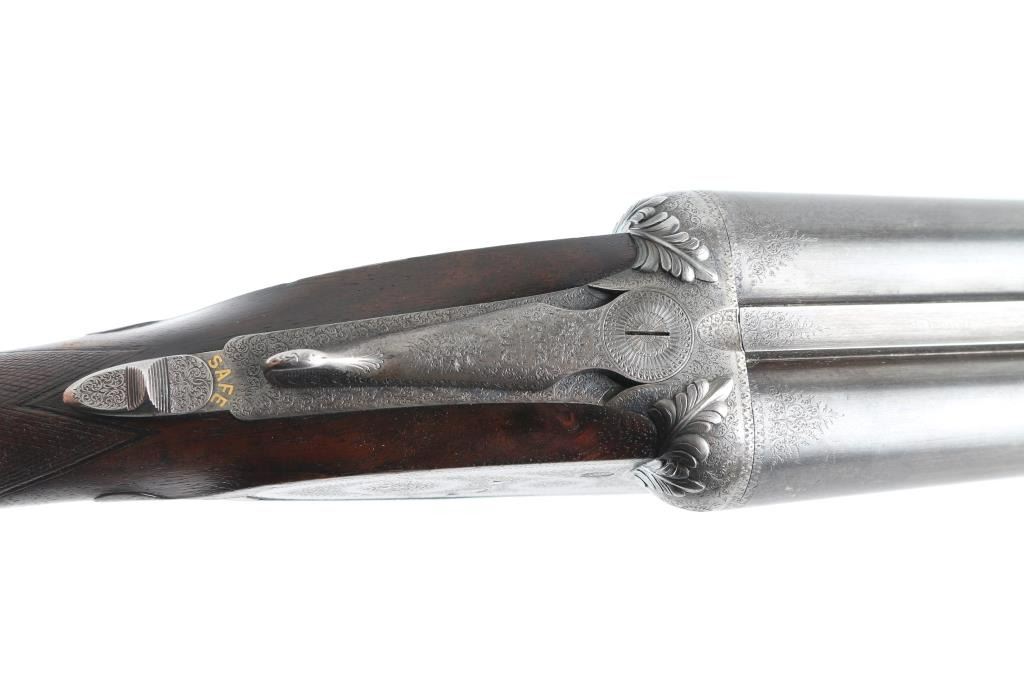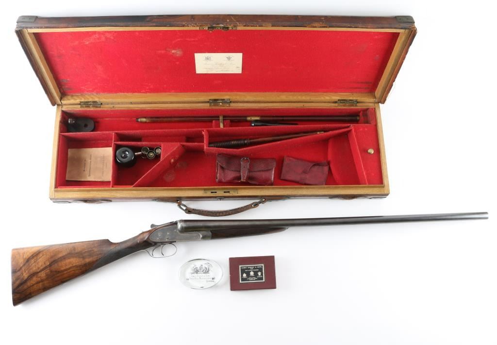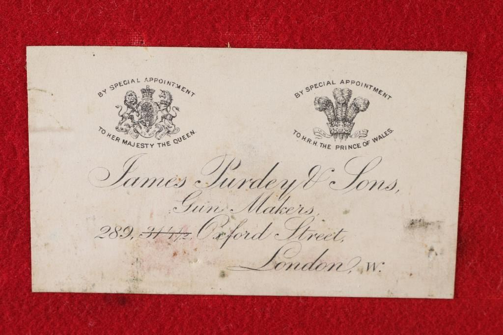'Cased Gun' British made Side by Side internal hammer sidelock shotgun manufactured circa 1881. Features blued barrels, engraved case colored action, extractors, tang safety (moves to 'safe' on opening), single extractor, double triggers, multi-point checkered walnut splinter forend with push-button release, checkered walnut straight grip shoulder stock, checkered face on butt, no buttplate, 30" solid rib barrels marked "J. PURDEY & SONS. 314 1/2 OXFORD STREET, LONDON. MADE OF SIR JOSEPH WHITWORTH'S FLUID-PRESSED STEEL"), Full/CYL chokes, small steel front bead. Engraving is a very fine floral scroll pattern covering over 75% of the action, with raised relief leaves on ball fences. "SAFE" engraved and inlaid in gold wire. Walnut is a select fancy figured wood with swirls and streaks in the grain, lots of contrast, some feather or fiddle grain showing. Fancy tear drop points behind side plates. Checkering is a finely spaced, cut to partial depth leaving flats on center of points. with deep border lines. Monogram oval on toe line is blank. Bores are very good. Barrels retain 75% coverage of a grayish or brownish toned blue, with some bare spots along bottom, edge losses. Barrels show very bright original bluing under the forend. Action retains significant bright case color, with bright blues mottled over grays, some dulling at edges. Wood is very good condition, many small shallow dents, some smoothing to the checkering, no observed cracks or chips. The included luggage style takedown case in leather bound, reinforced at corners, with leather straps, locking latch (no key provided), red velvet lined English fitted interior. Marked "BIDDLE" on lid (both embossed into leather and engraved onto brass disc). Leather is distressed & cracked, with broken handle attachment point, missing straps, damage to lining. Includes sectioned wood cleaning rod with attachments, black composition (bakelite?) accessory container with threaded cap, shell loading tools, snap caps, manual (with hand written emphasis to never snap this gun without using snap caps), vintage Purdey & Sons paperweight in box, factory correspondence. Condition is NRA Fine *** Antique Firearm ***