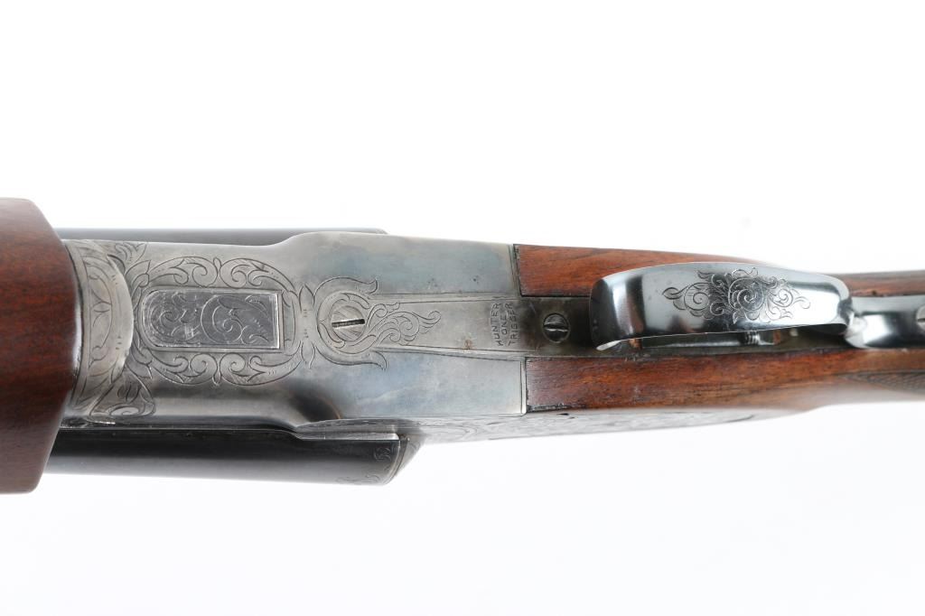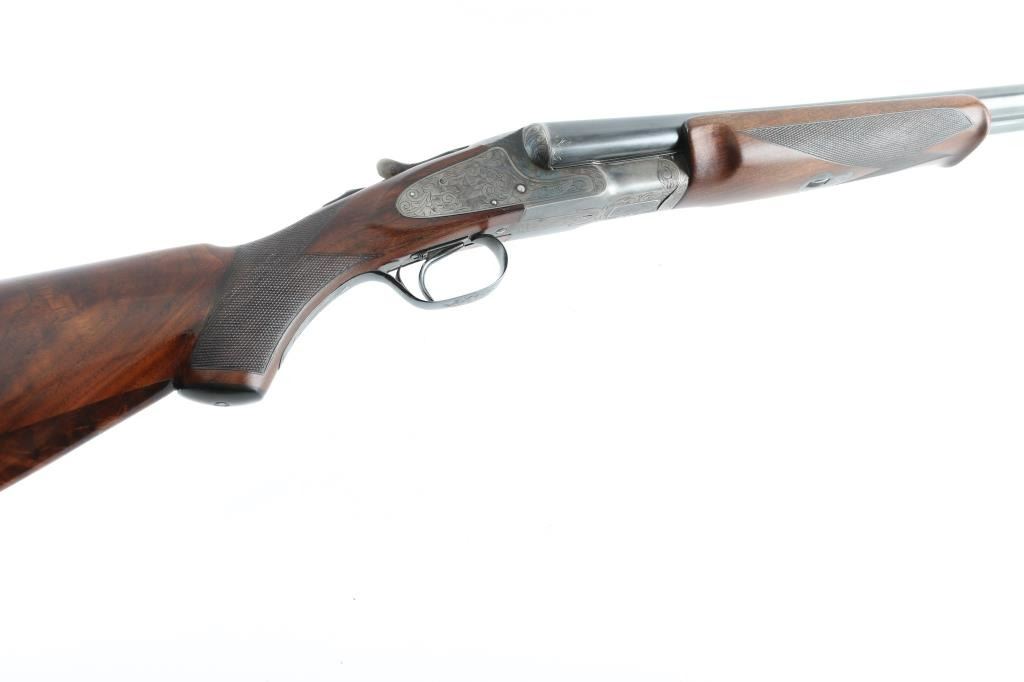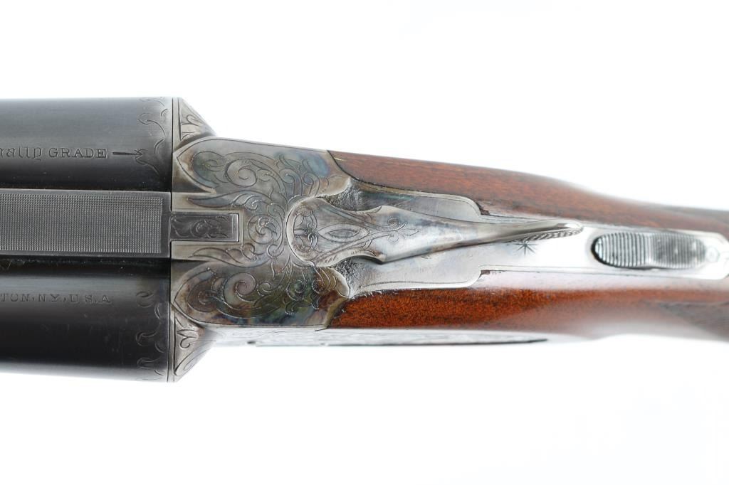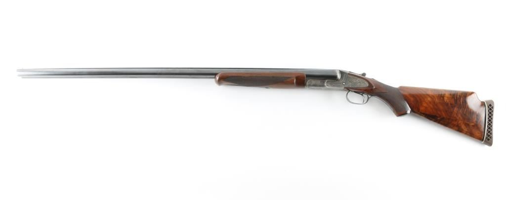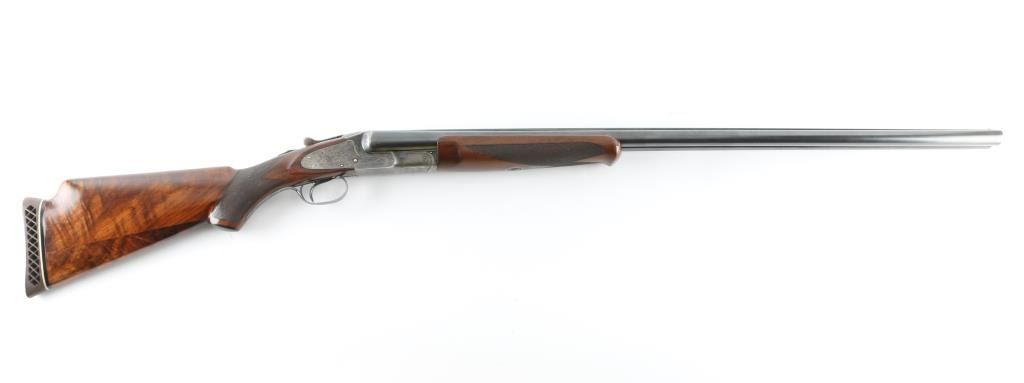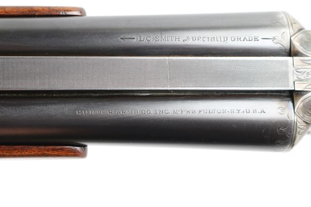 Double barrel side by side shotgun. Internal hammer side lock. Manufactured between 1912-1950, this example probably circa 1926. Features blued finish, engraved & case colored receiver & sideplates, checkered walnut beavertail forend with schnabel tip, walnut shoulder stock with checkered wrist & semi-pistol grip, high comb, composition grip cap, 32" wide vent rib barrels (marked "Hunter Arms Co", choked FULL/FULL), ivory bead front sight, tang safety, top lever, single trigger, barrel selector slide next to trigger, ejectors, 14" length of pull (13" to end of wood), ventilated rubber recoil pad. Bores are very good. Retains 80% dark blue on barrels, showing thinning, graying and edge losses on the remainder. Case colors are good, with some bright blue and dark grays, overall beginning to fade to a dull light gray. Floral scroll engraving covers 75% of action surfaces, full coverage on sideplates. Forend is very good, with some finish loss. Butt appears made from two pieces dovetailed together, tight seam, fancy figure and feather grain, overall very good condition, appears lightly varnished. Recoil pad is a bit hard. Serial number matched on barrels & forend iron. Barrels also marked with Hunter Arms proofs (under both barrels, box shaped proofs under chambers, and circular nitro proof marks under forcing cones), "NP", "S". Research indicates less than 7000 'Specialty Grade' guns made. Condition is NRA Very Good *** C& R Firearm ***