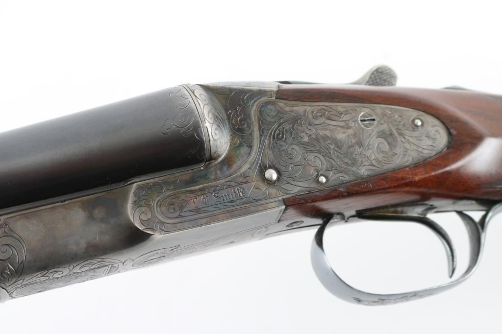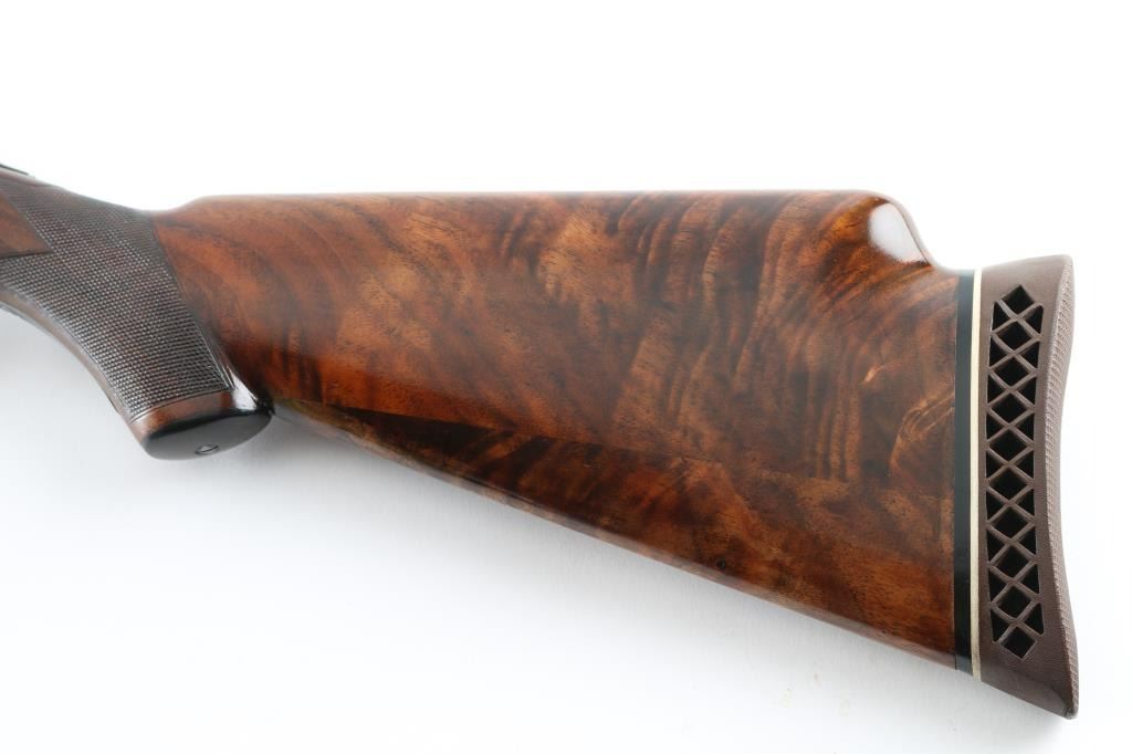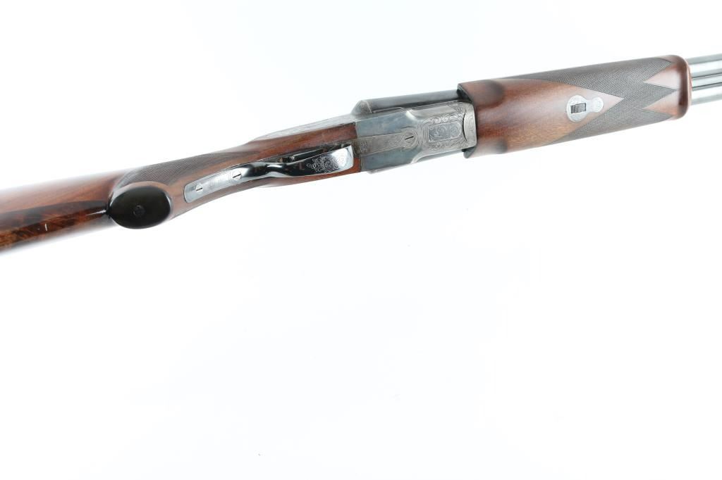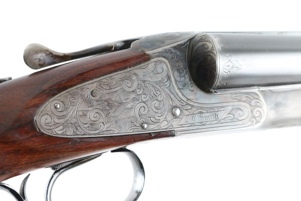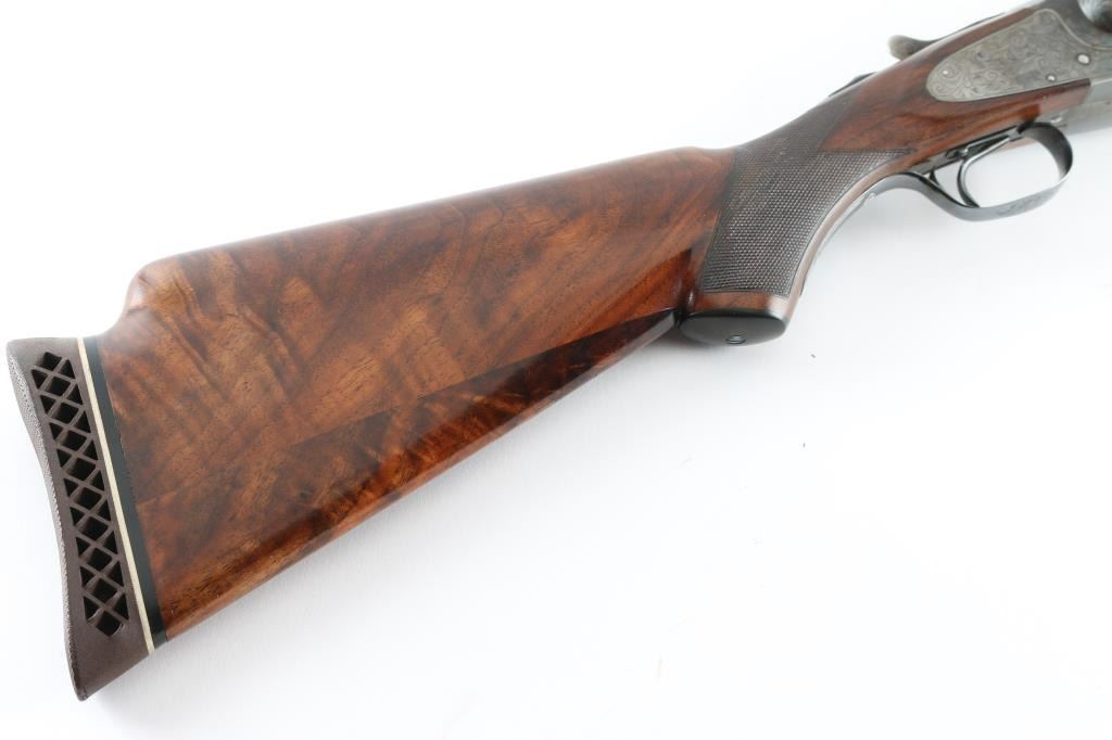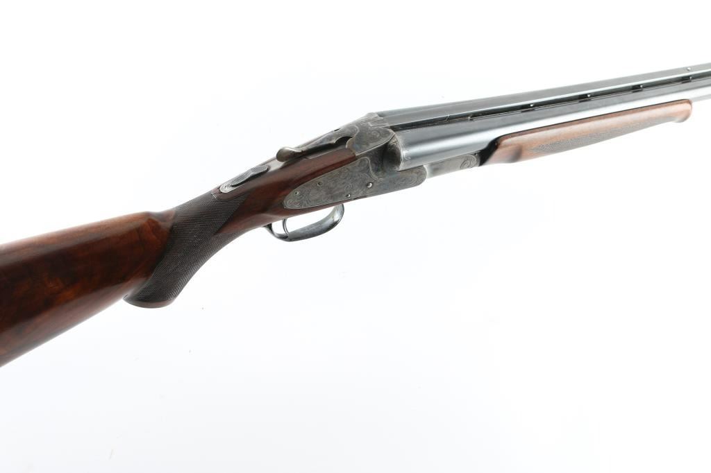 Double barrel side by side shotgun. Internal hammer side lock. Manufactured between 1912-1950, this example probably circa 1926. Features blued finish, engraved & case colored receiver & sideplates, checkered walnut beavertail forend with schnabel tip, walnut shoulder stock with checkered wrist & semi-pistol grip, high comb, composition grip cap, 32" wide vent rib barrels (marked "Hunter Arms Co", choked FULL/FULL), ivory bead front sight, tang safety, top lever, single trigger, barrel selector slide next to trigger, ejectors, 14" length of pull (13" to end of wood), ventilated rubber recoil pad. Bores are very good. Retains 80% dark blue on barrels, showing thinning, graying and edge losses on the remainder. Case colors are good, with some bright blue and dark grays, overall beginning to fade to a dull light gray. Floral scroll engraving covers 75% of action surfaces, full coverage on sideplates. Forend is very good, with some finish loss. Butt appears made from two pieces dovetailed together, tight seam, fancy figure and feather grain, overall very good condition, appears lightly varnished. Recoil pad is a bit hard. Serial number matched on barrels & forend iron. Barrels also marked with Hunter Arms proofs (under both barrels, box shaped proofs under chambers, and circular nitro proof marks under forcing cones), "NP", "S". Research indicates less than 7000 'Specialty Grade' guns made. Condition is NRA Very Good *** C& R Firearm ***