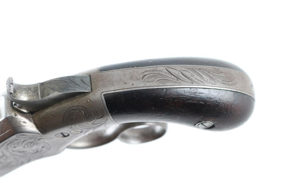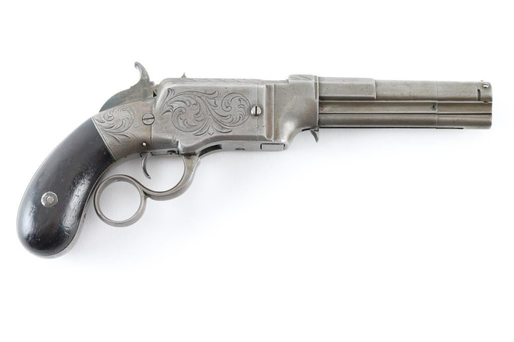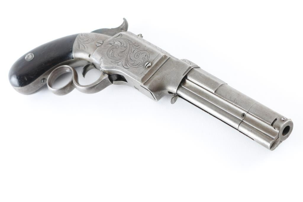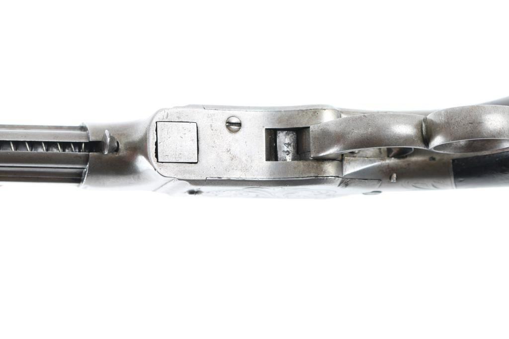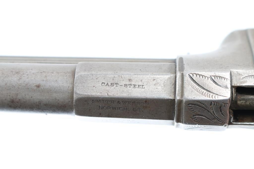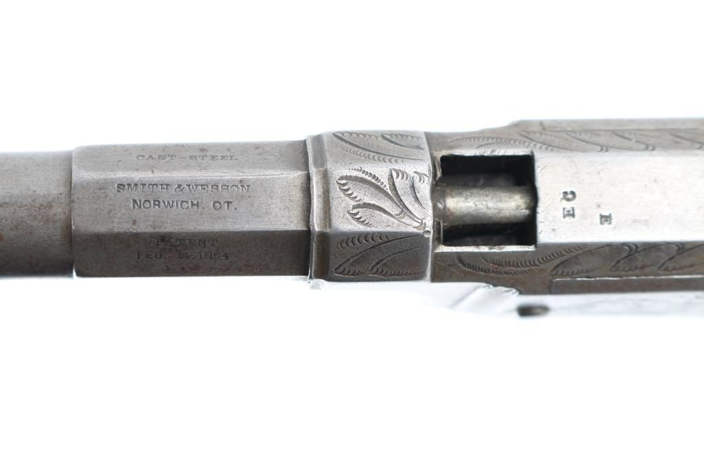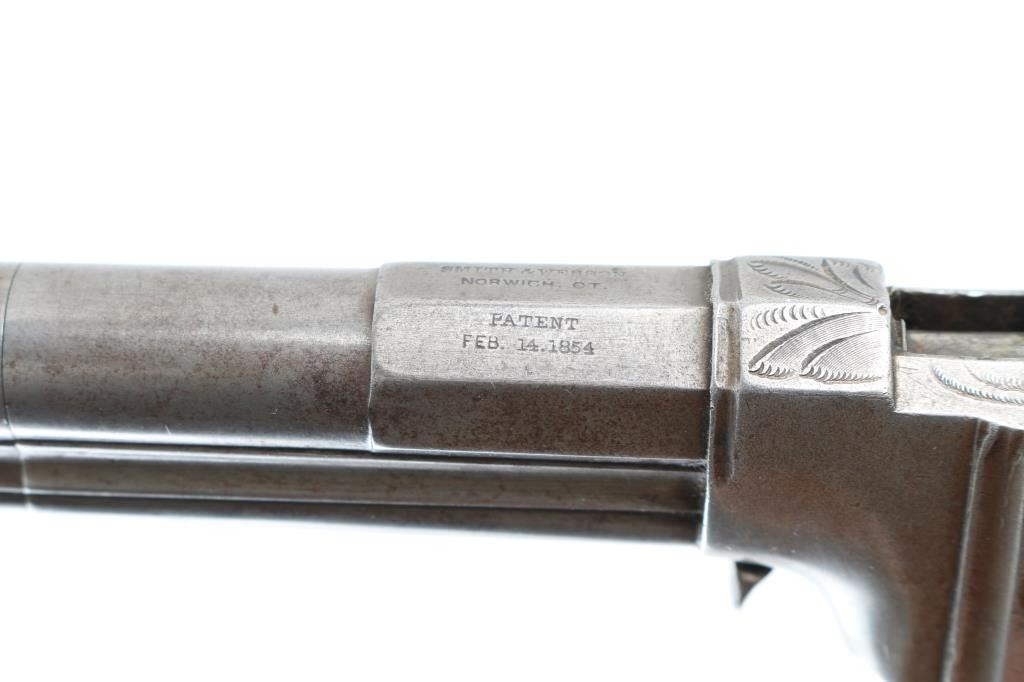 SN: 105 Antique small frame lever action repeating pistol chambered in .31 RF, manufactured in Norwich, CT circa 1854-1855. Approximately only 1,200 of the No. 1 Pistol were produced (that accounts for 66% of the total S&W Volcanic production). These scarce pistols are highly desired for many reasons, a few of which are they were the first Smith & Wesson and the immediate predecessor to the Henry/Winchester rifle. Features a 4” part octagon barrel, full-length front loading tube magazine, brass pinched post front sight, pinched post rear sight with ‘v’ notch, floral scroll engraved iron frame, checkered hammer spur, smooth trigger, round finger lever, and bag shaped grip with two-piece varnished Rosewood grips. Serial number 105 is observed on the left side of the frame under the grip and on the back of both grip panels. Other markings: Barrel - “CAST-STEEL”, “SMITH & WESSON/NORWICH, CT.” and “PATENT/FEB. 14.1854”. And Frame - “E C” and “E”. Pistol retains few traces of original finish with the majority of the metal surfaces bearing an aged grey patina with scattered rust tones. Action is mechanically sound other that the lifter needs assistance lowering once it reaches it top position, the bore shows good rifling with only moderate pitting, the markings are clear and the matching wood grips are very good. Condition is NRA Very Good ***Antique Firearm***
