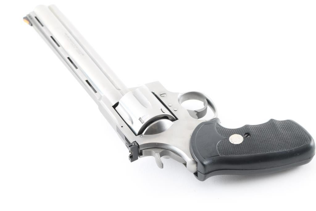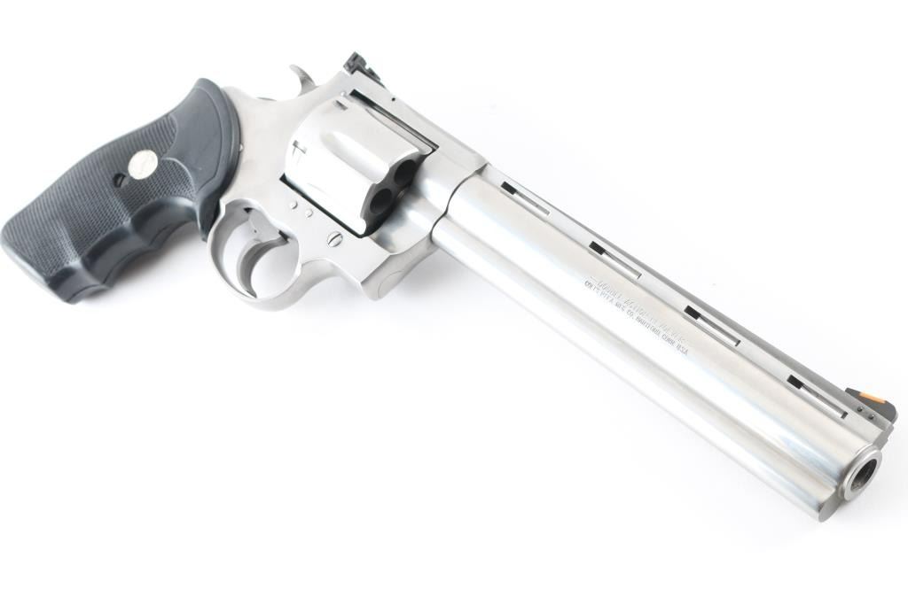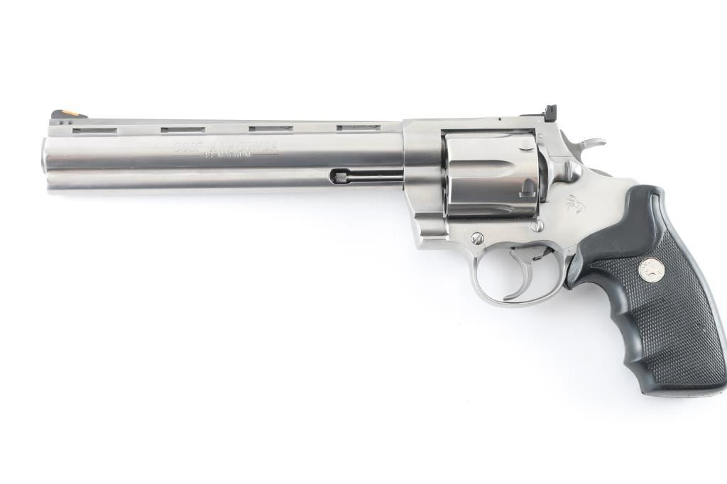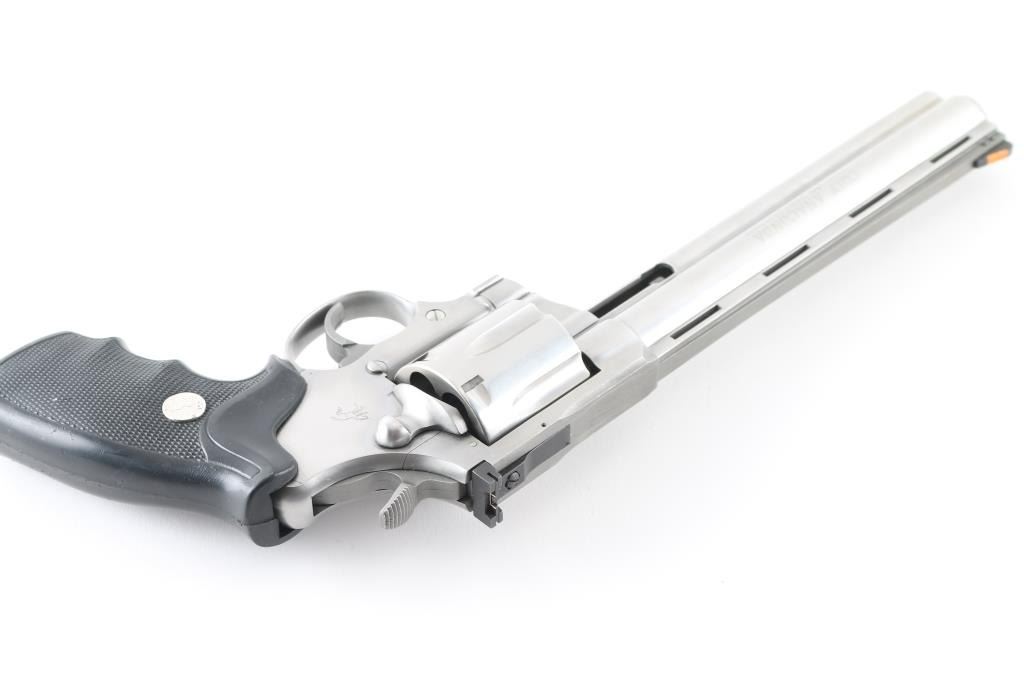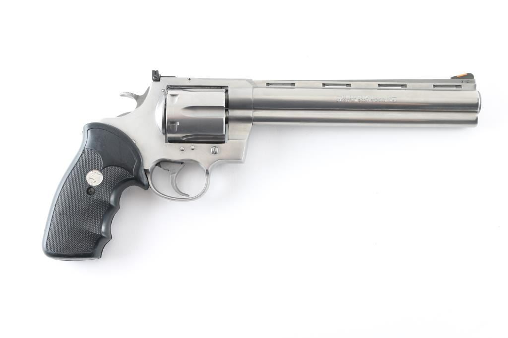 Premium large frame stainless steel double action revolver chambered in .44 Magnum, manufactured circa 1992. Features a bright polish finish, 8" vent ribbed barrel with full underlug, pinned ramp front sight with orange insert, fully adjustable rear sight with white outlined square notch, fluted six-shot cylinder, partially serrated wide trigger, flat top frame, serrated wide hammer spur and one-piece checkered black rubber wrap-around finger groove grip with silver Colt medallions. Revolver exhibits a light drag line on the cylinder and only minor handling marks/scratches. Action is super smooth with very good lock-up, the bore is pristine, and the rubber grips are very good. NRA Condition-Near Excellent. Modern firearm