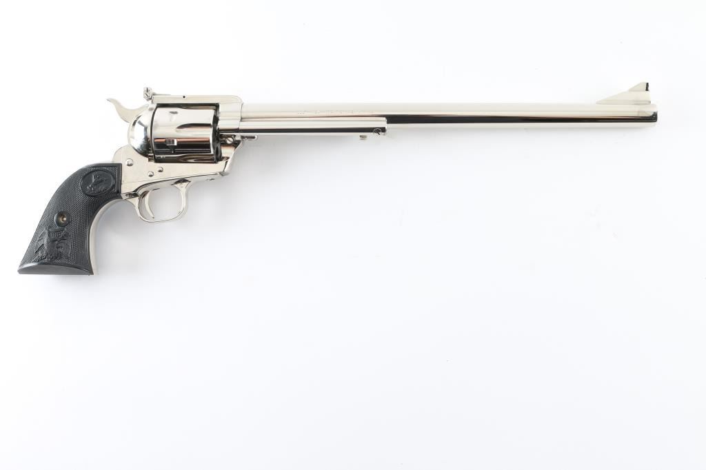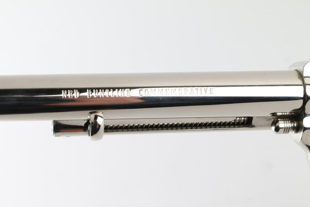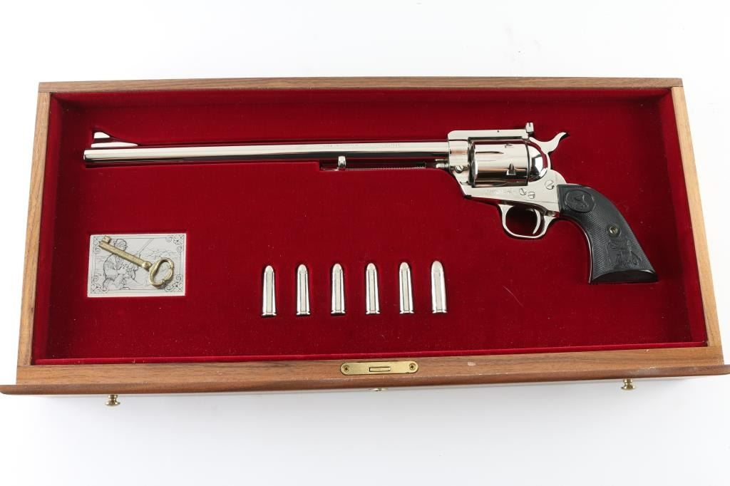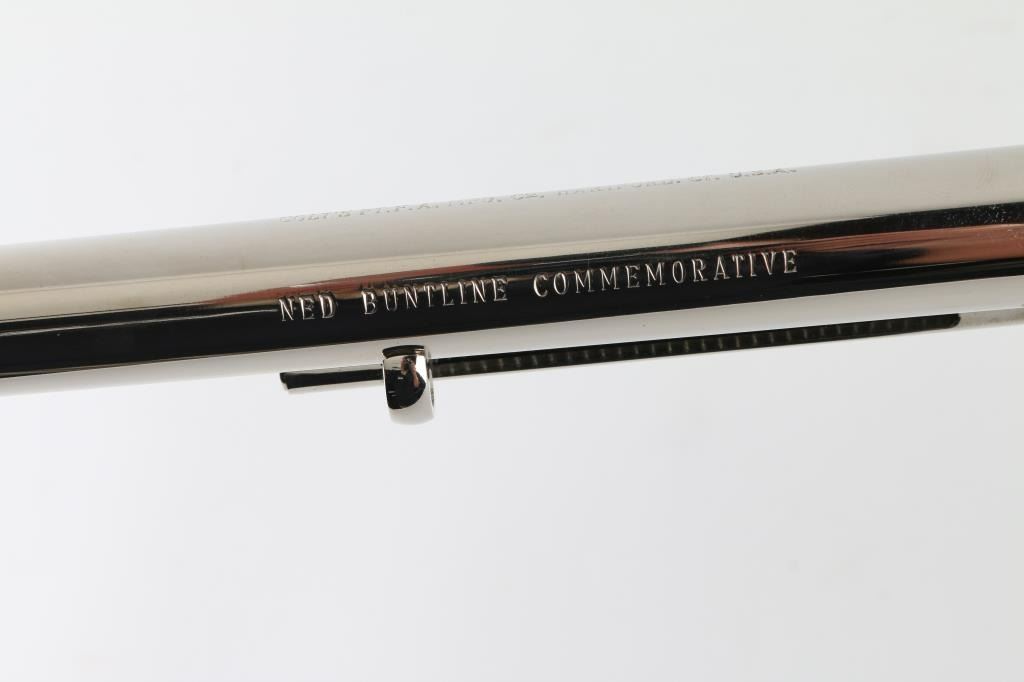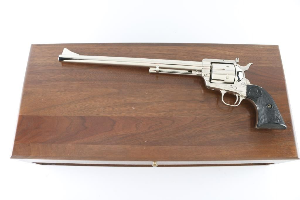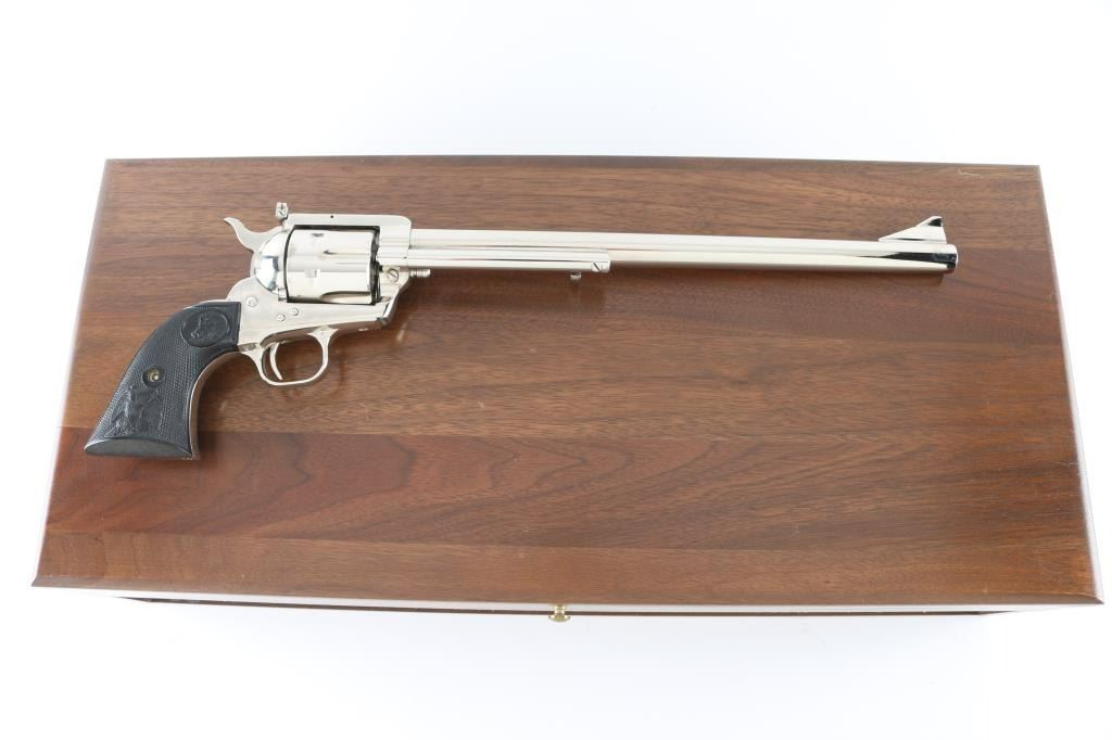 'Ned Buntline Commemorative'. One of only 3000 manufactured circa 1979. Features 12" barrel, adjustable rear sight, nickel finish, checkered black "eagle" grips. Left side of barrel is marked "NED BUNTLINE COMMEMORATIVE". Comes in a fitted maroon velvet lined pull-out drawer in a wood jewelry case, with hinged lid that reveals the revolver and accessories under a glass lid. Includes six dummy cartridges and an engraved plaque bearing the likeness of Ned Buntline. Revolver is in very good or better condition, with visible blemish to nickel finish on a small spot on cylinder. Dummy cartridges show some finish blemishes and losses. Includes key for case. Condition is NRA Very Good+ *** Modern Firearm ***