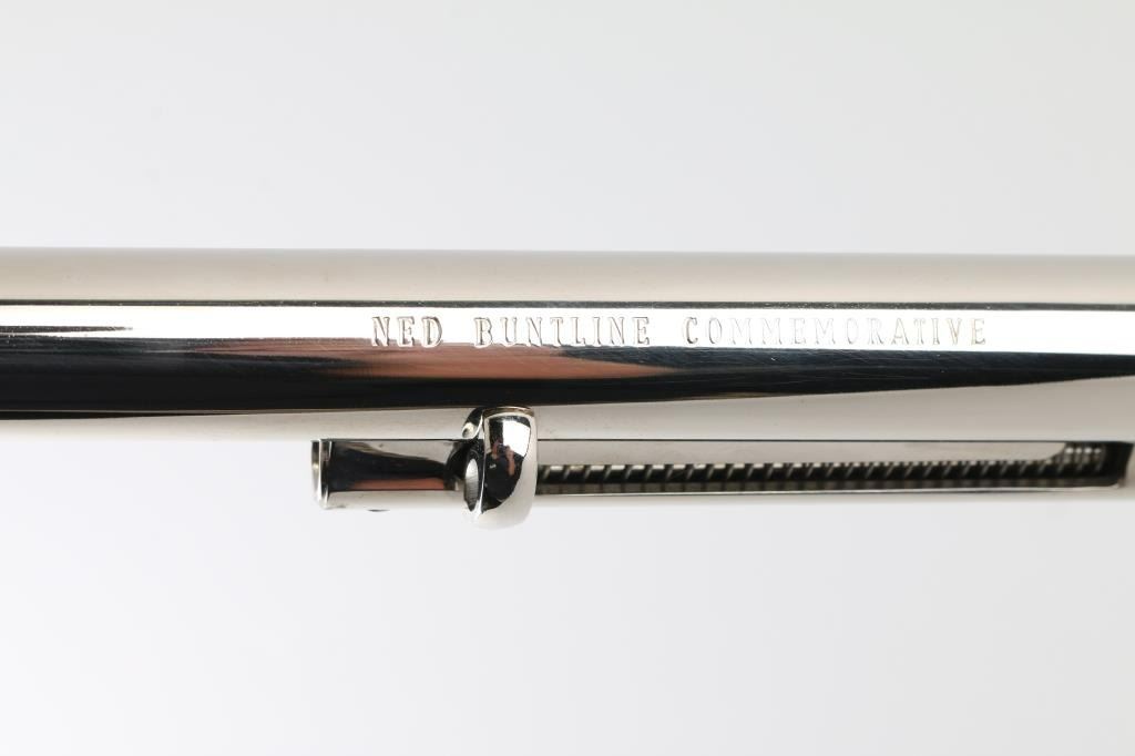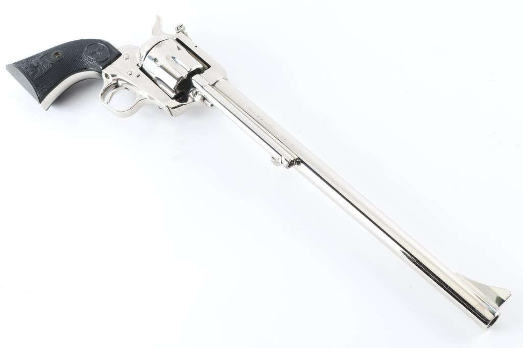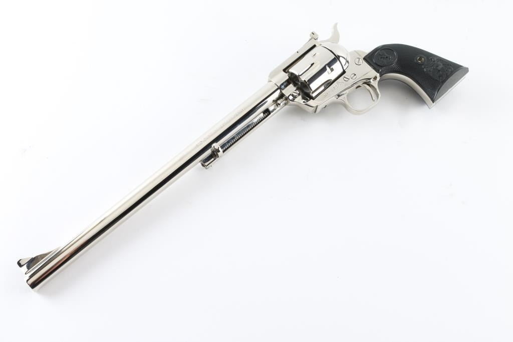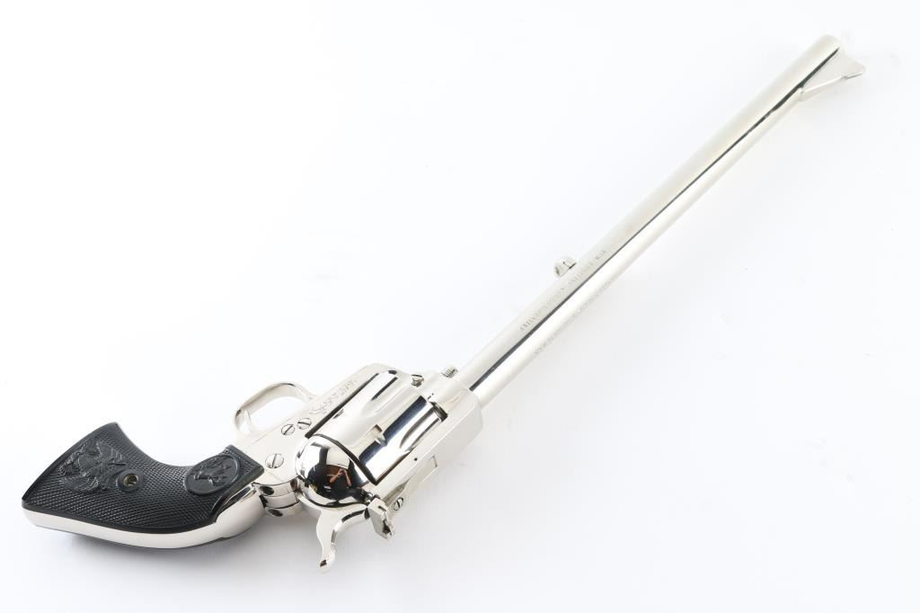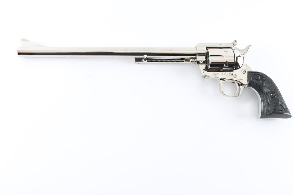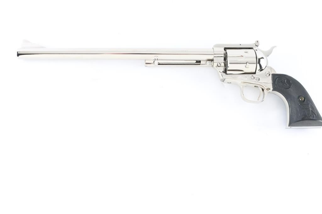 'Ned Buntline Commemorative'. One of only 3000 manufactured circa 1979. Features 12" barrel, adjustable rear sight, nickel finish, checkered black "eagle" grips. Left side of barrel is marked "NED BUNTLINE COMMEMORATIVE". Comes in a fitted maroon velvet lined pull-out drawer in a wood jewelry case, with hinged lid that reveals the revolver and accessories under a glass lid. Includes six dummy cartridges and an engraved plaque bearing the likeness of Ned Buntline. Revolver is in very good or better condition, with visible blemish to nickel finish on a small spot on cylinder. Dummy cartridges show some finish blemishes and losses. Includes key for case. Condition is NRA Very Good+ *** Modern Firearm ***