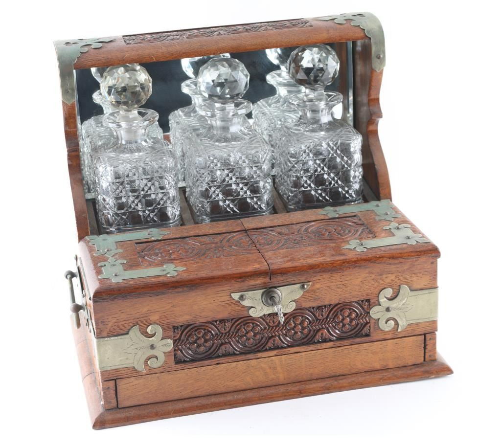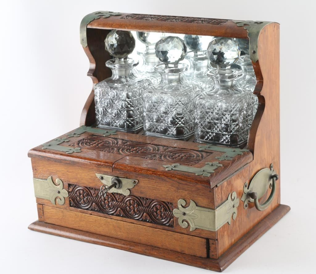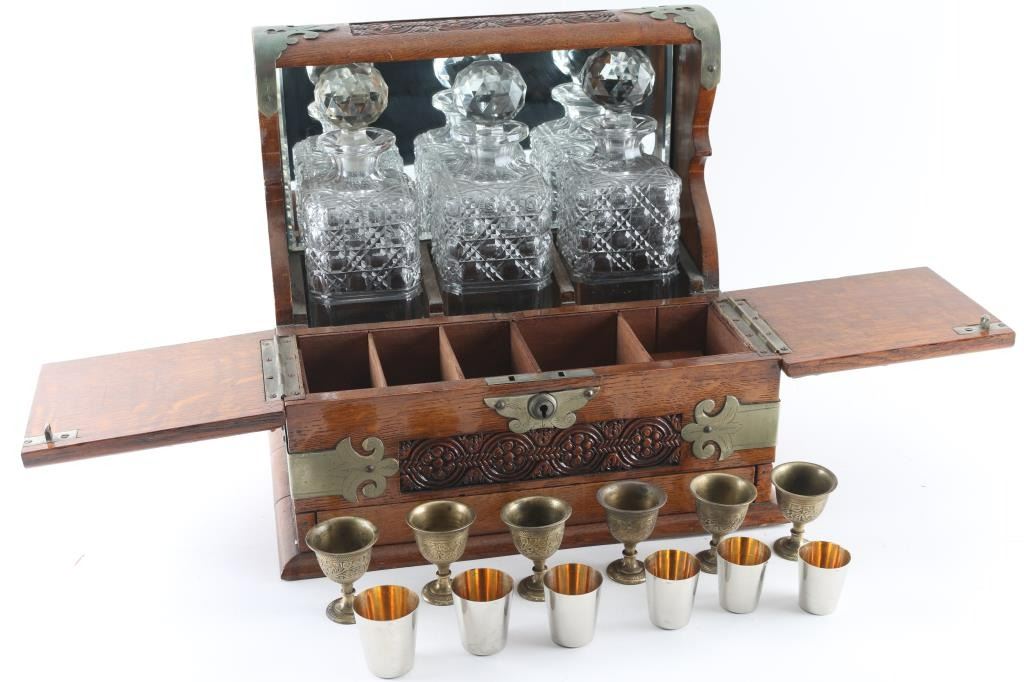 Beautiful quarter sawn oak mini bar with 3 glass decanters and 6 brass goblets, circa 1880's, it has a secret door that can be accessed by pushing a button behind the middle decanter, engraved hardware. In beautiful condition.