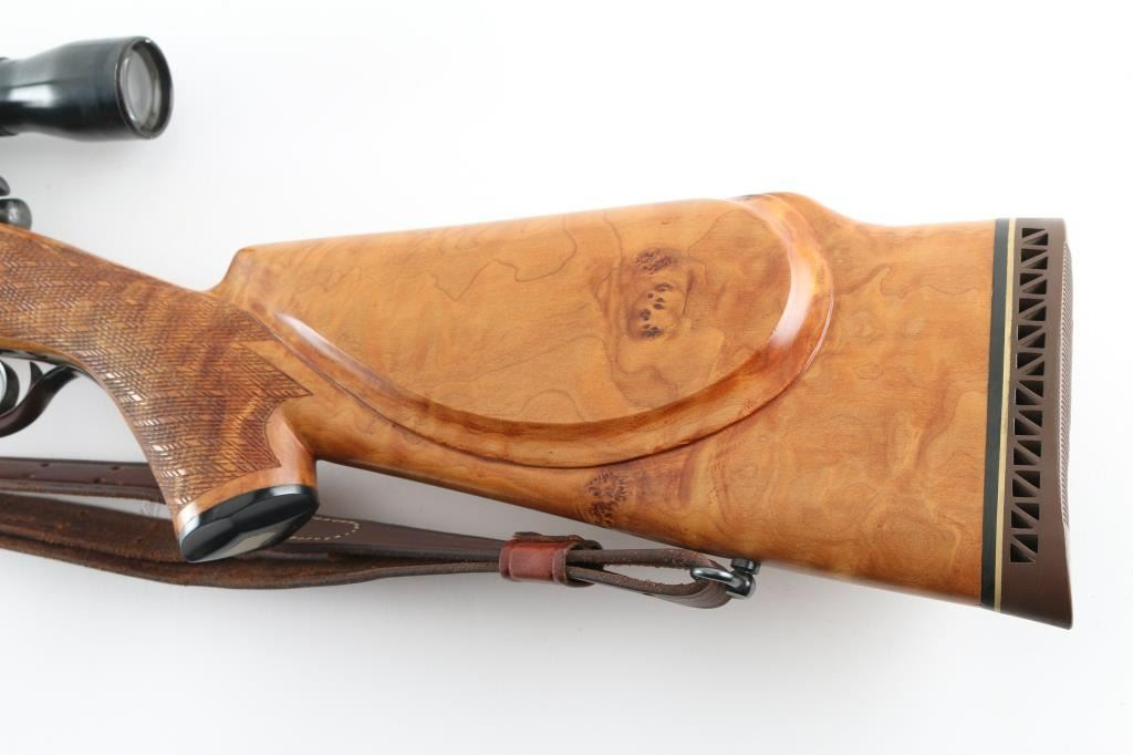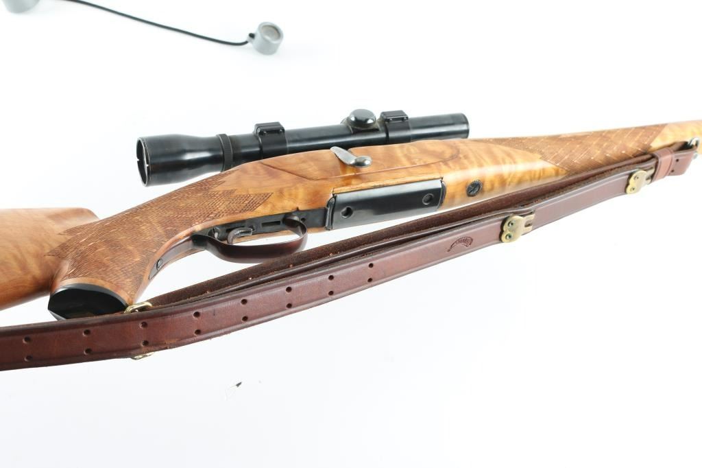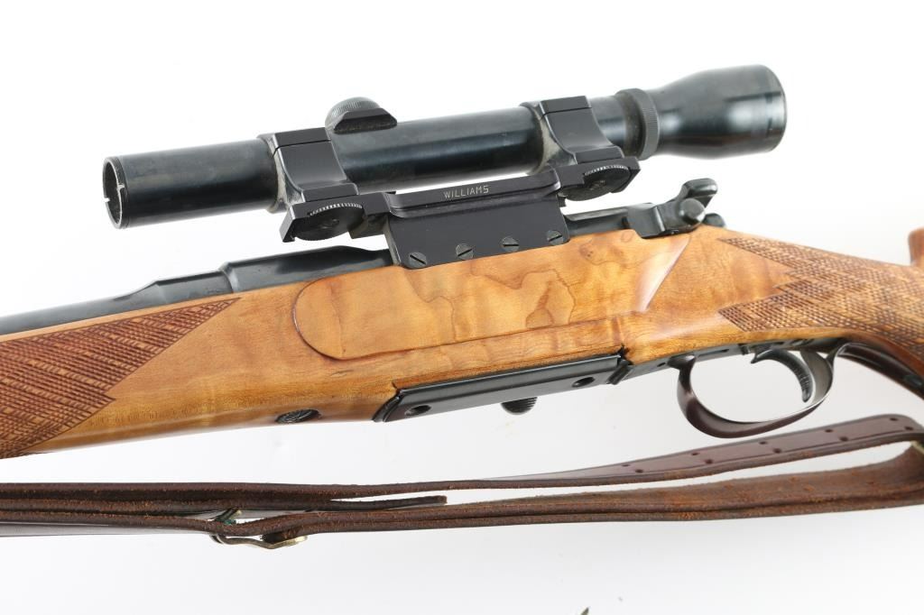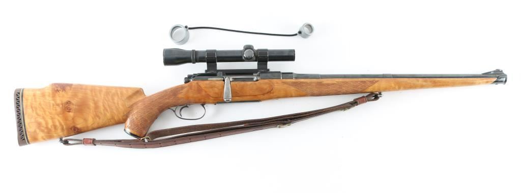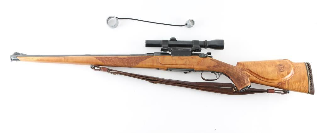 SN: 12773 Austrian bolt action rifle features European styled stock with full length Mannlicher forend & steel muzzle cap, approx 20" barrel, ramp front sight base with dovetailed blade, fixed rotary magazine, "butter knife" bolt handle, serrated trigger, manual safeties at tang and bolt rear, sling swivels, Williams side mount with rings, Weaver K3 60-B scope (fine crosshair, clear view). Stock appears to be a dark maple wood with golden highlights, flame figure, several knot in butt, checkered panels at wrist and forend, ventilated rubber recoil pad, plastic grip cap, right hand cheekpiece with shadow line. LOP 13-3/8", 12.5" to end of wood. Bore is very good condition. Retains 90% dark blue with minor blemishes & edge losses. Some lettering is very lightly dished out, and triggerguard shows a plum tint with hardly any edge wear, indicating a re-blue at some point. Stock is very good to excellent condition. Recoil pad is a bit hard. Includes double hook leather sling. Condition is near NRA Excellent (possible re-blue) *** C&R Firearm ***