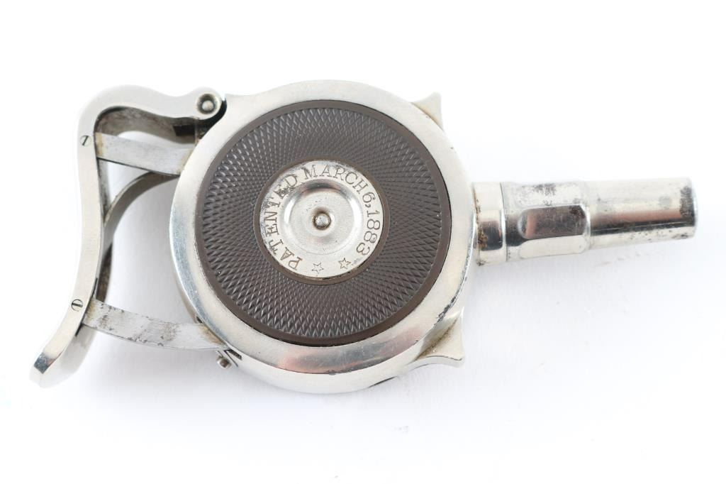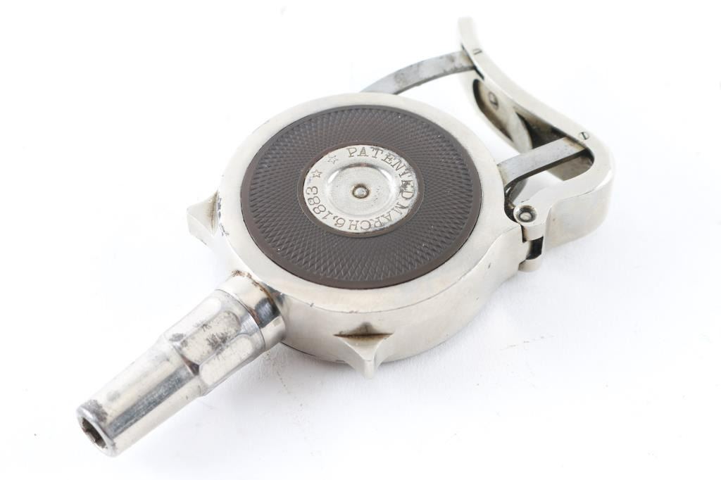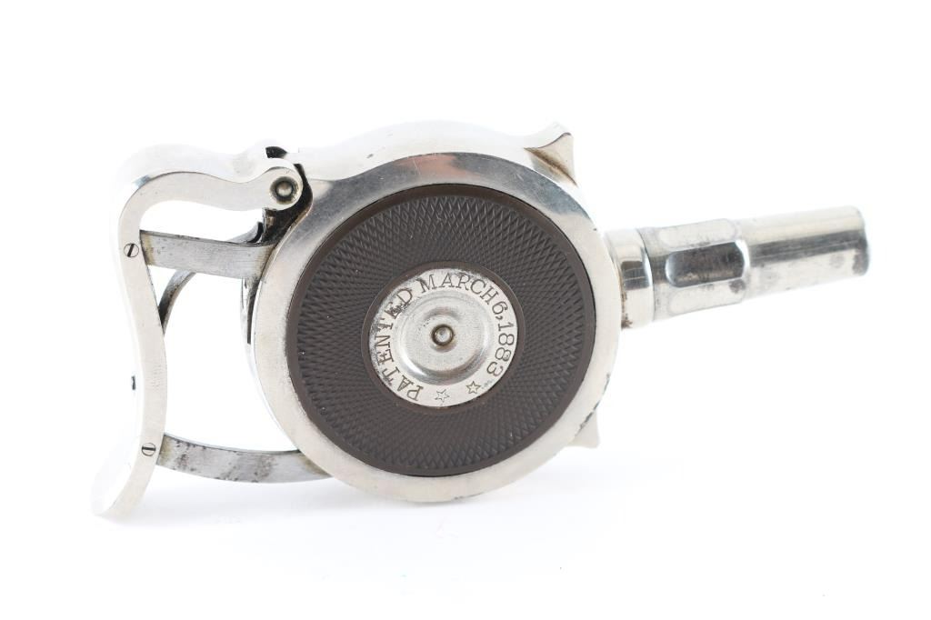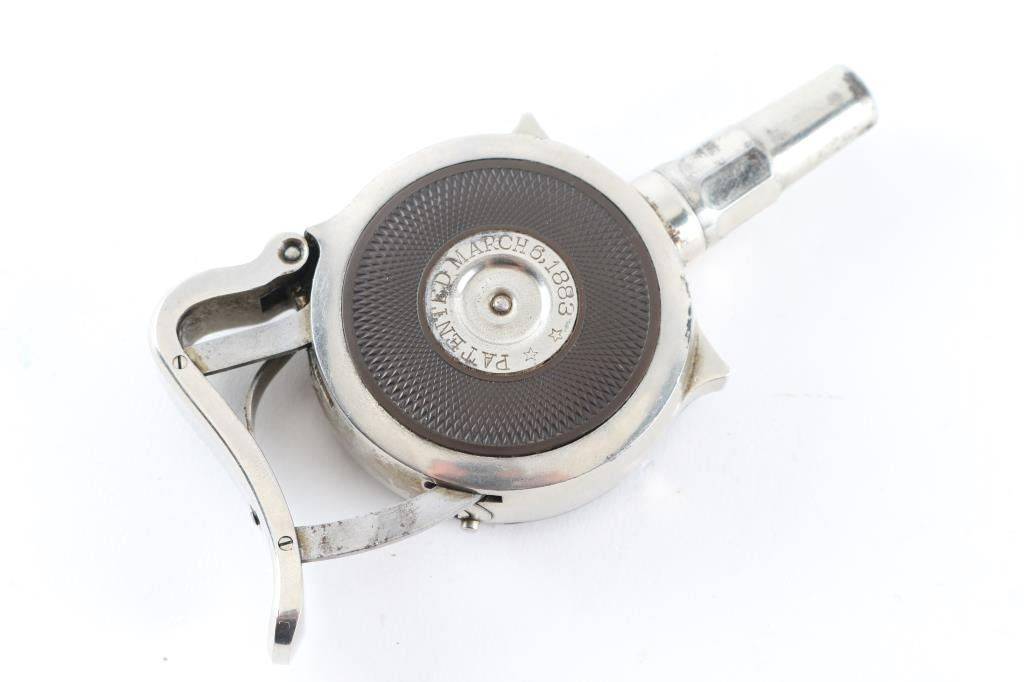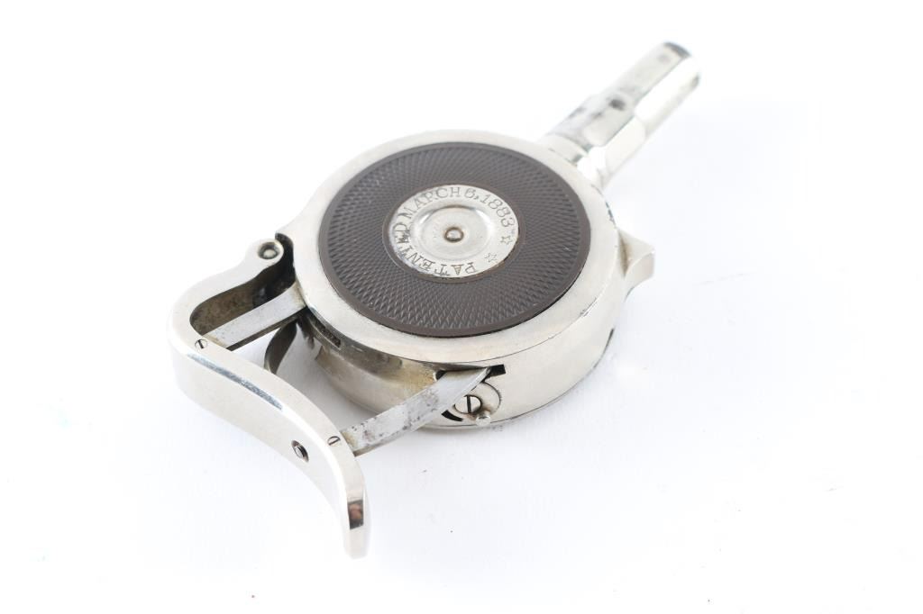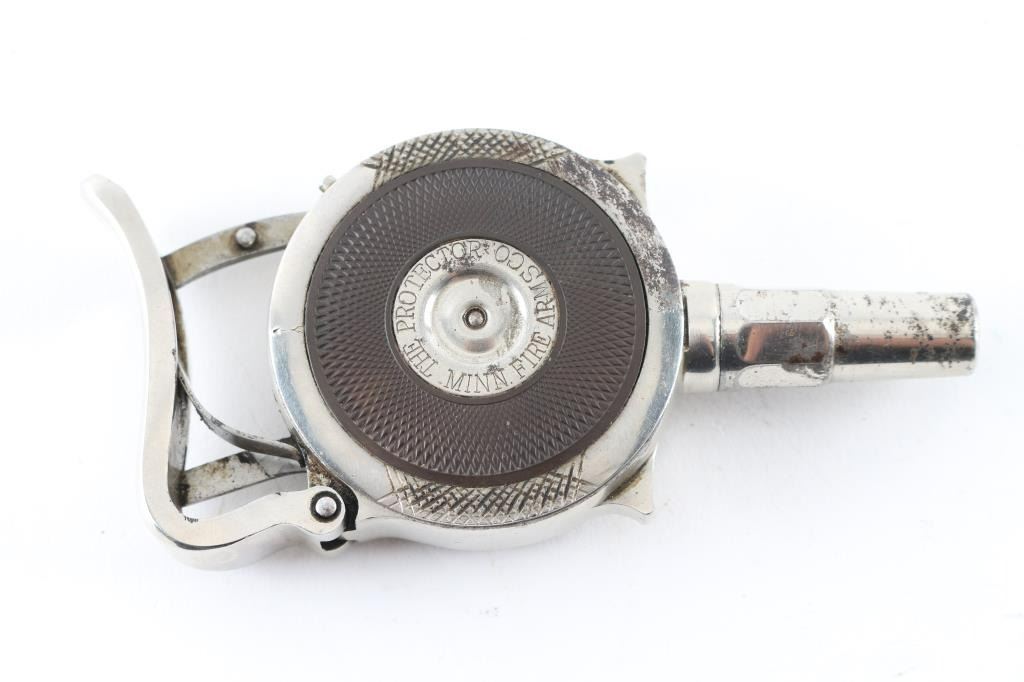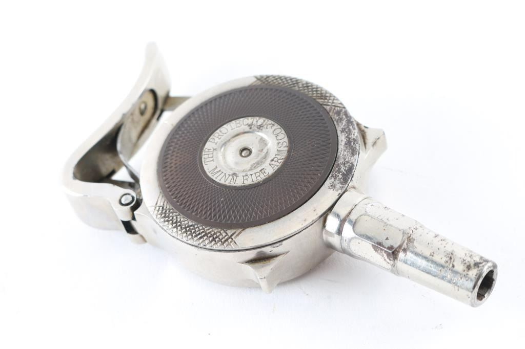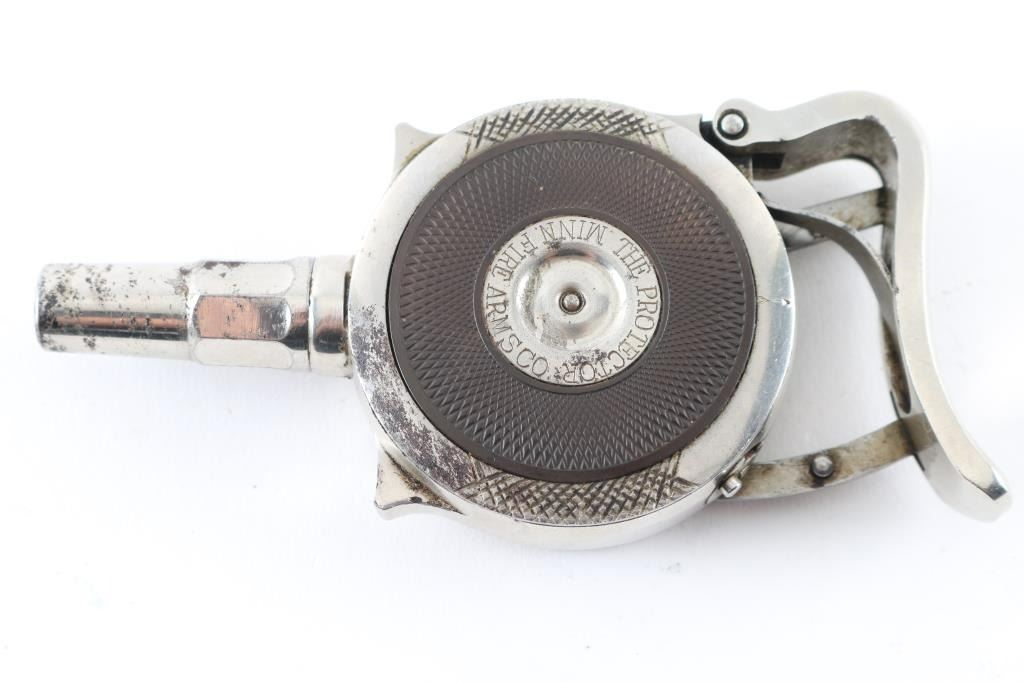 SN: 2518 Early French made radial cylinder palm pistol made during the early 1890's, with 1-3/4" octagonal barrel. Nickel finish, with hard rubber side grips, no sights, rests in palm of hand and squeeze to operate. Side plate marked "The Protector", and "Minn. Firearms Co." , and "Patented March 6, 1883" Bore is good and action seems to operate very well. Matching serial numbers on the revolving turret, and removable side plate.. Bore is very good with strong rifling. Nickel finish is about 85% with minor flaking, and some scattered spots of pitting. Really nice condition for this pistol. NRA Condition-Fine. Antique Firearm.